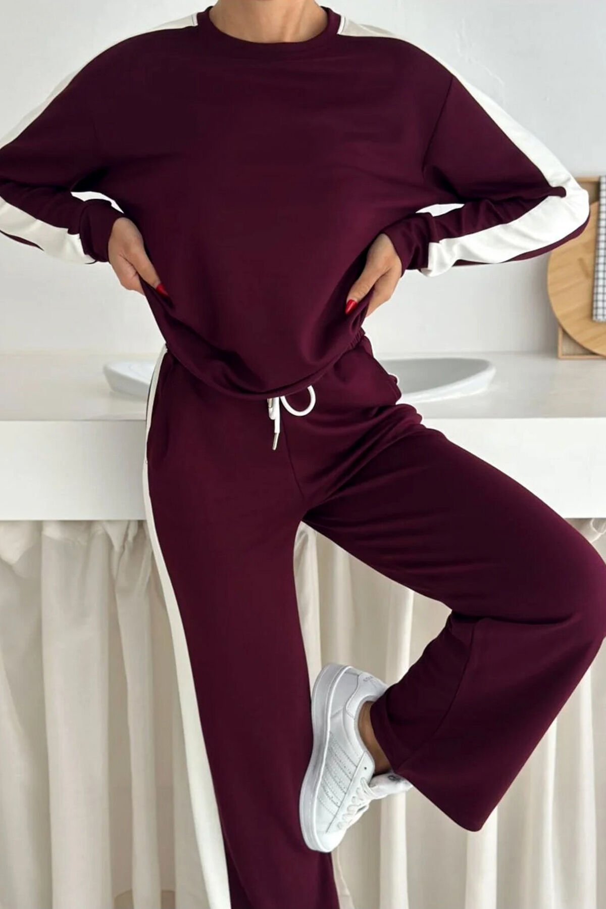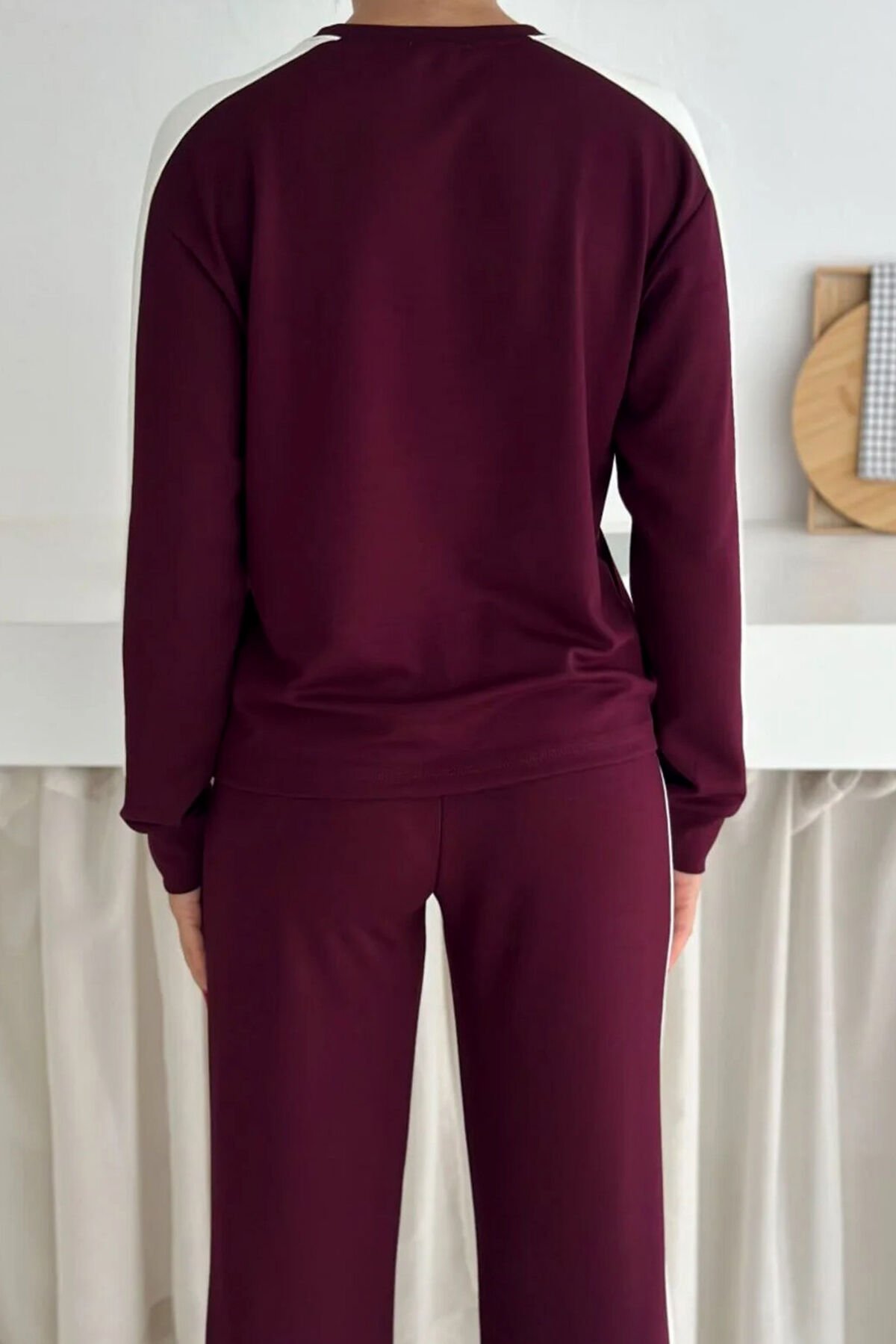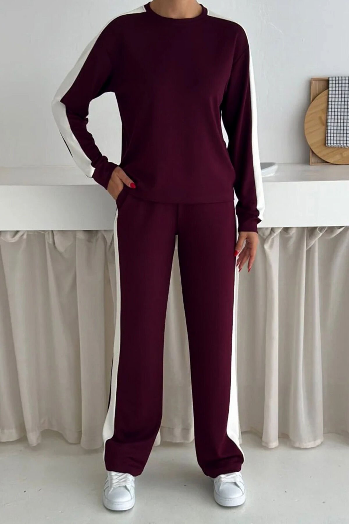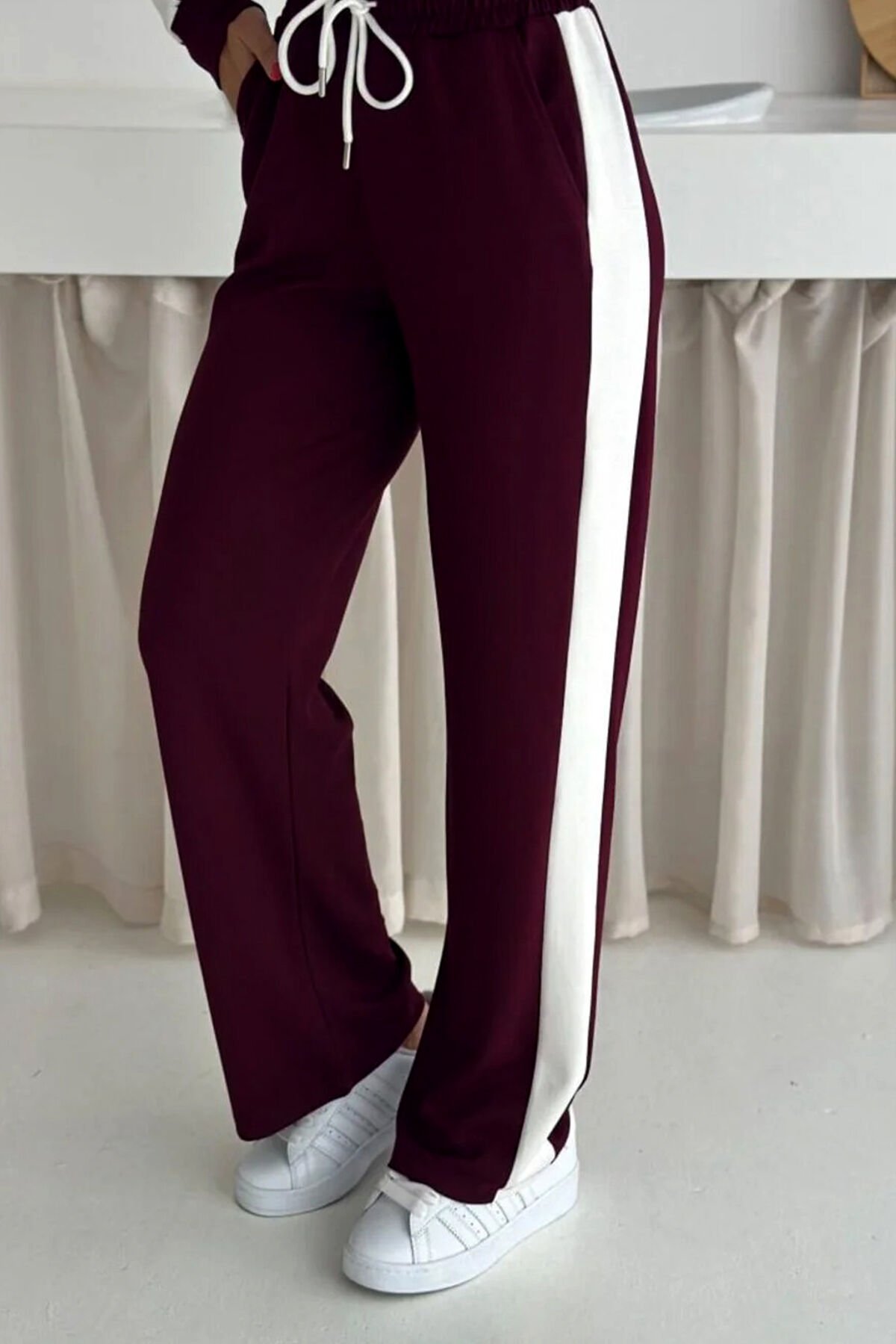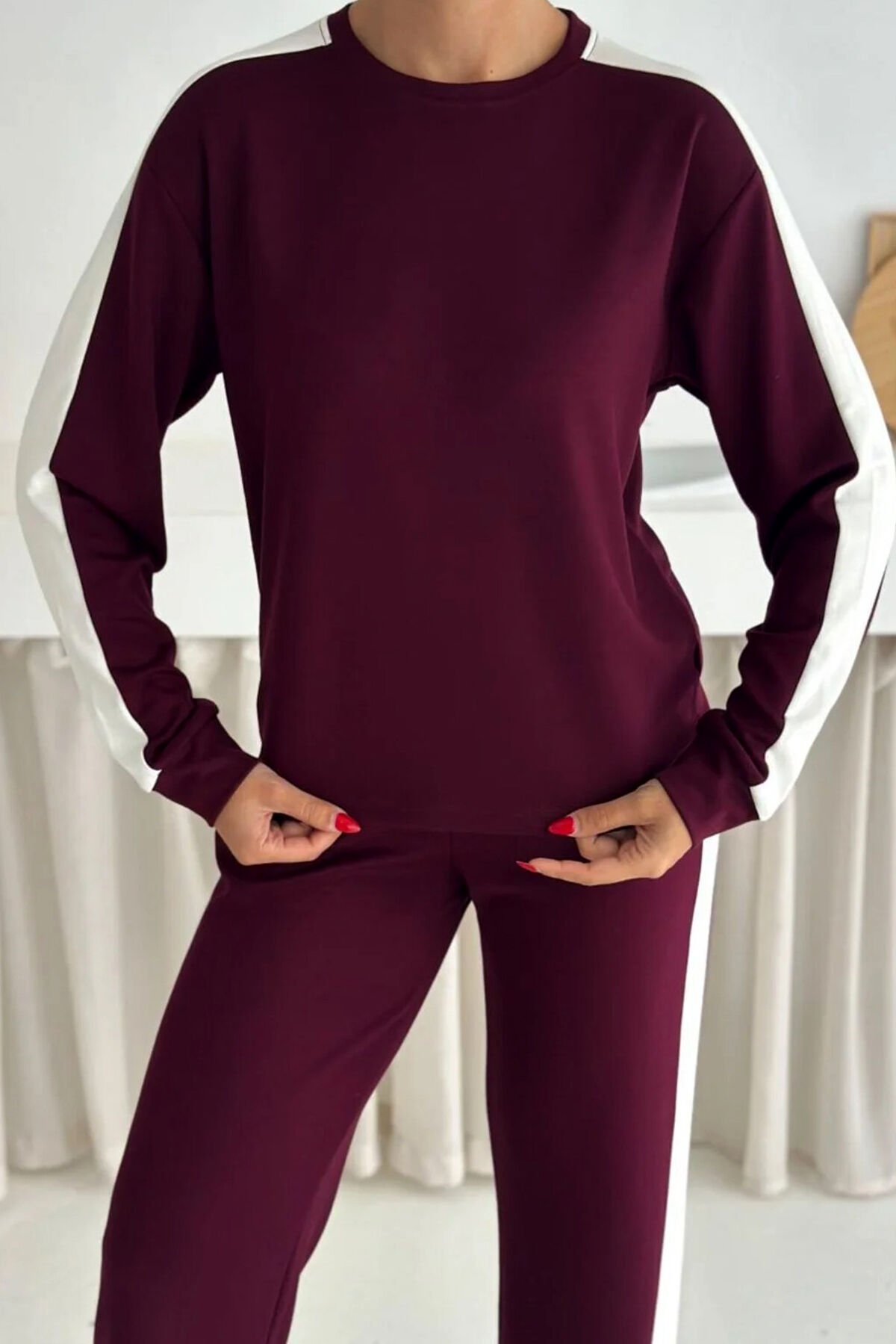 Kadın Yanları Beyaz Şeritli Hafif Likralı ve Esnek Modal Eşofman Takımı 2577 S - BORDO