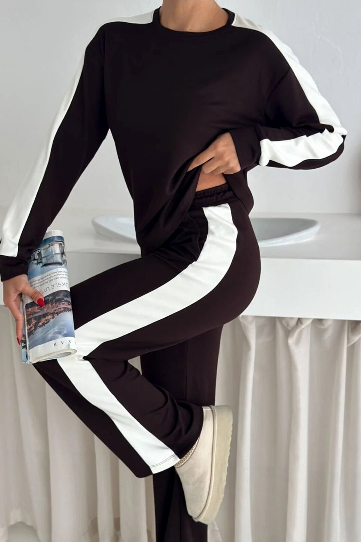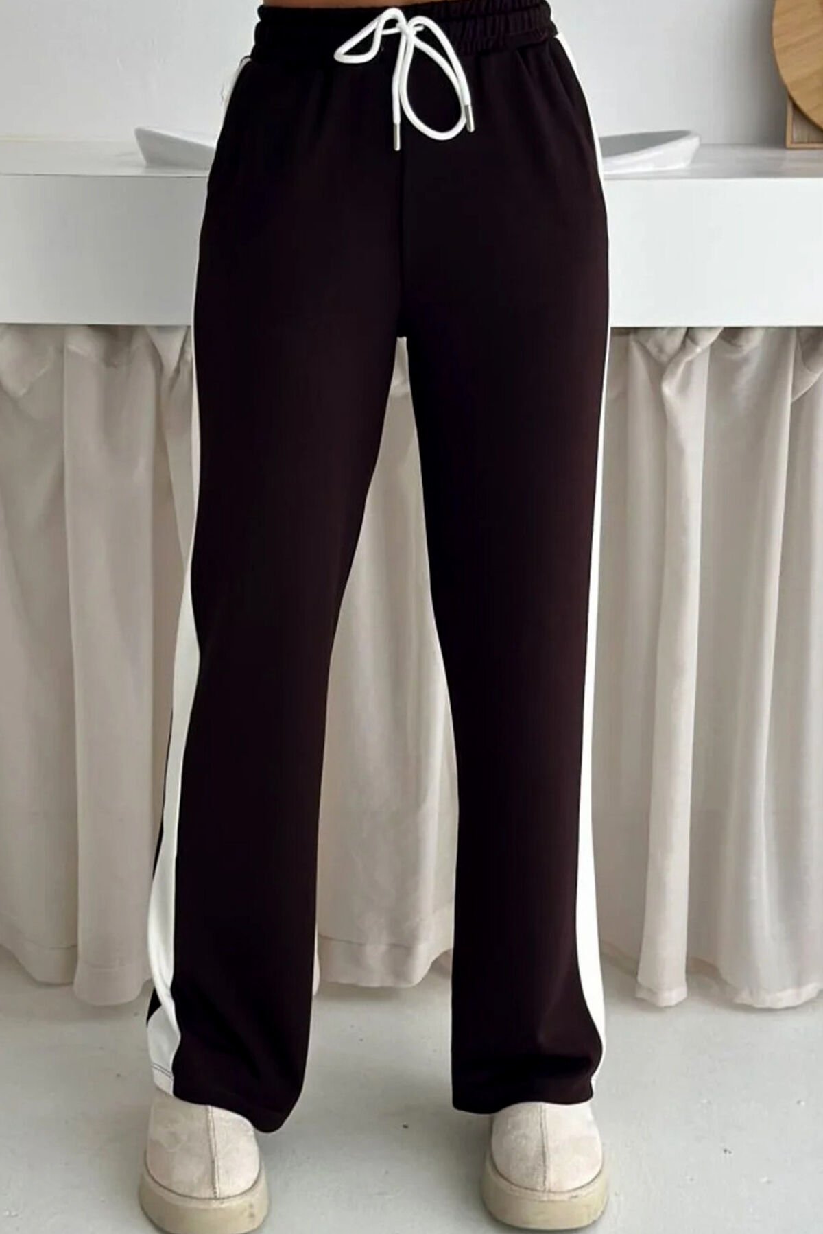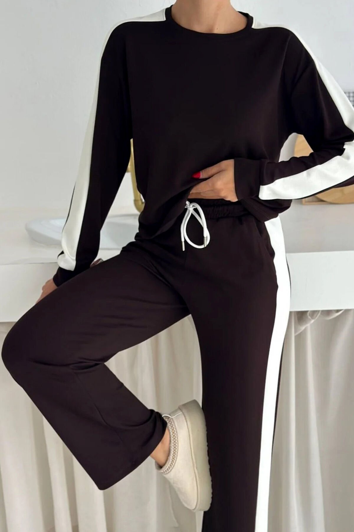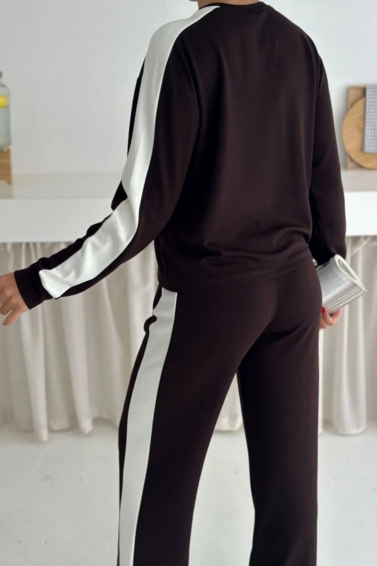 Kadın Yanları Beyaz Şeritli Hafif Likralı ve Esnek Modal Eşofman Takımı 2577 S - KAHVERENGİ