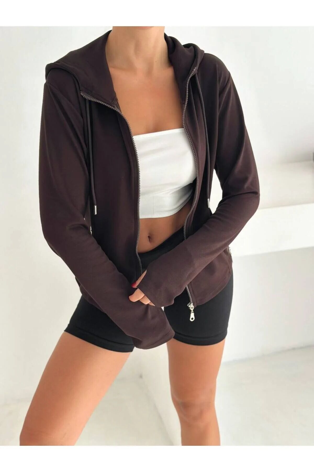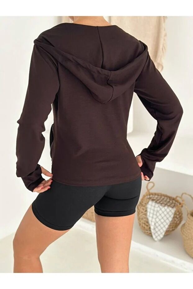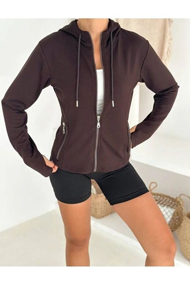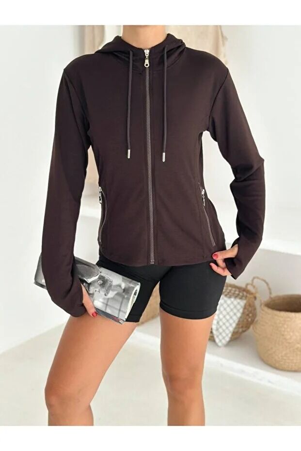 Kadın Fermuarlı Parmak Geçmeli Kapüşonlu Modal Kumaş Günlük Spor Ceket 2578 L - KAHVERENGİ