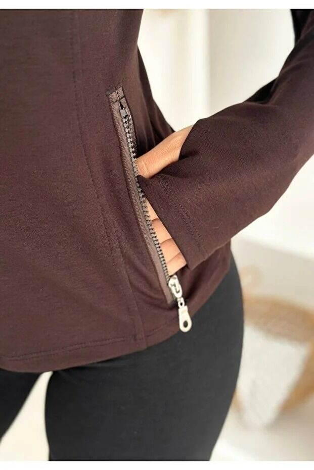 Kadın Fermuarlı Parmak Geçmeli Kapüşonlu Modal Kumaş Günlük Spor Ceket 2578 XL - KAHVERENGİ