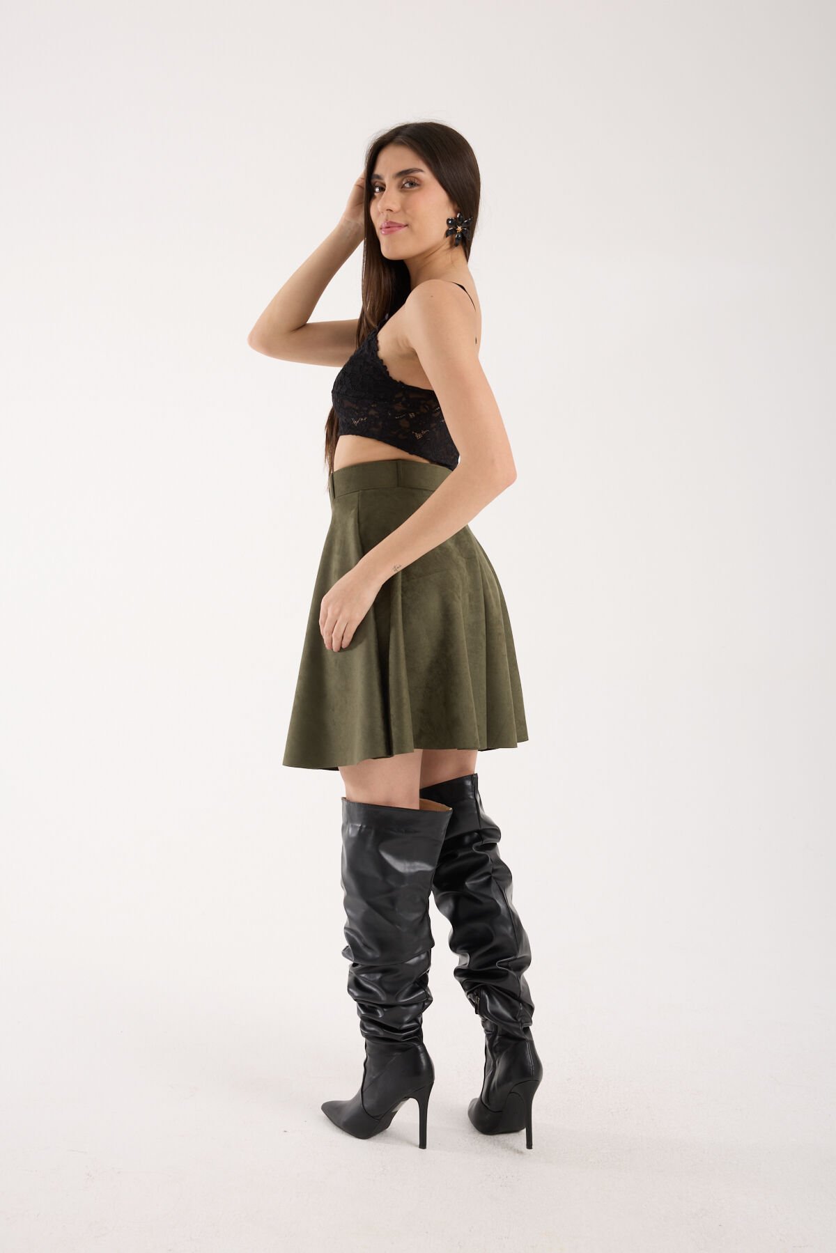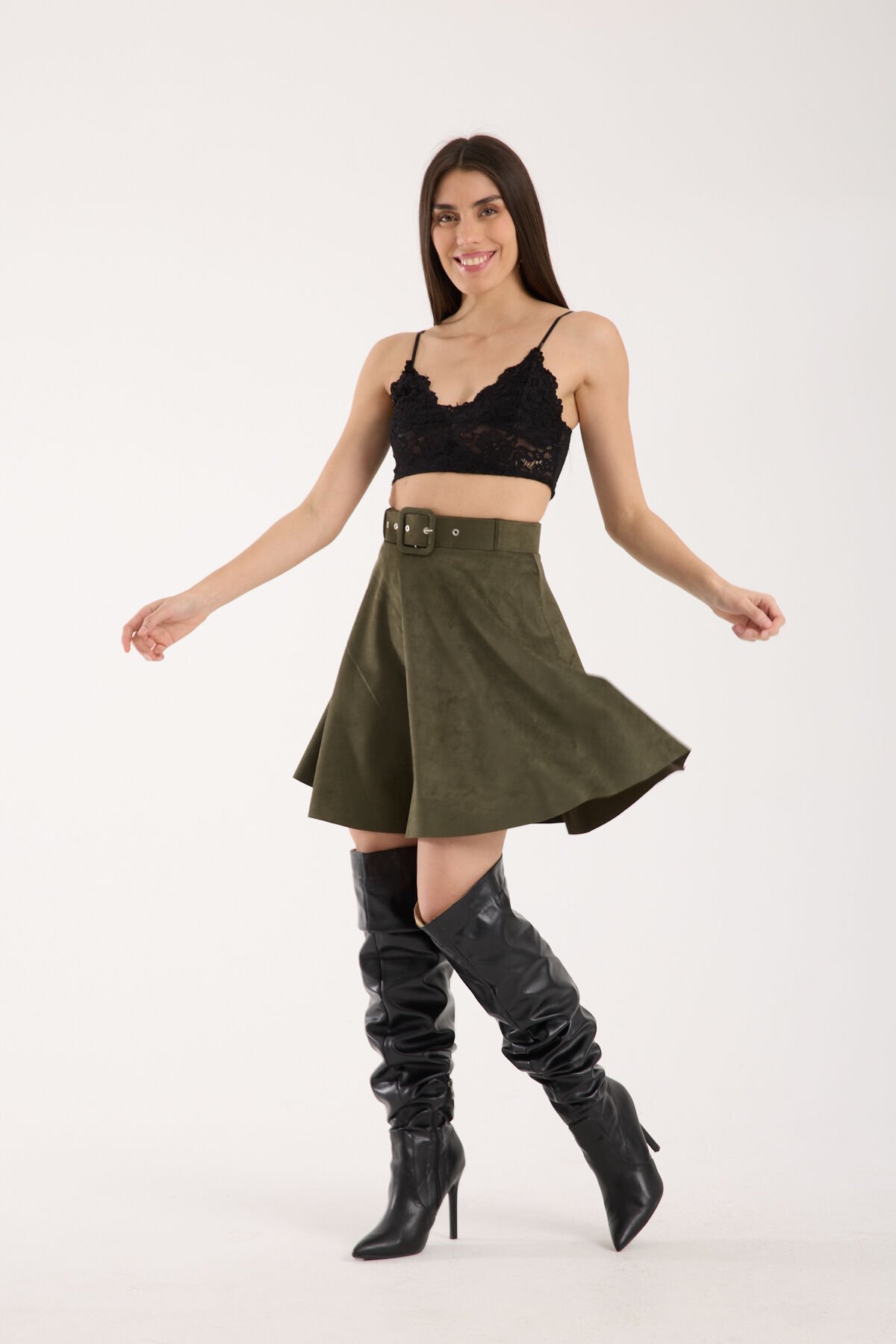 Kadın Kemerli Kloş Süet Etek 2423 XL - HAKİ