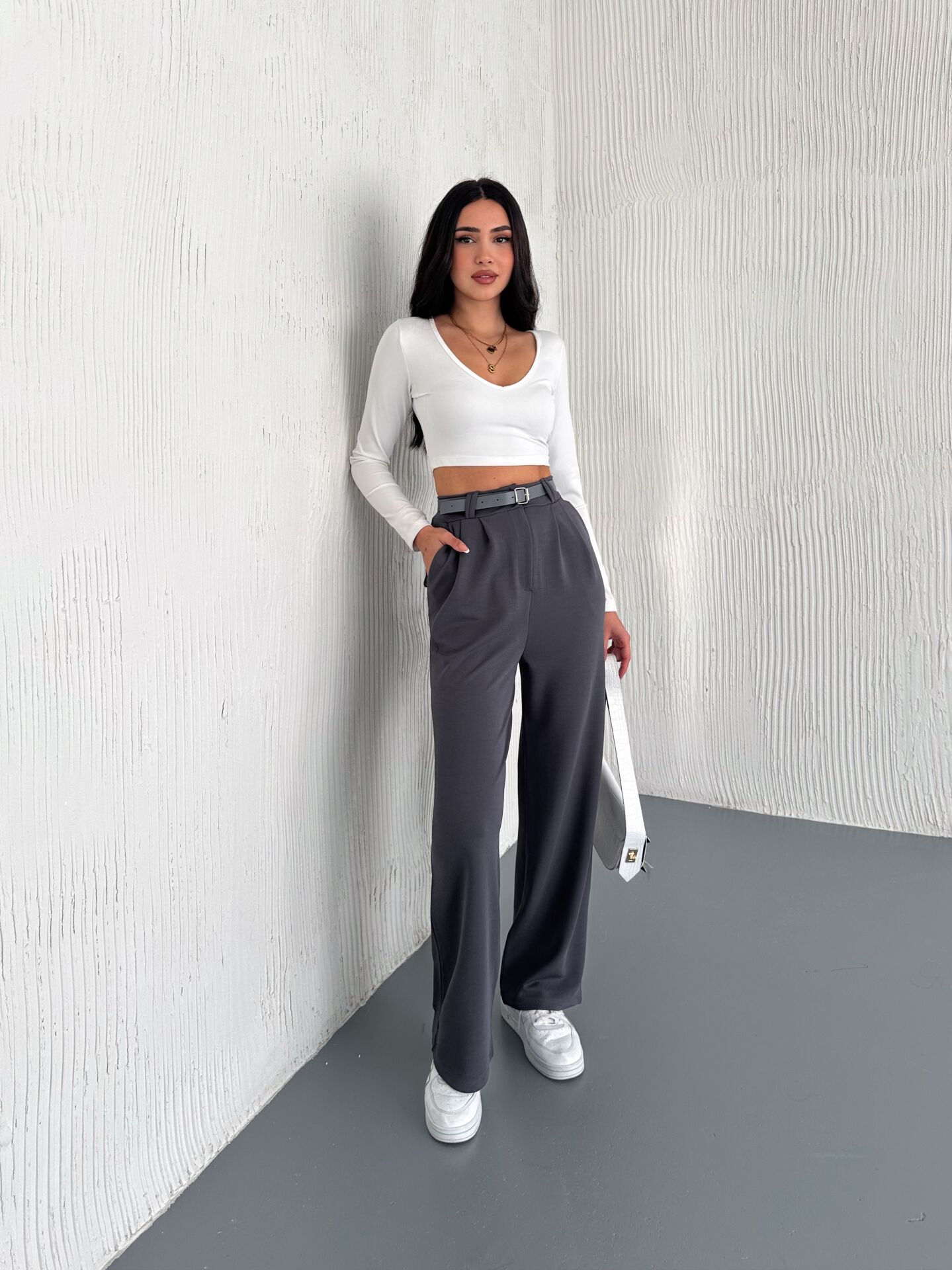 Kemerli ve ön pileli bürümcük kumaş pantolon, rahat kalıbı ve sofistike dokusu ile hem ofis stiline hem şehir hayatına uyum sağlayan premium bir parçadır. Yüksek bel tasarımı, bel hattını toparlarken bol paça wide leg siluet bacakları olduğundan daha uzun ve ince gösterir. Dobby (bürümcük) dokuma yüzey, pantolona lüks bir doku etkisi katarken aynı zamanda kırışmaya dayanıklı yapısıyla gün içinde formunu korur. %80 polyester %20 pamuk karışımı, hafiflik ve dayanıklılığı bir araya getirerek dört mevsim kullanıma uygun konfor sunar. Gri tonunun sakin şıklığı, tesettür kombinlerinden modern ofis stillerine kadar geniş bir alanda kullanılabilir. Gömlek, tunik, basic tişört veya blazer ceketlerle kolayca kombinlenebilen bu model, hem minimal hem iddialı görünmek isteyenler için ideal bir tercihtir. Çift cepli yapısı pratiklik sağlarken, kemer detayı ve ön pileler pantolona tasarım gücü kazandırır. Rahat kalıp, salaş duruş ve şehirli çizgi bir araya geldiğinde ortaya; dolabında “tek parça ile şık görünmek” isteyen kadınlar için vazgeçilmez bir pantolon çıkar.