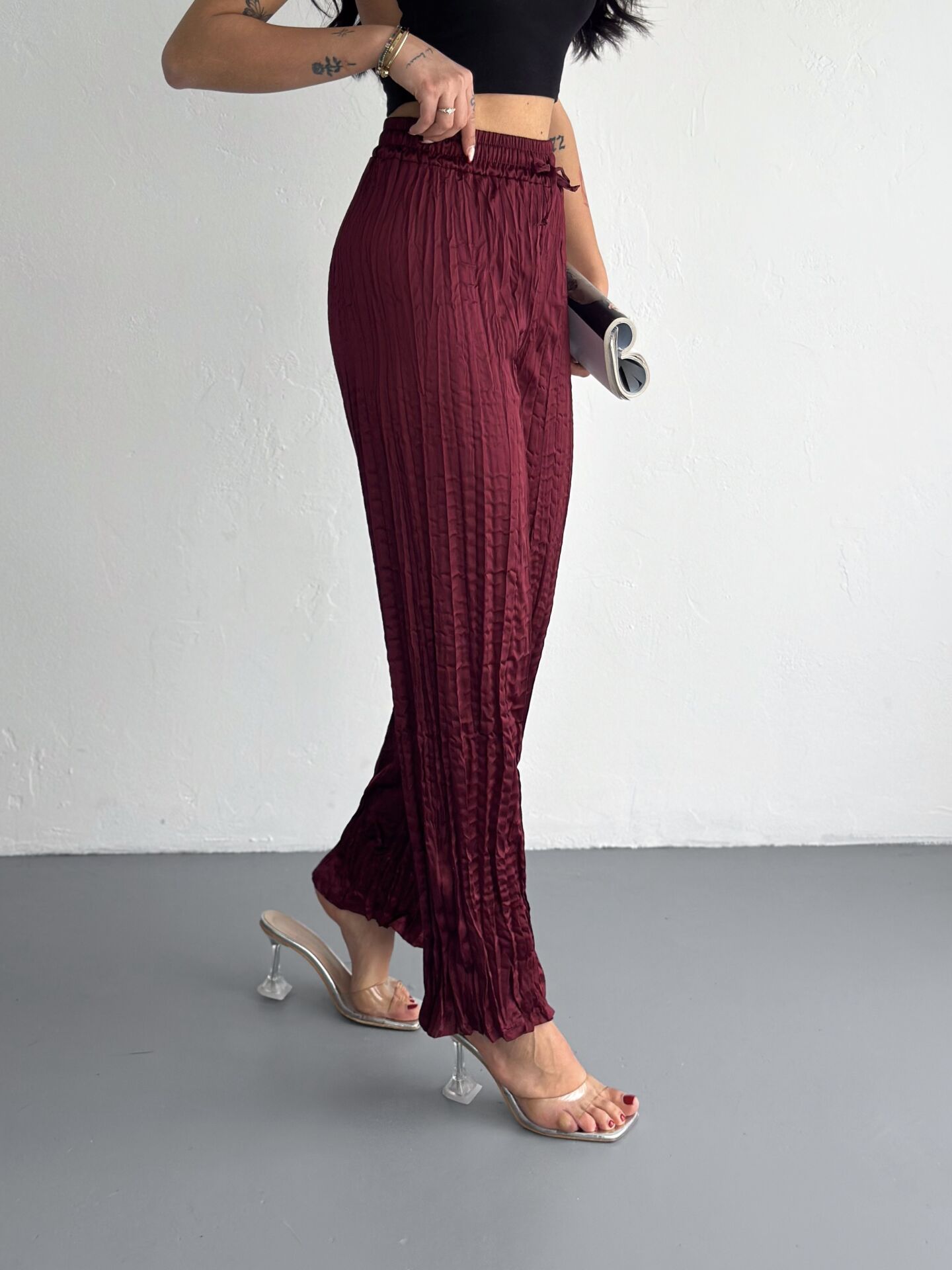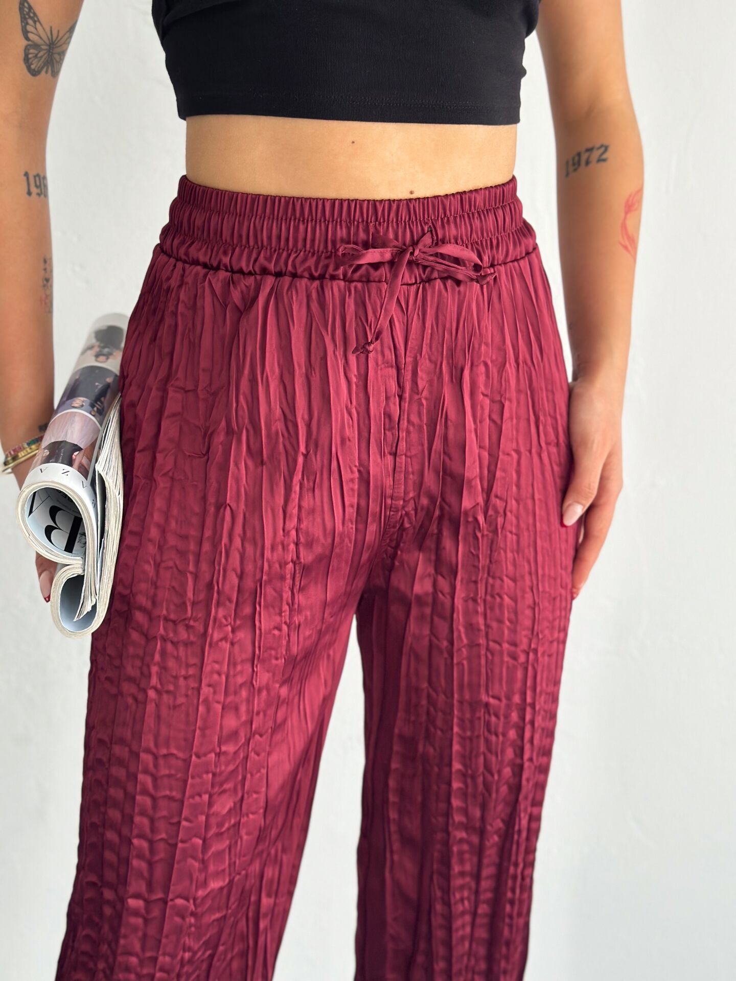 Kadın Günlük ve Spor Kırışık Saten Pantolon WM S - BORDO