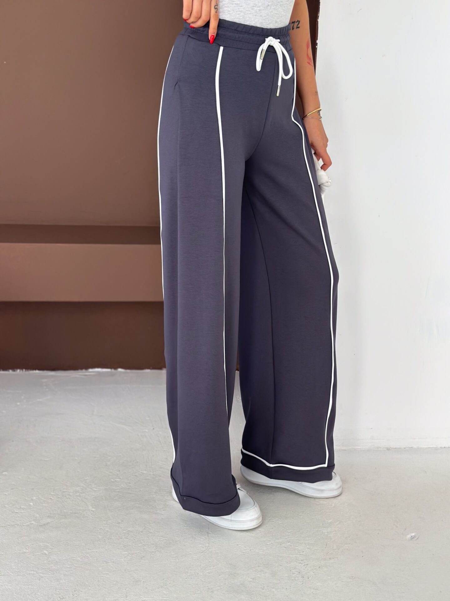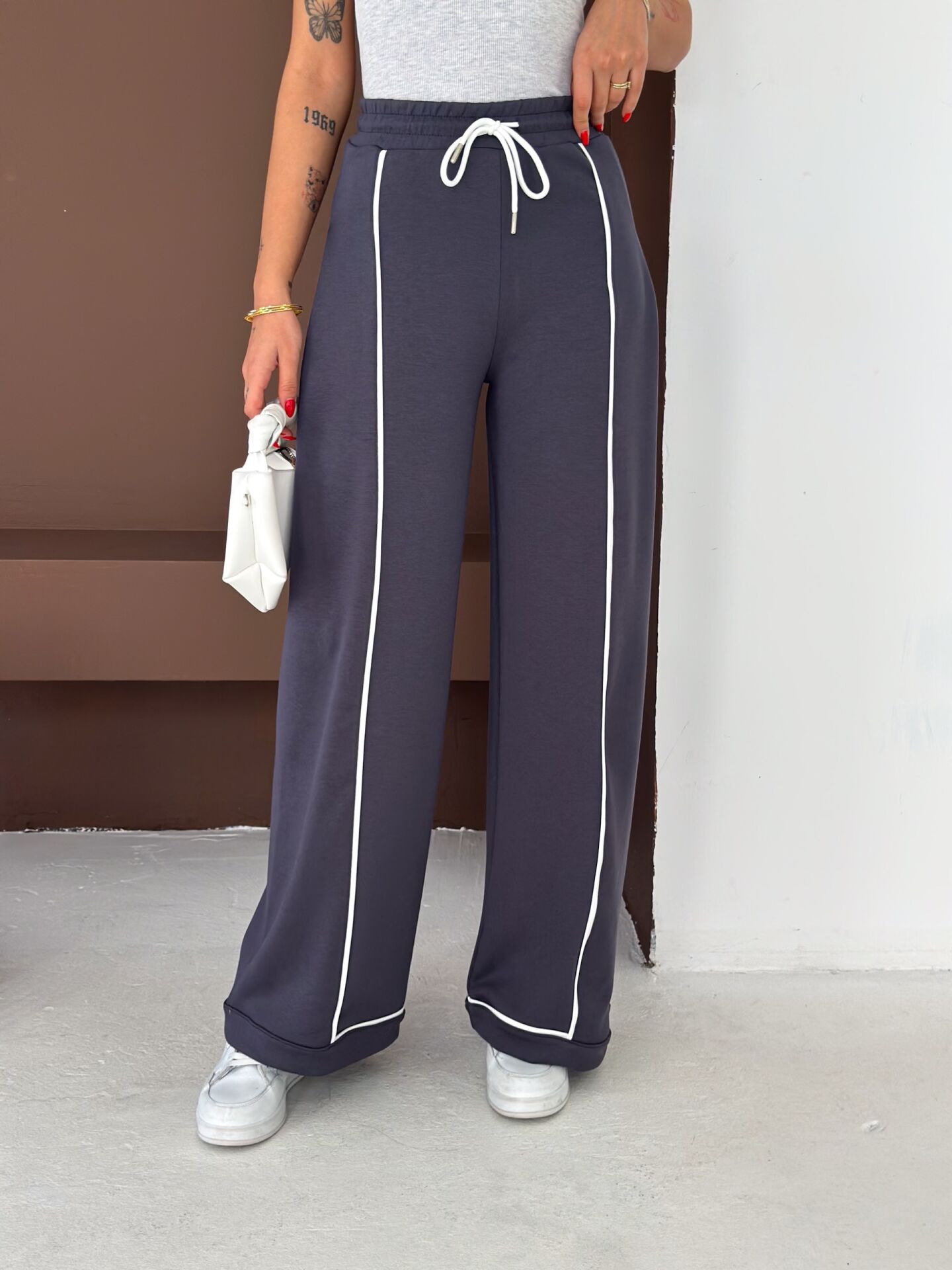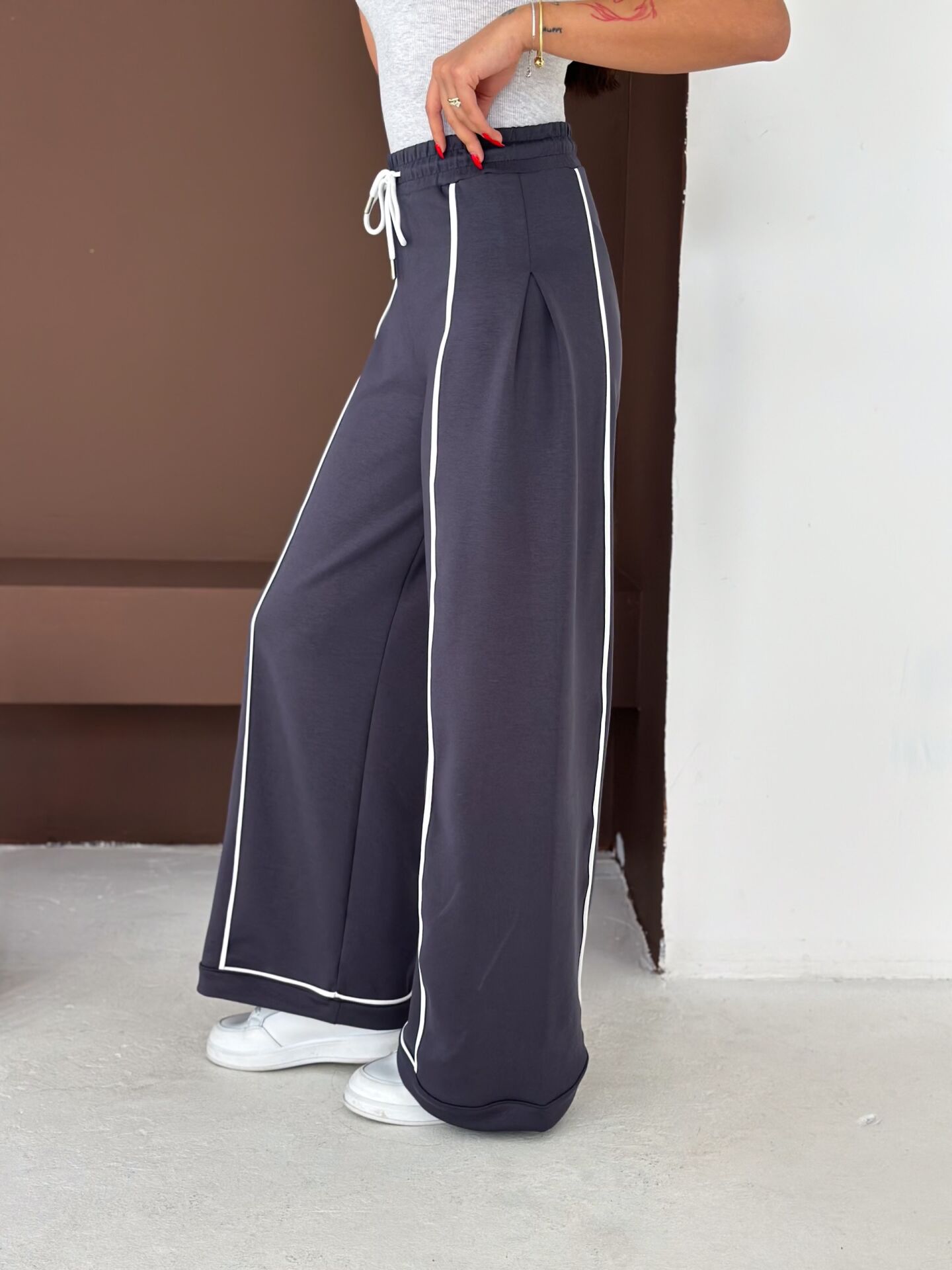 Geniş paça yapısı, baggy kalıbı ve yüksek bel formu ile hem konforu hem hareket özgürlüğünü artırır. Biyeli yan detayları modern bir görünüm kazandırırken düz dokuma yapısı ürünü dört mevsim kullanılabilir hale getirir.