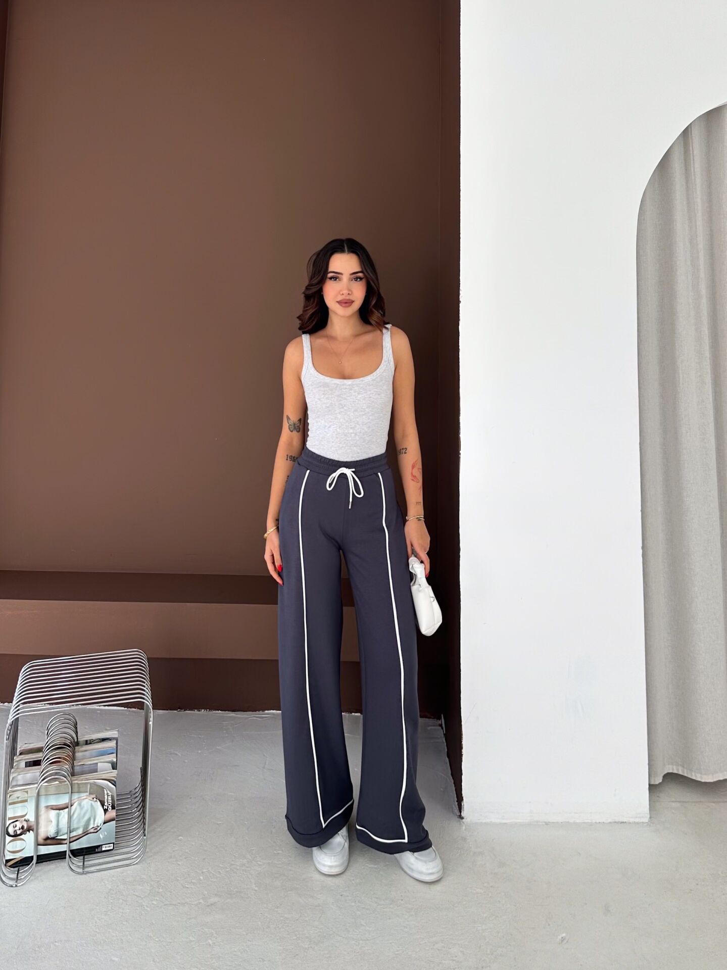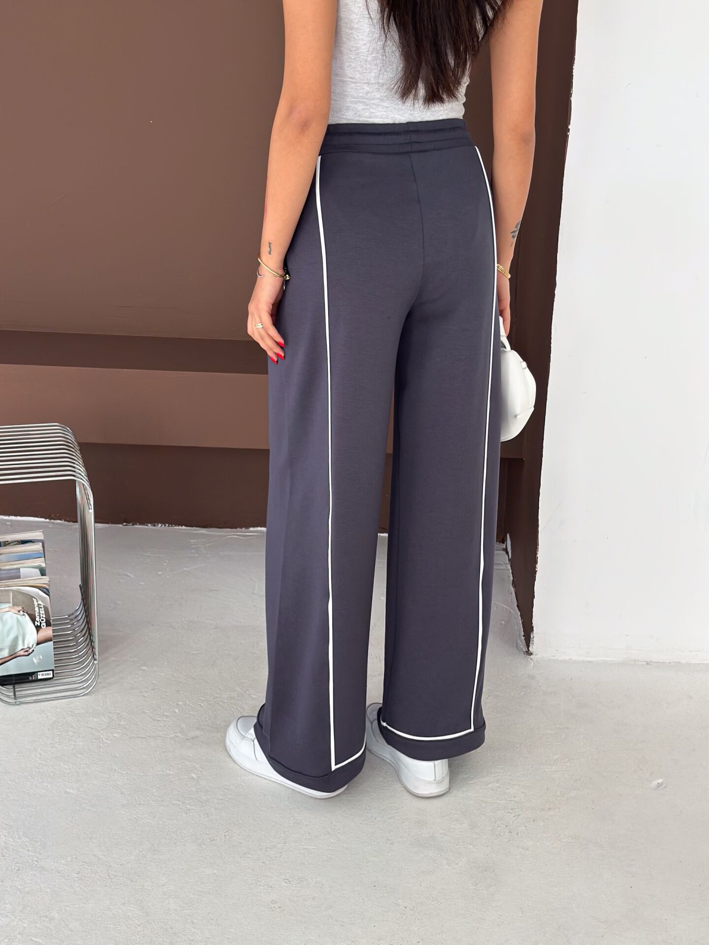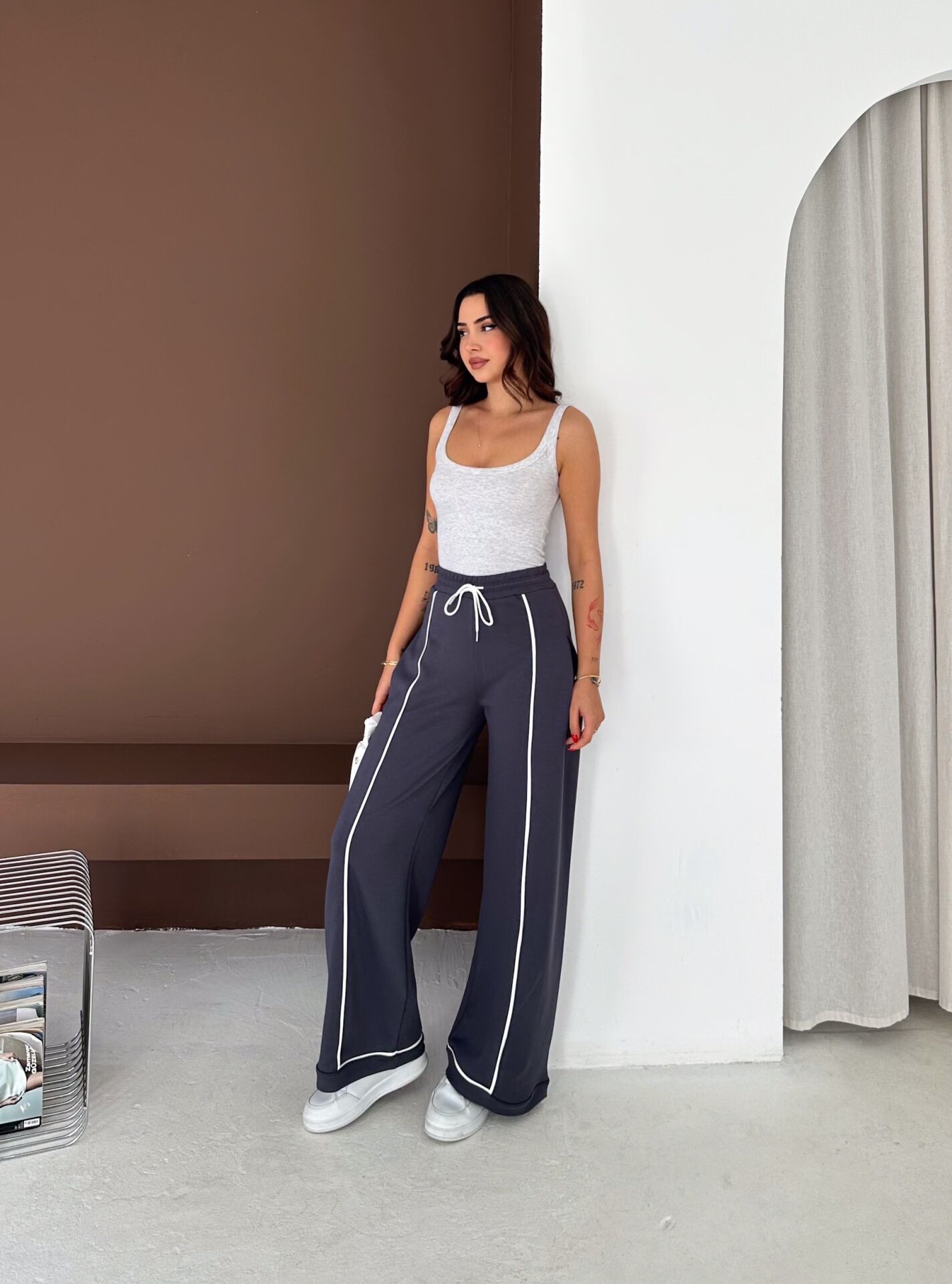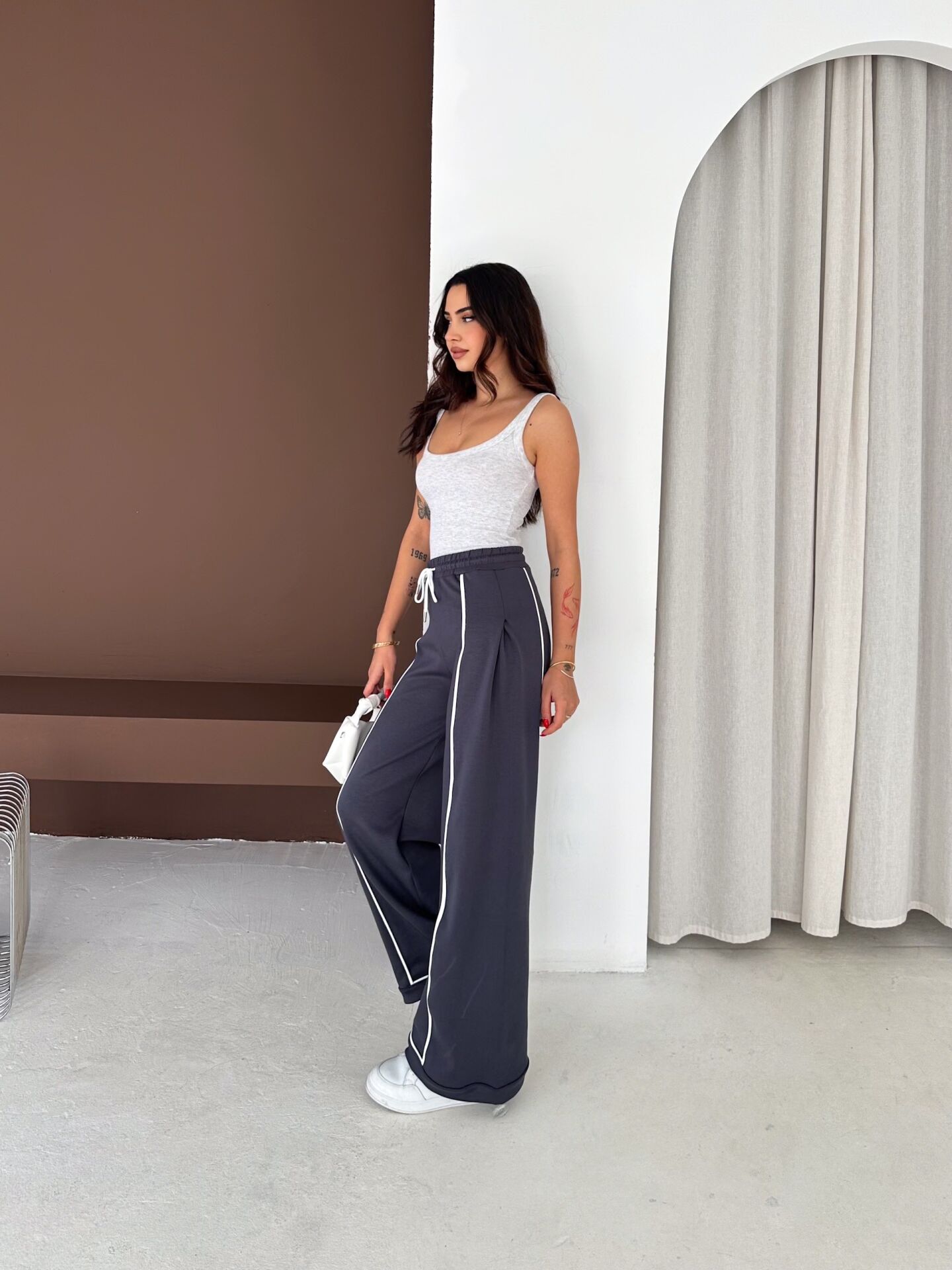 Geniş paça yapısı, baggy kalıbı ve yüksek bel formu ile hem konforu hem hareket özgürlüğünü artırır. Biyeli yan detayları modern bir görünüm kazandırırken düz dokuma yapısı ürünü dört mevsim kullanılabilir hale getirir.