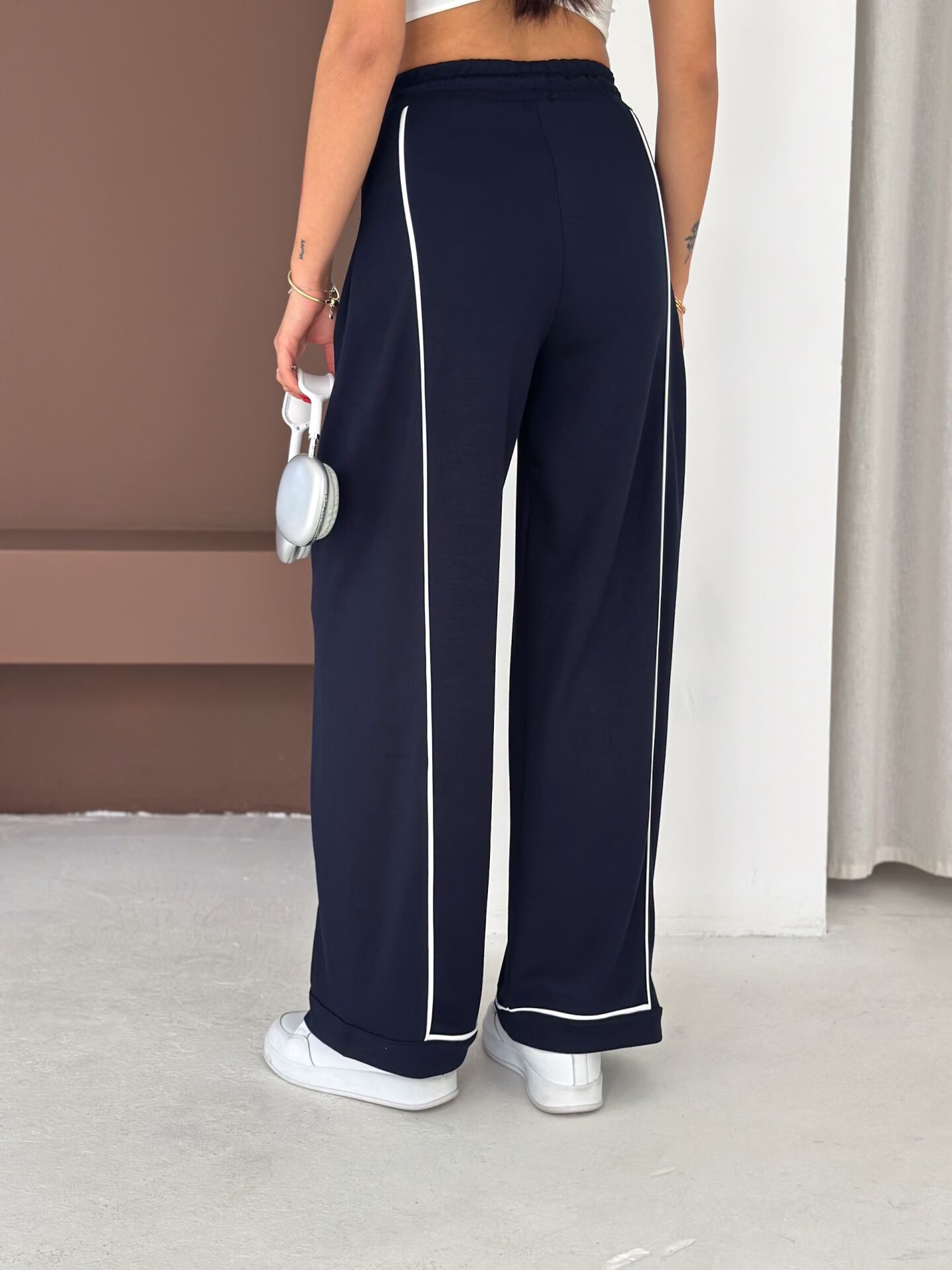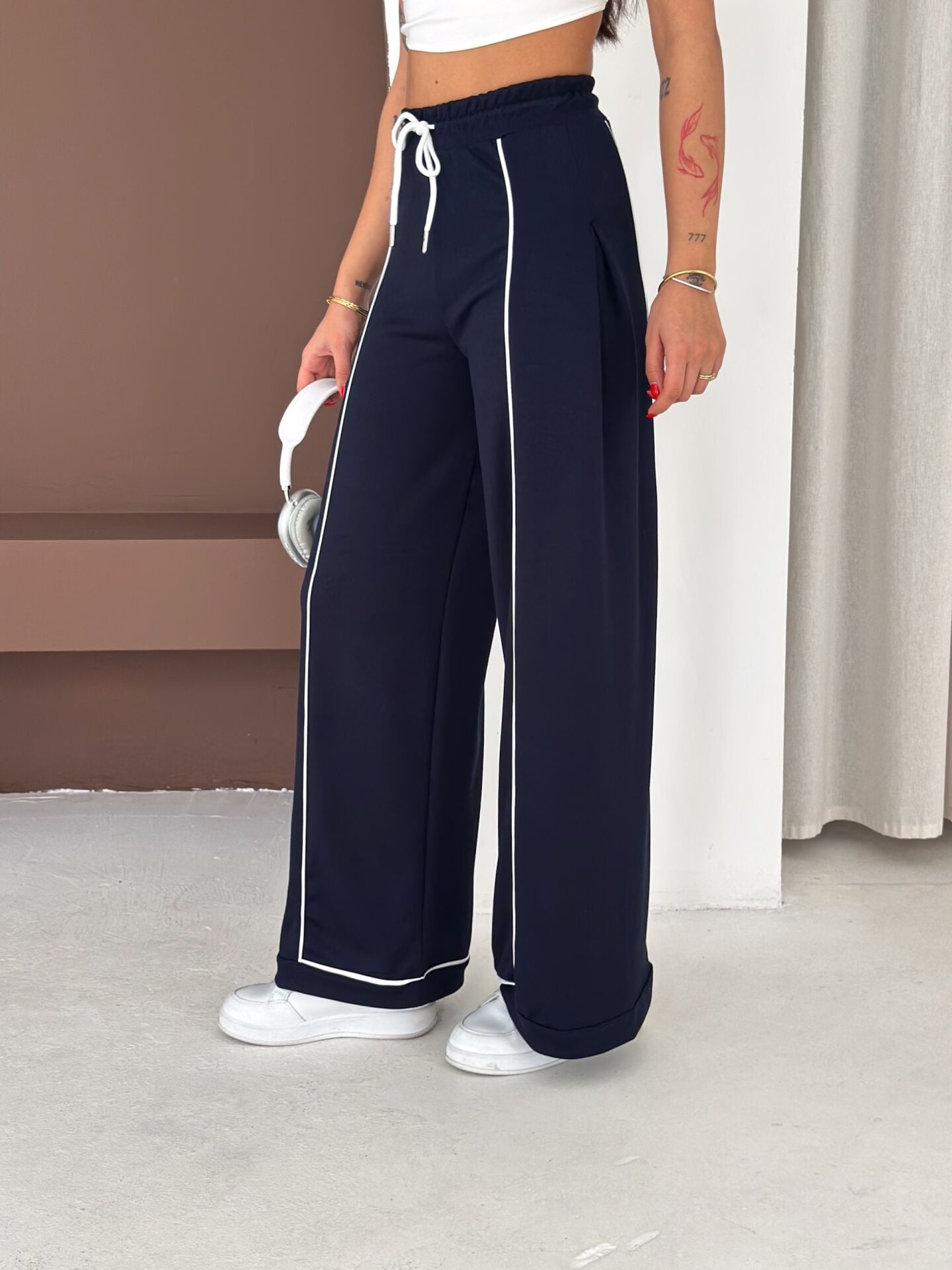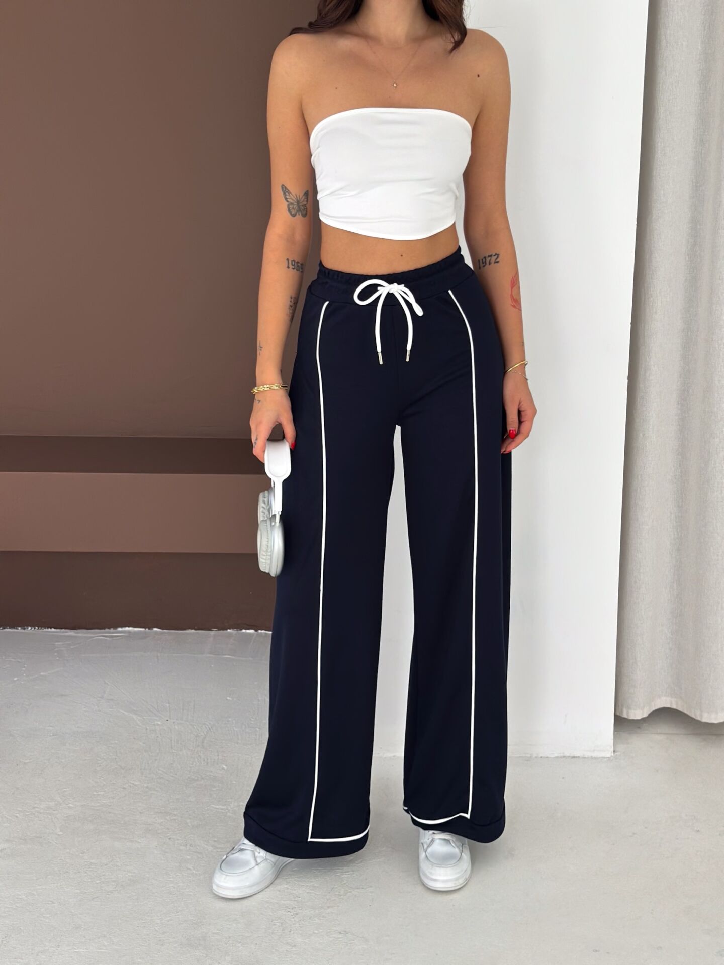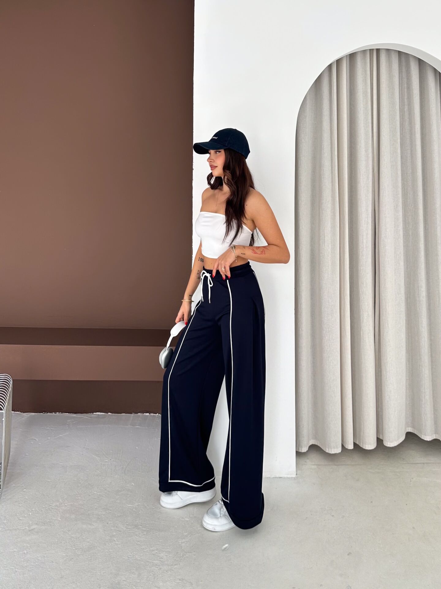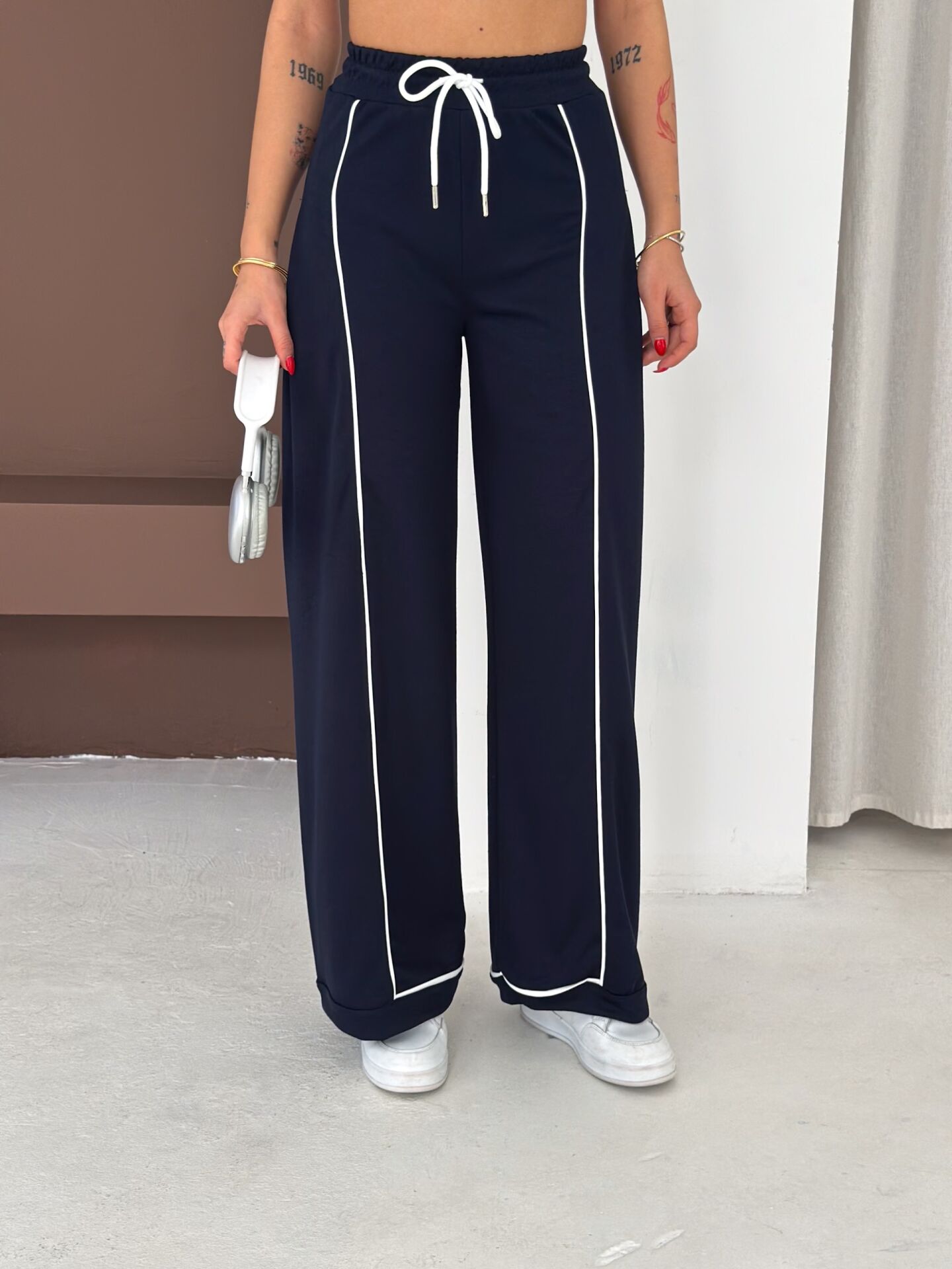 Geniş paça yapısı, baggy kalıbı ve yüksek bel formu ile hem konforu hem hareket özgürlüğünü artırır. Biyeli yan detayları modern bir görünüm kazandırırken düz dokuma yapısı ürünü dört mevsim kullanılabilir hale getirir.