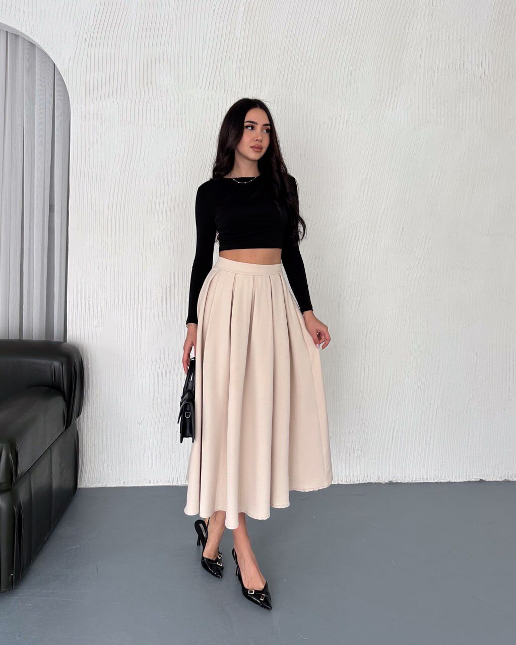 Uzun etek modelleri içinde yeni satışa sunduğumuz bu pileli kloş etek, dolabınızın en gözde parçalarından biri olmaya adaydır. Winmoda kalitesiyle üretilen model, yüksek bel formu, zarif pileleri ve rahat kesimiyle hem tesettür hem de klasik giyim tarzına mükemmel uyum sağlar.