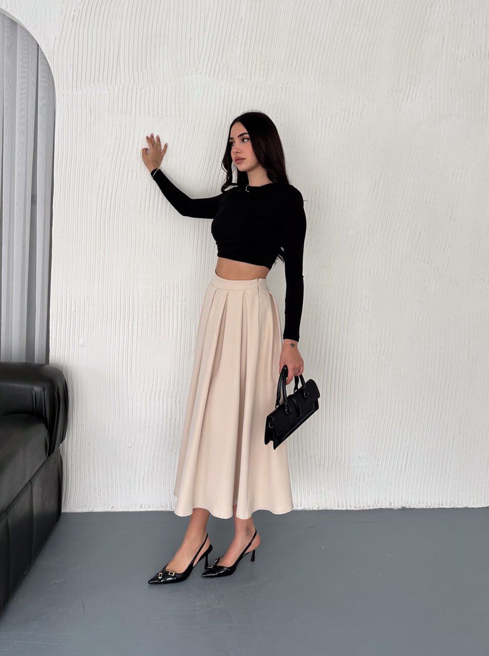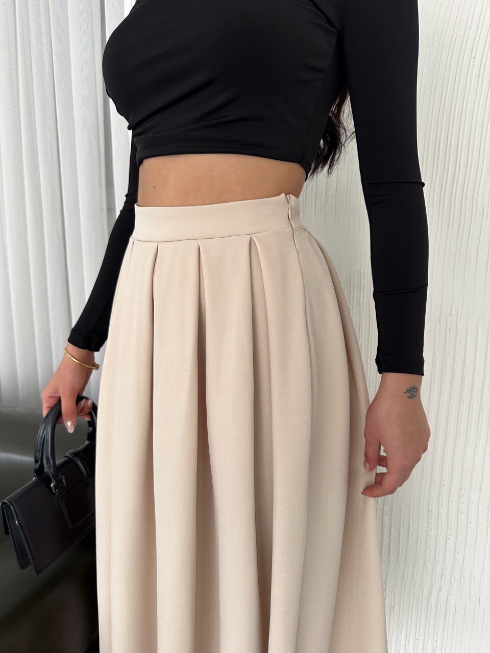 %90 polyester ve %10 viskoz karışımlı dobby dokuma kumaş, hem dökümlü hem de formunu koruyan yapısıyla gün boyu konfor sağlar. Yüksek bel kloş kesim, kalça ve basen bölgesindeki fazlalıkları nazikçe kamufle eder; pile detayları ise hareket halindeyken akışkan ve zarif bir siluet oluşturur. Astarsız ve iç göstermeyen yapısı sayesinde özellikle tesettür kombinlerinde güvenle tercih edilebilir.
