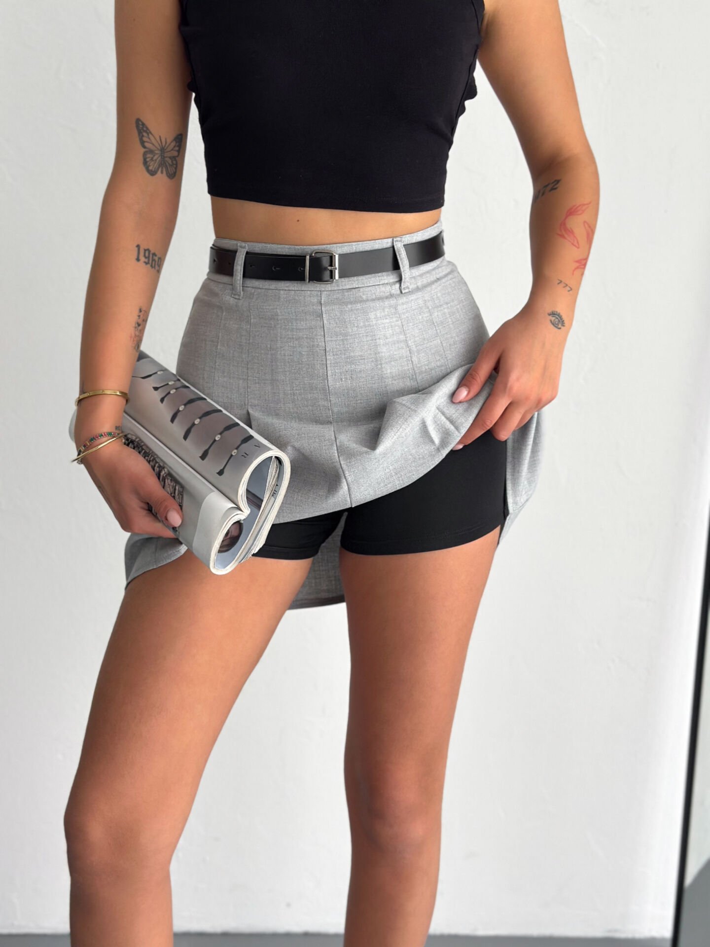Kadın Kemerli ve Pileli İçi Taytlı Etek - 2451 L - AÇIK GRİ