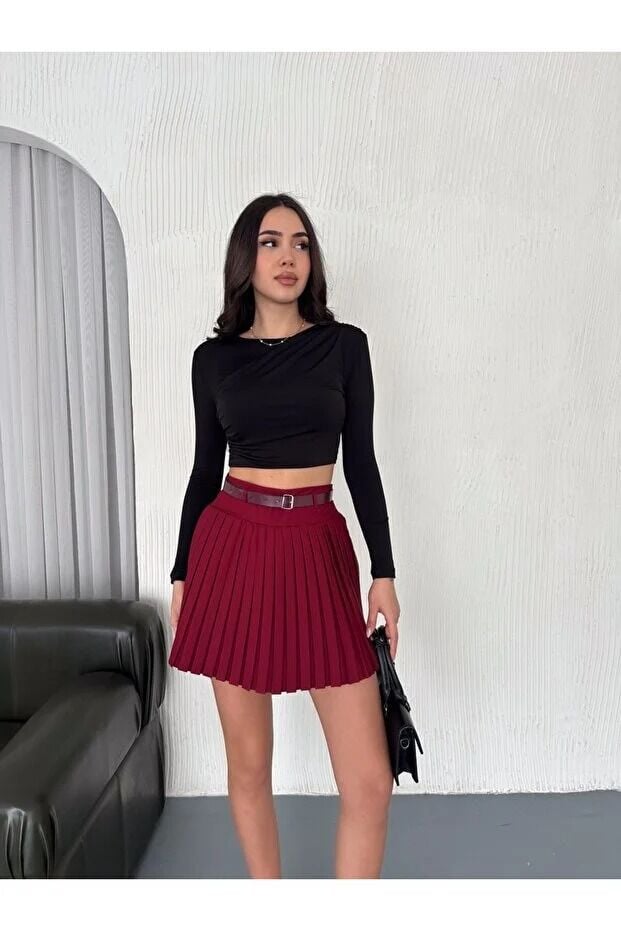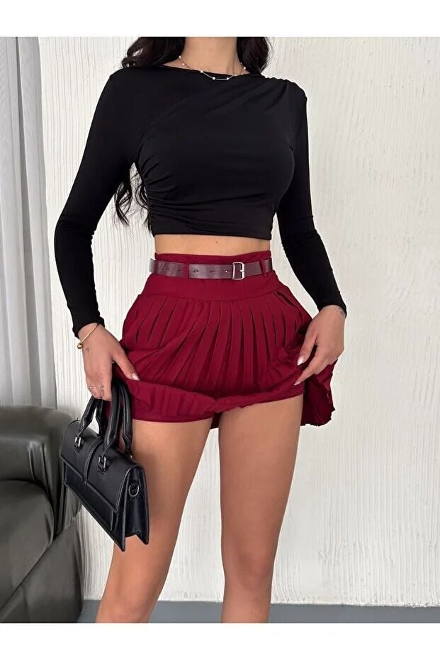 Kadın İçten Taytlı Diz Üstü Kemerli Etek Piliseli 2482 S - BORDO