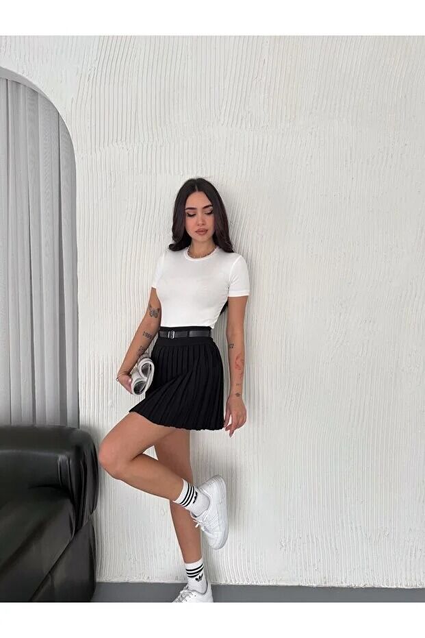 Kadın İçten Taytlı Diz Üstü Kemerli Etek Piliseli 2482 S - SİYAH
