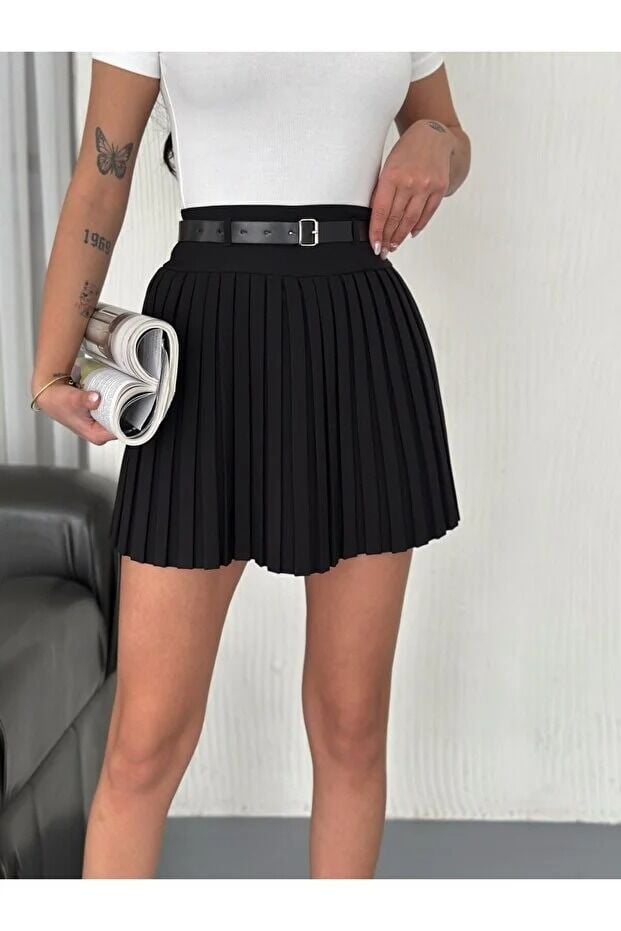 Kadın İçten Taytlı Diz Üstü Kemerli Etek Piliseli 2482 XL - SİYAH