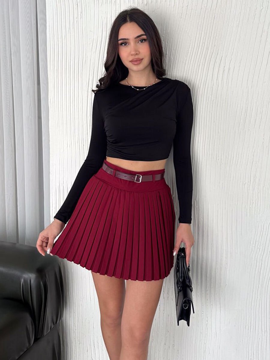 Kadın Yan Fermuarlı Piliseli Diz Üstü Kemerli Etek 2482 XL - BORDO