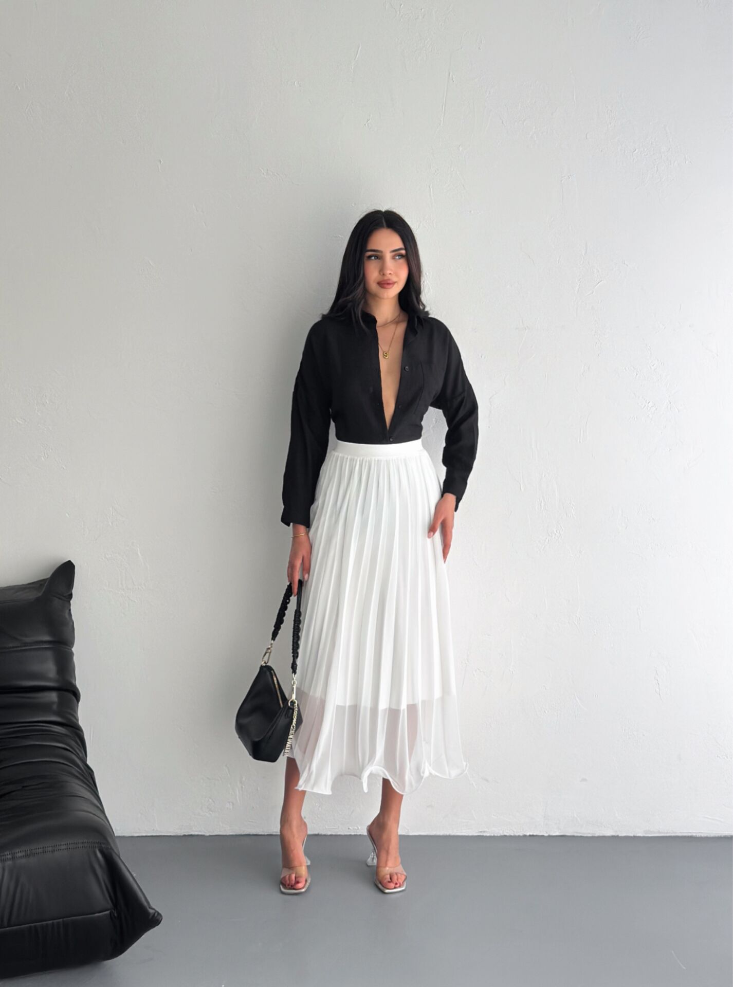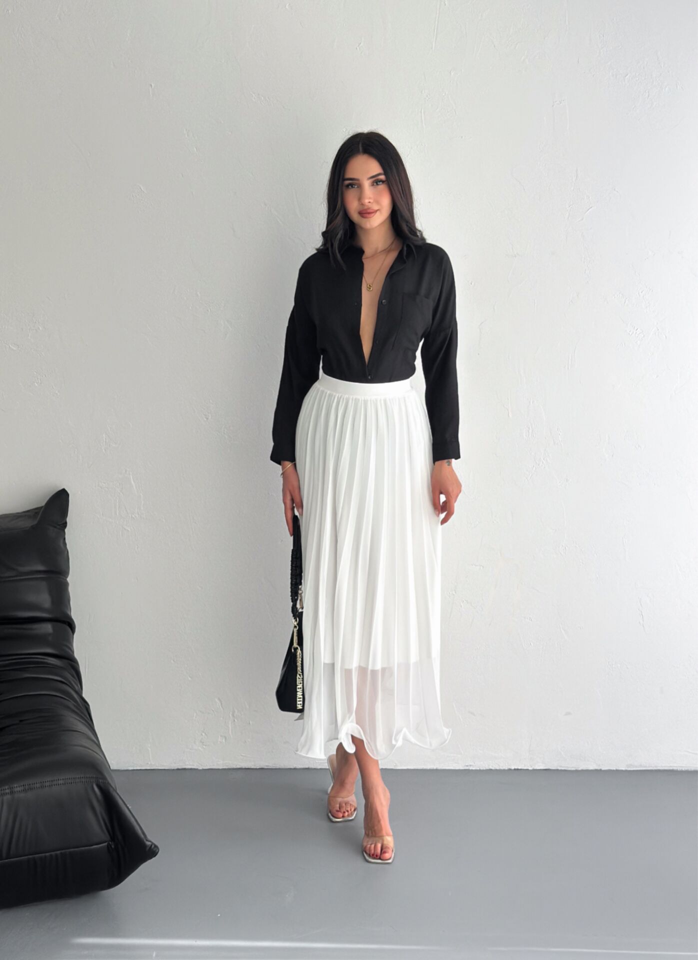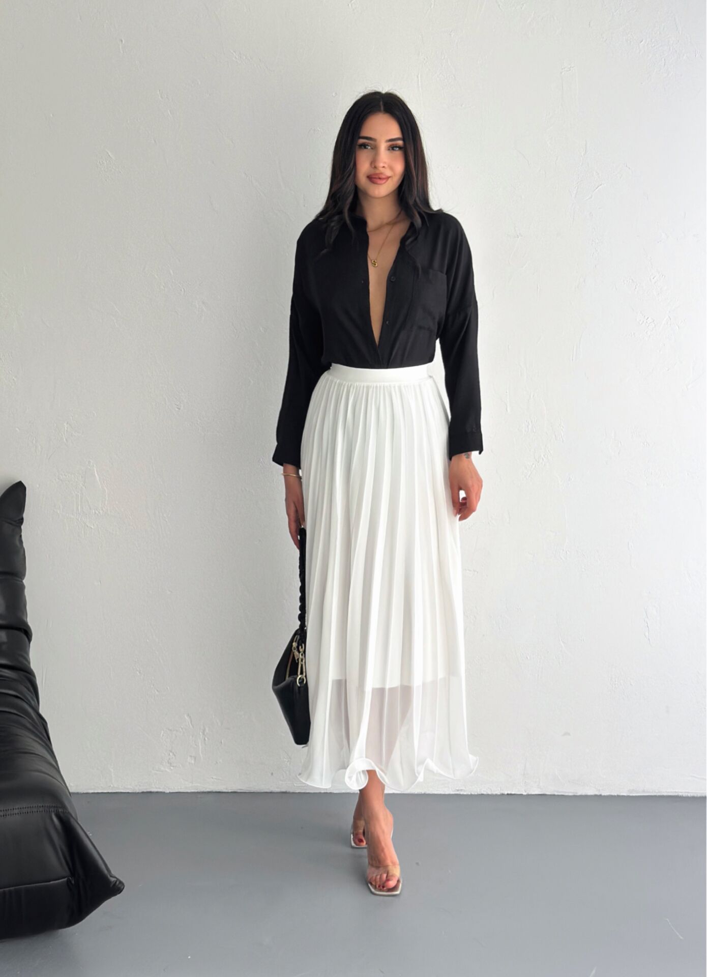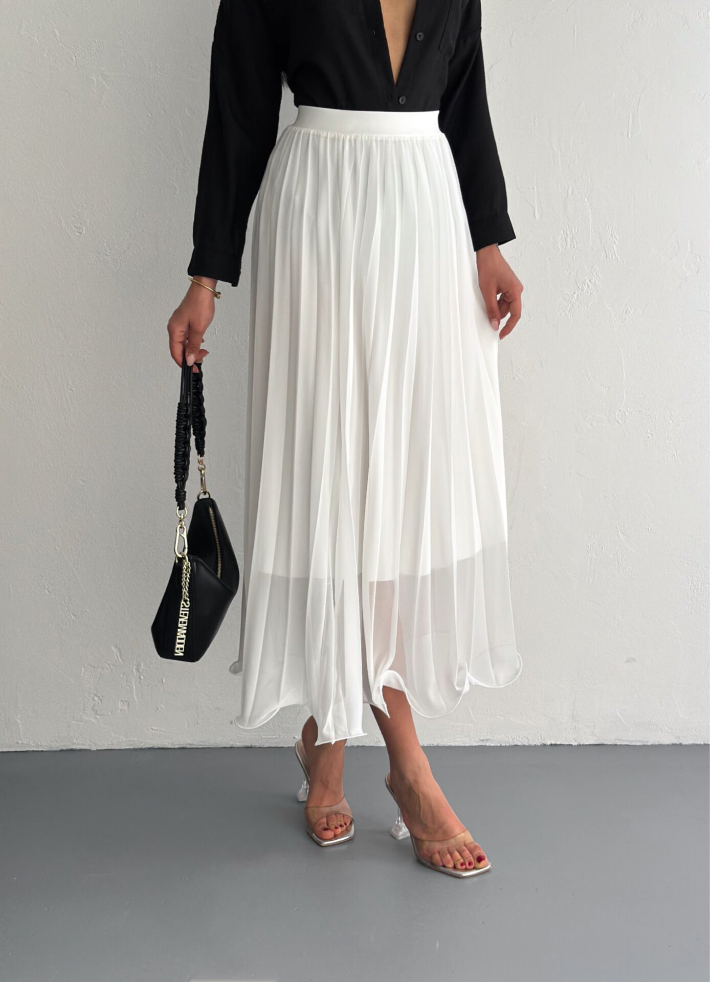 Beyaz uzun kloş etek modeli, dokuma kumaş yapısı ve akıcı siluetiyle hem zarif hem de modern bir görünüm sunar. Astarlı yapısı sayesinde iç gösterme problemi yaşatmaz ve gün boyu konforlu bir kullanım sağlar. Düz ve minimalist tasarımı, Basic koleksiyona ait sade şıklığı öne çıkarırken tül dokuma tipi eteğe hafif ve zarif bir duruş kazandırır. Kloş siluet, yürürken akıcı bir hareket sağlar ve her vücut tipine uyumlu bir form sunar. Normal bel yapısı ile rahat kullanım sağlayan etek, kemersiz formuyla doğal bir duruş elde etmenize yardımcı olur. Trend ortamlarda, özel günlerde ve günlük kullanımda kolayca kombinlenebilir. Winmoda tarafından satışa sunulan beyaz kloş etek, yaz-kış tüm sezonlarda tercih edilebilecek zamansız bir parçadır.