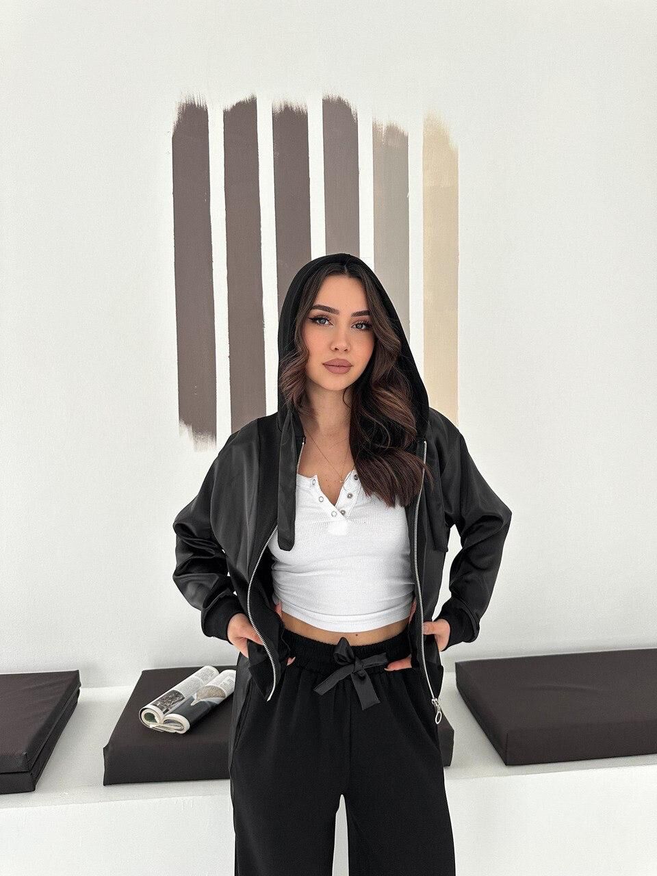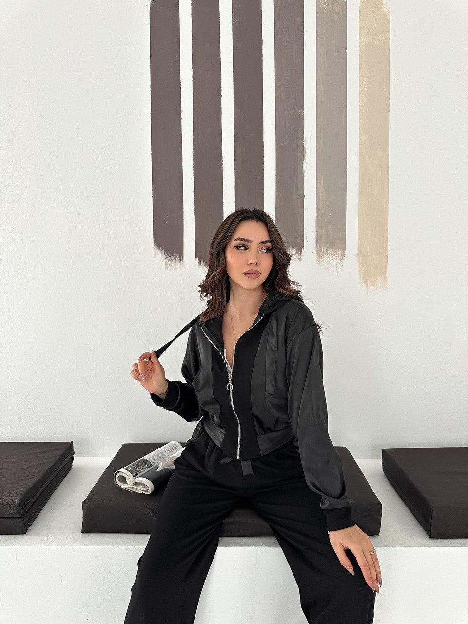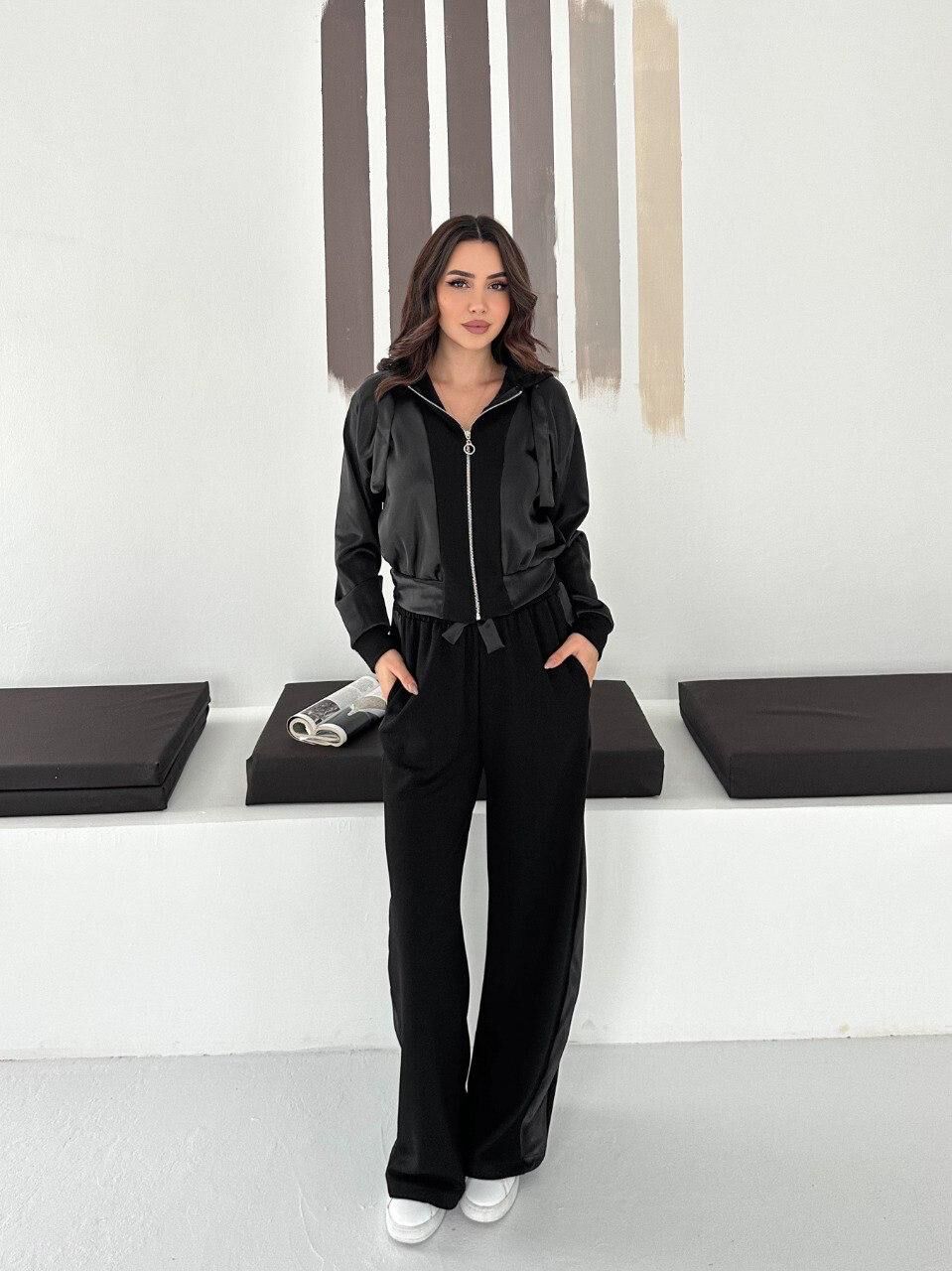 Premium Kadın Modal Baggy Eşofman Takımı Kapüşonlu Cepli Saten Detaylı Günlük 2634 S - SİYAH