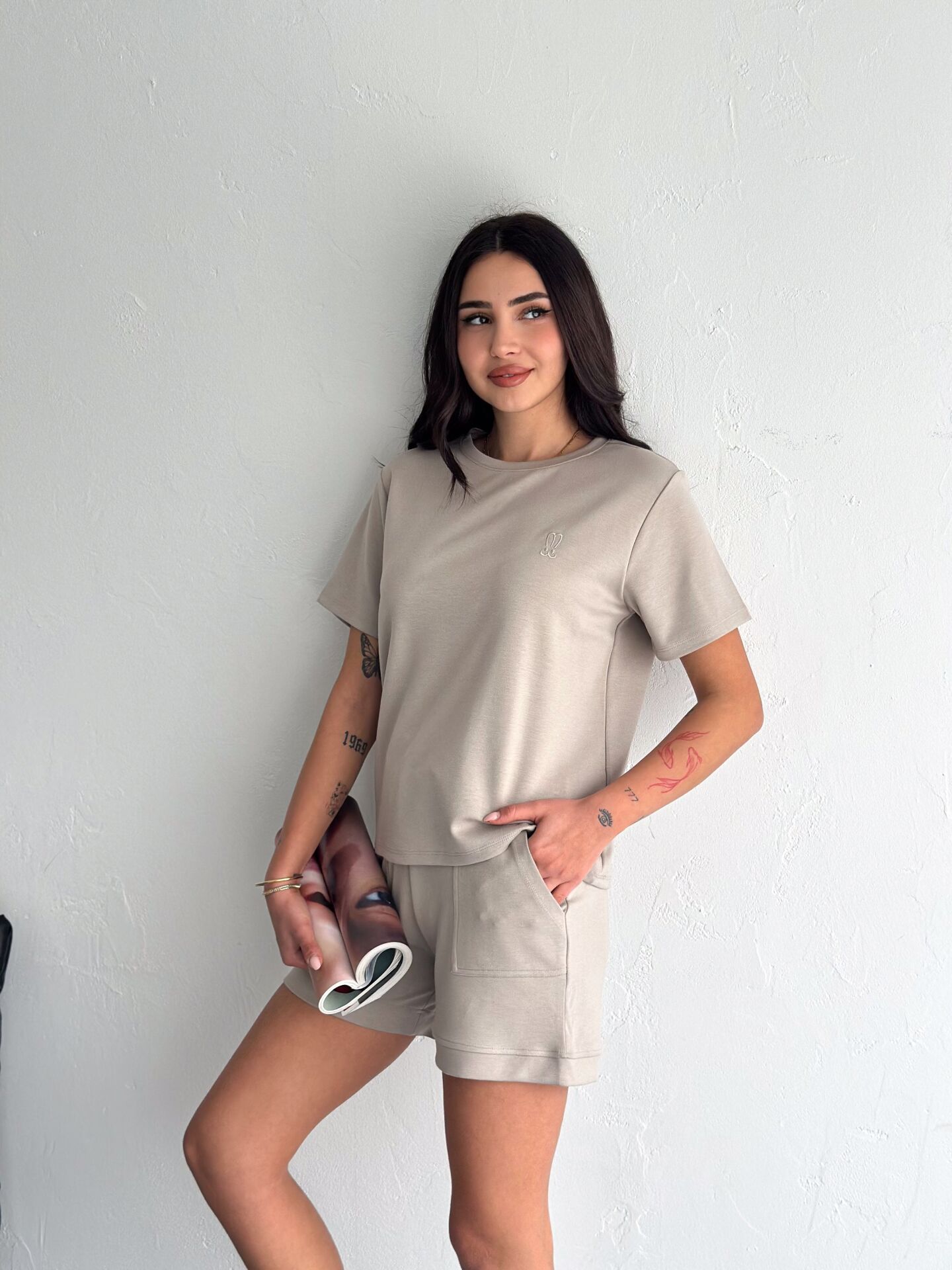 Kısa kollu şortlu kadın takım modeli, modal kumaşın yumuşacık dokusu sayesinde gün boyu konfor sunar. Üst kısa kollu t-shirt ve alt yüksek bel lastikli şorttan oluşan bu takım, tam beden ölçülerine uygun olarak tasarlanmıştır.