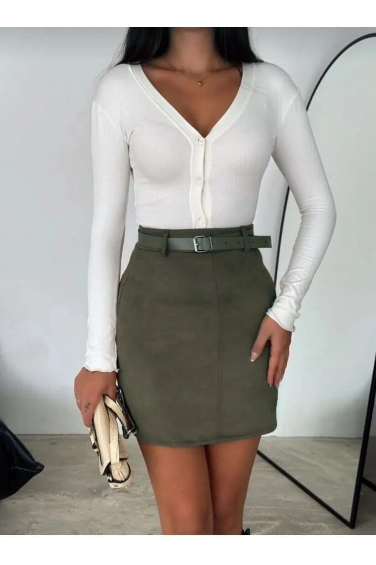 Kapama şekli fermuarlı olan süet etek, kendi bedeninizi seçebileceğiniz şekilde tam kalıpta üretilmiştir. Winmoda tarafından özenle hazırlanan bu model, hem ofis stiline hem de gece şıklığına uyum sağlar. Beyaz, kemerli ve slim formu sayesinde dolabınızın kurtarıcı parçalarından biri olmayı garantiler.