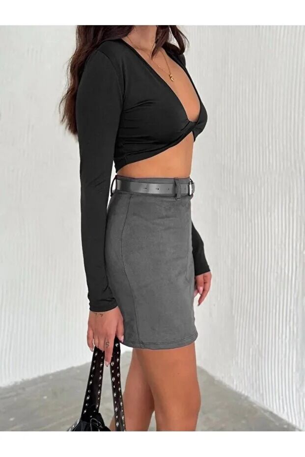 Kadın Kemerli Süet Etek 2368 M - GRİ