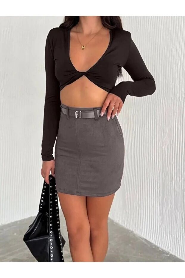 Kadın Kemerli Süet Etek 2368 XS - GRİ