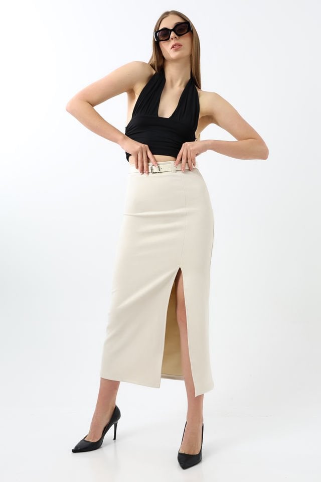Kadın Önden Yırtmaçlı Midi Boy Likralı Etek, esnek kumaşı ve midi boy kesimiyle günlük kullanımda rahatlık ve modern şıklık sunar. Şimdi keşfet! Trend parça!!!