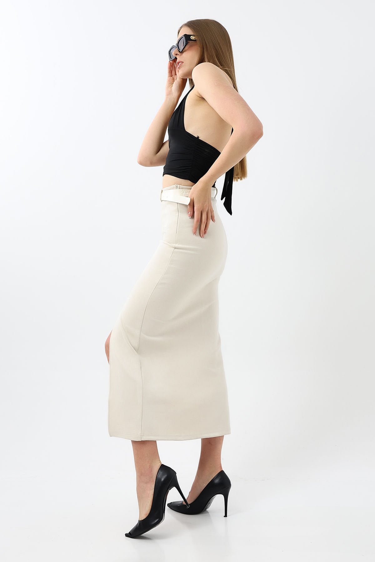 Kadın Önden Yırtmaçlı Midi Boy Likralı Etek, esnek kumaşı ve midi boy kesimiyle günlük kullanımda rahatlık ve modern şıklık sunar. Şimdi keşfet! Trend parça!!!