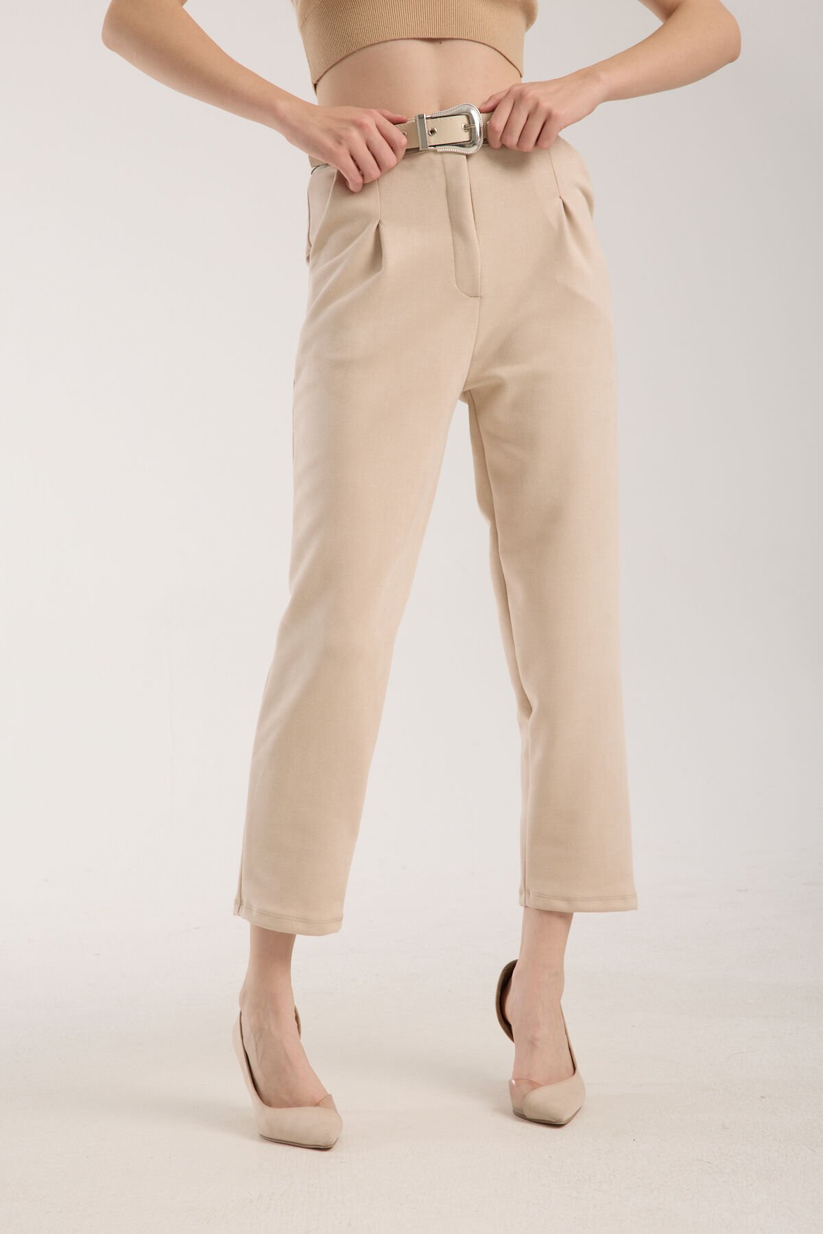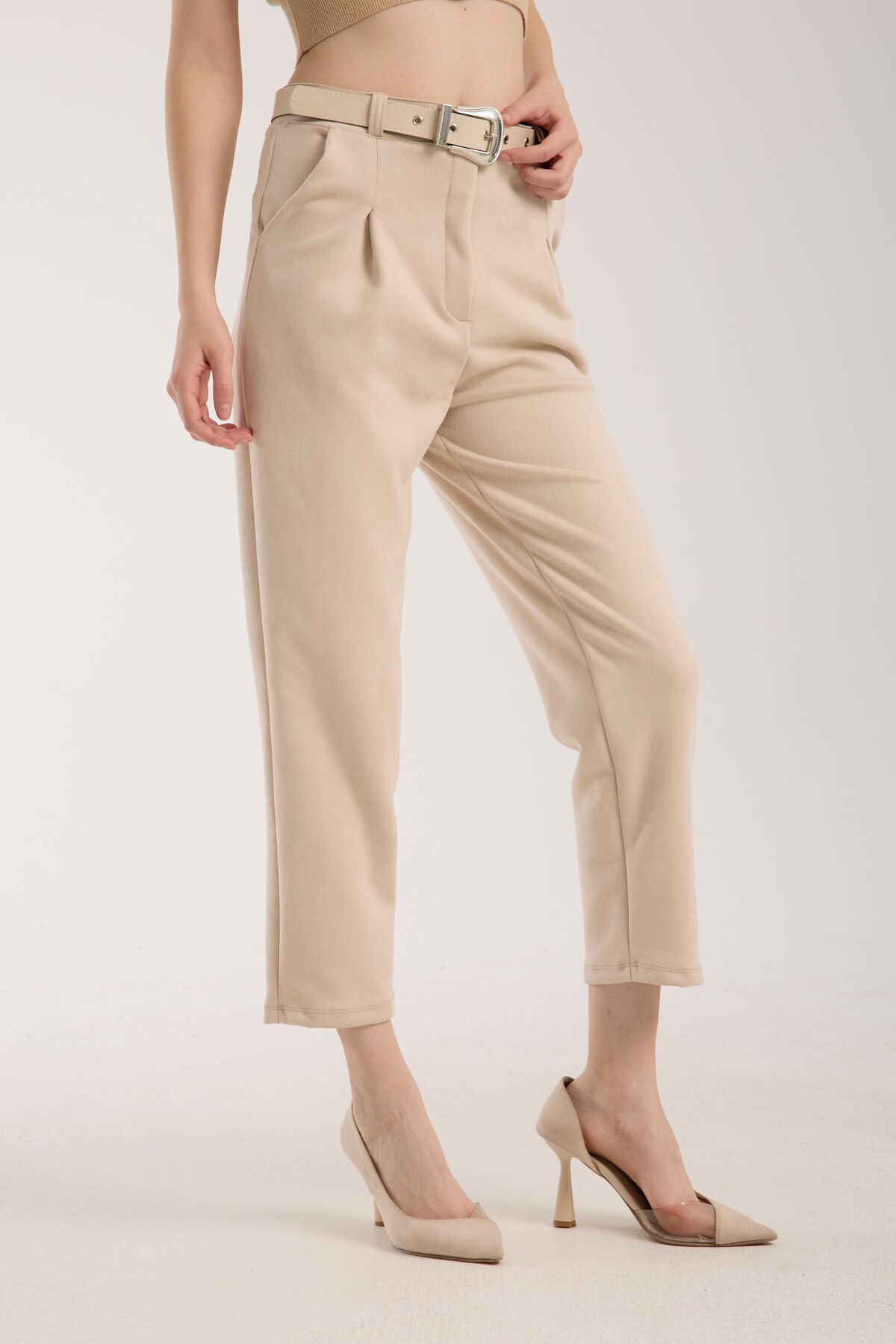 Kadın Kemerli Ön Pile Detaylı Kemerli Süet Cepli Pantolon D2-S1 2XL - EKRU