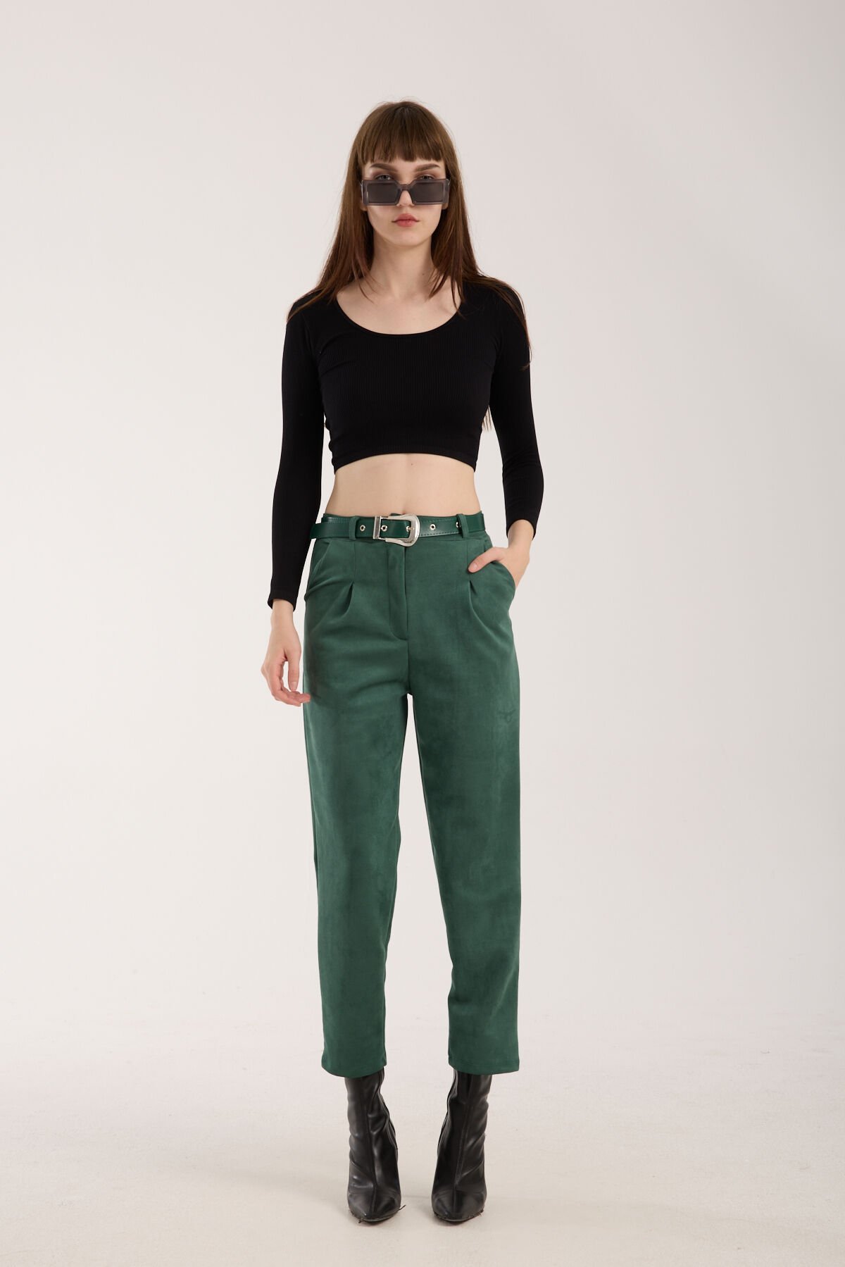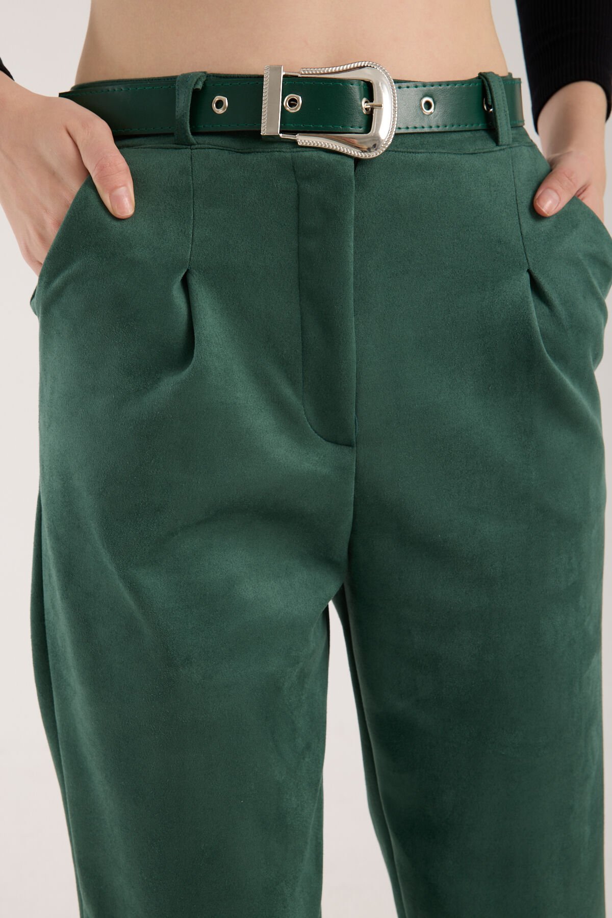 Kadın Kemerli Ön Pile Detaylı Kemerli Süet Cepli Pantolon D2-S1 2XL - YEŞİL