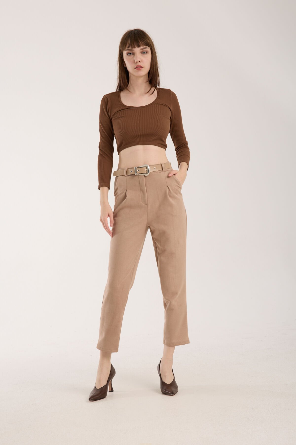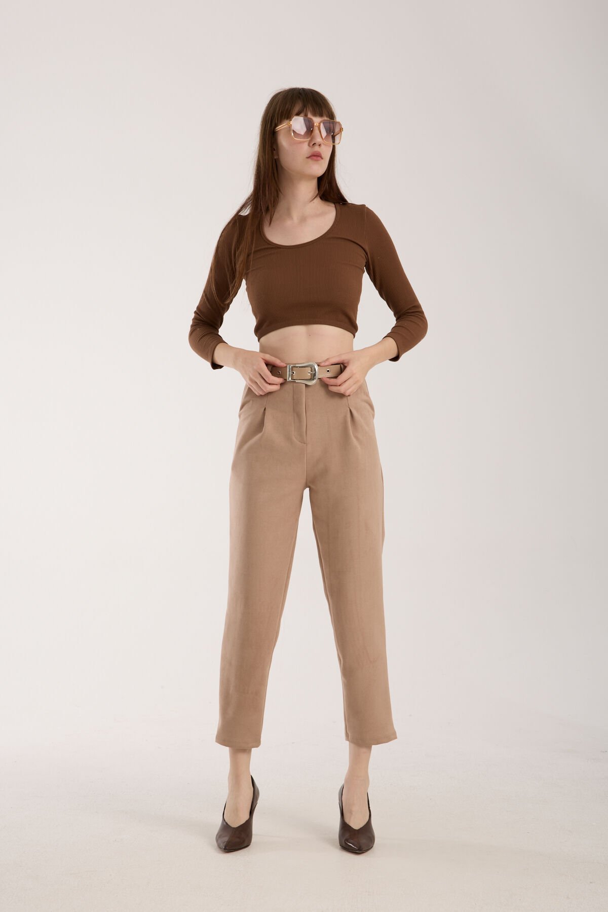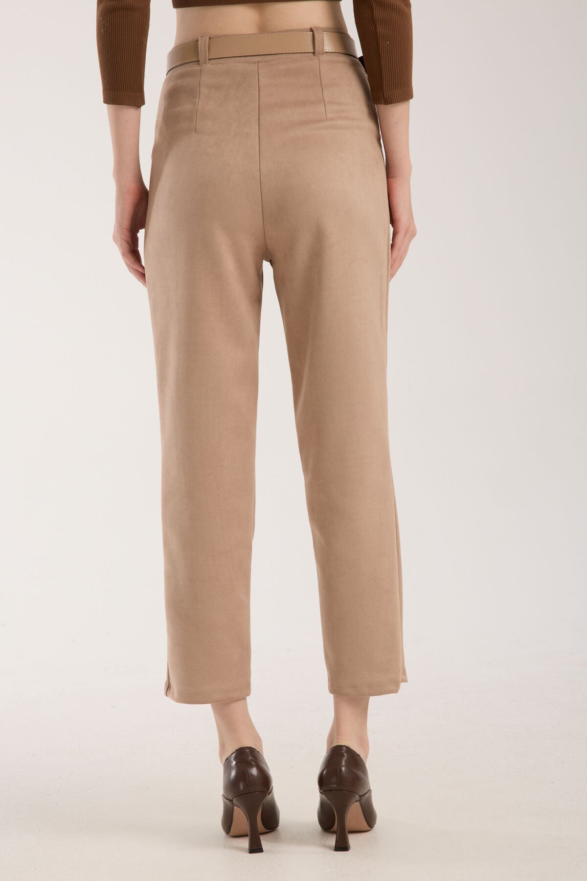 Kadın Kemerli Ön Pile Detaylı Kemerli Süet Cepli Pantolon D2-S1 M - BEJ