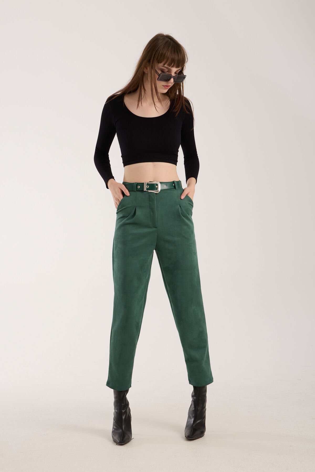 Kadın Kemerli Ön Pile Detaylı Kemerli Süet Cepli Pantolon D2-S1 M - YEŞİL