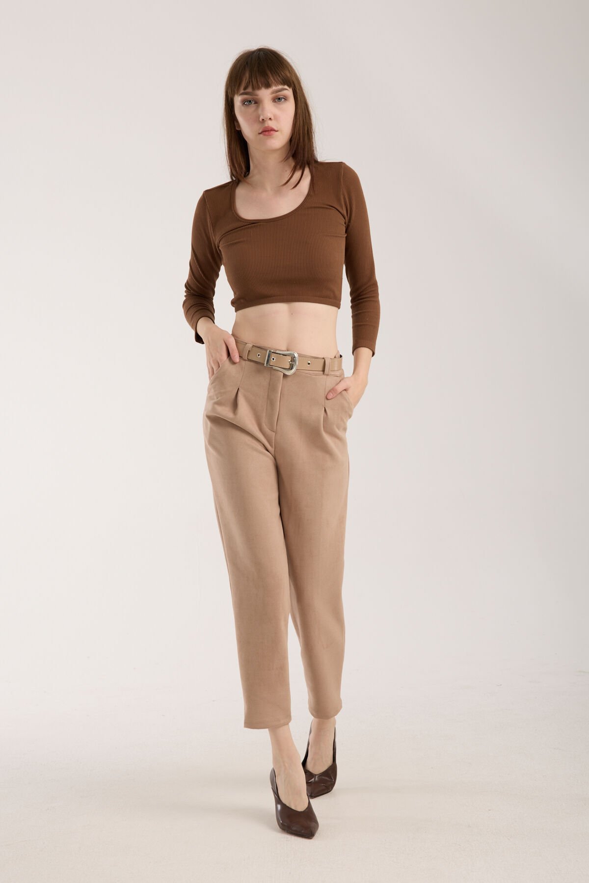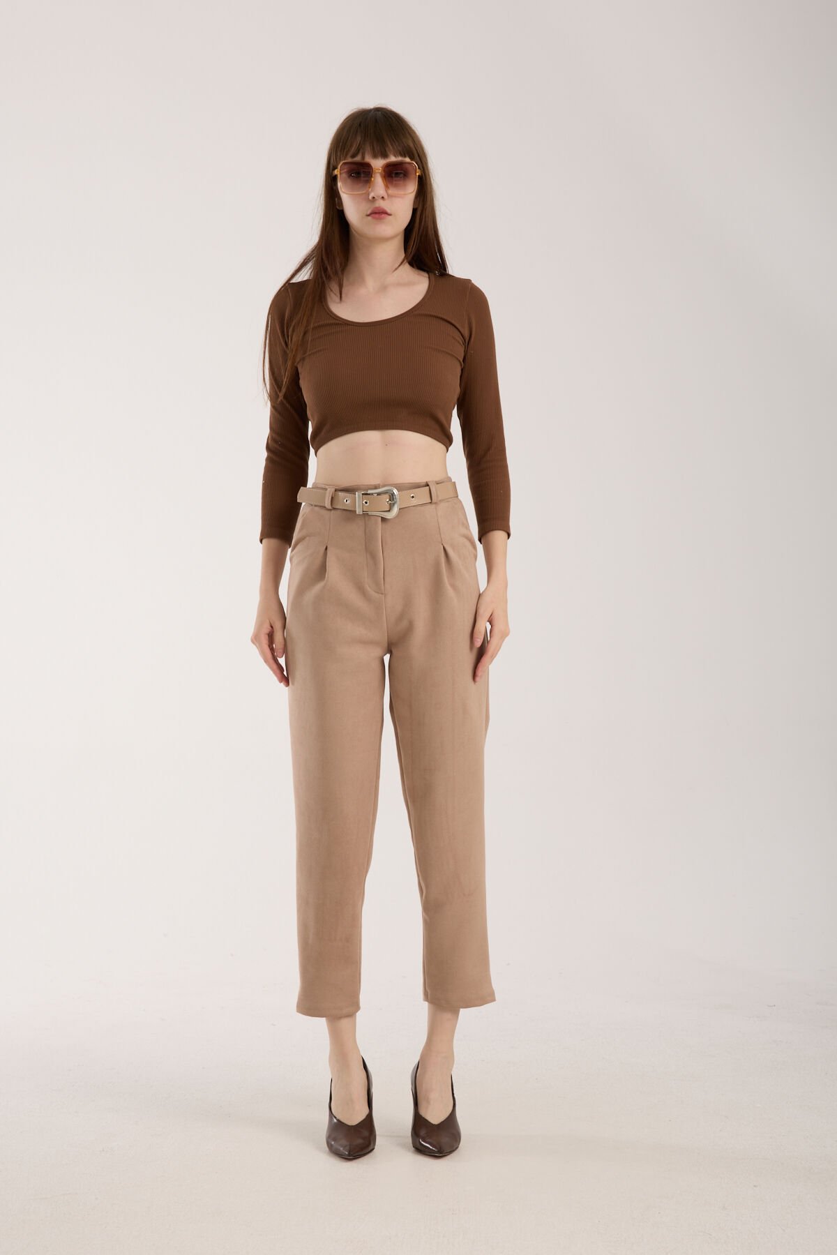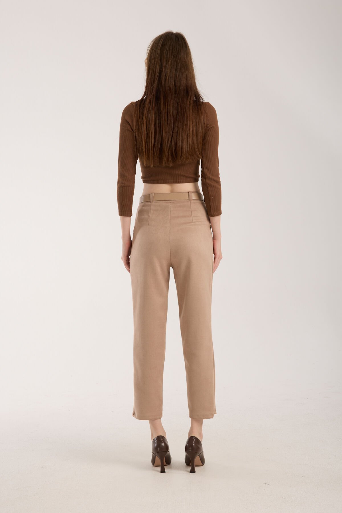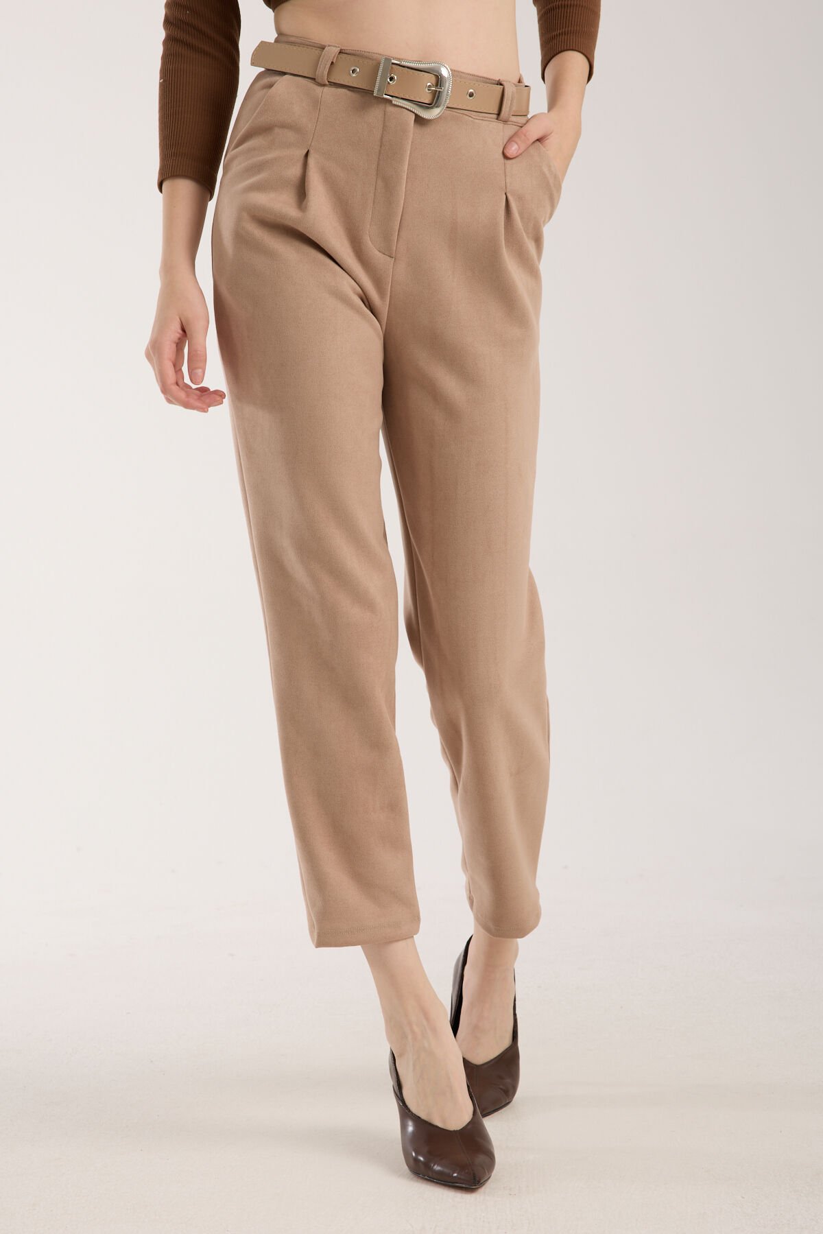 Kadın Kemerli Ön Pile Detaylı Kemerli Süet Cepli Pantolon D2-S1 S - BEJ