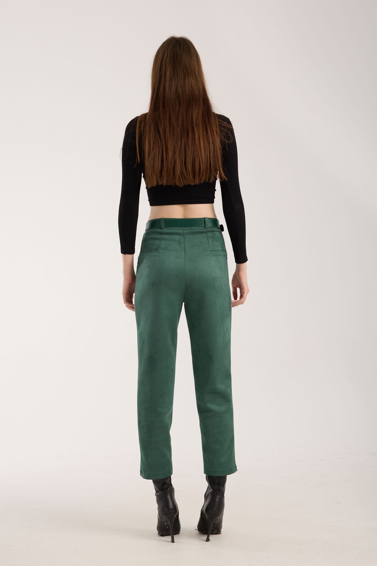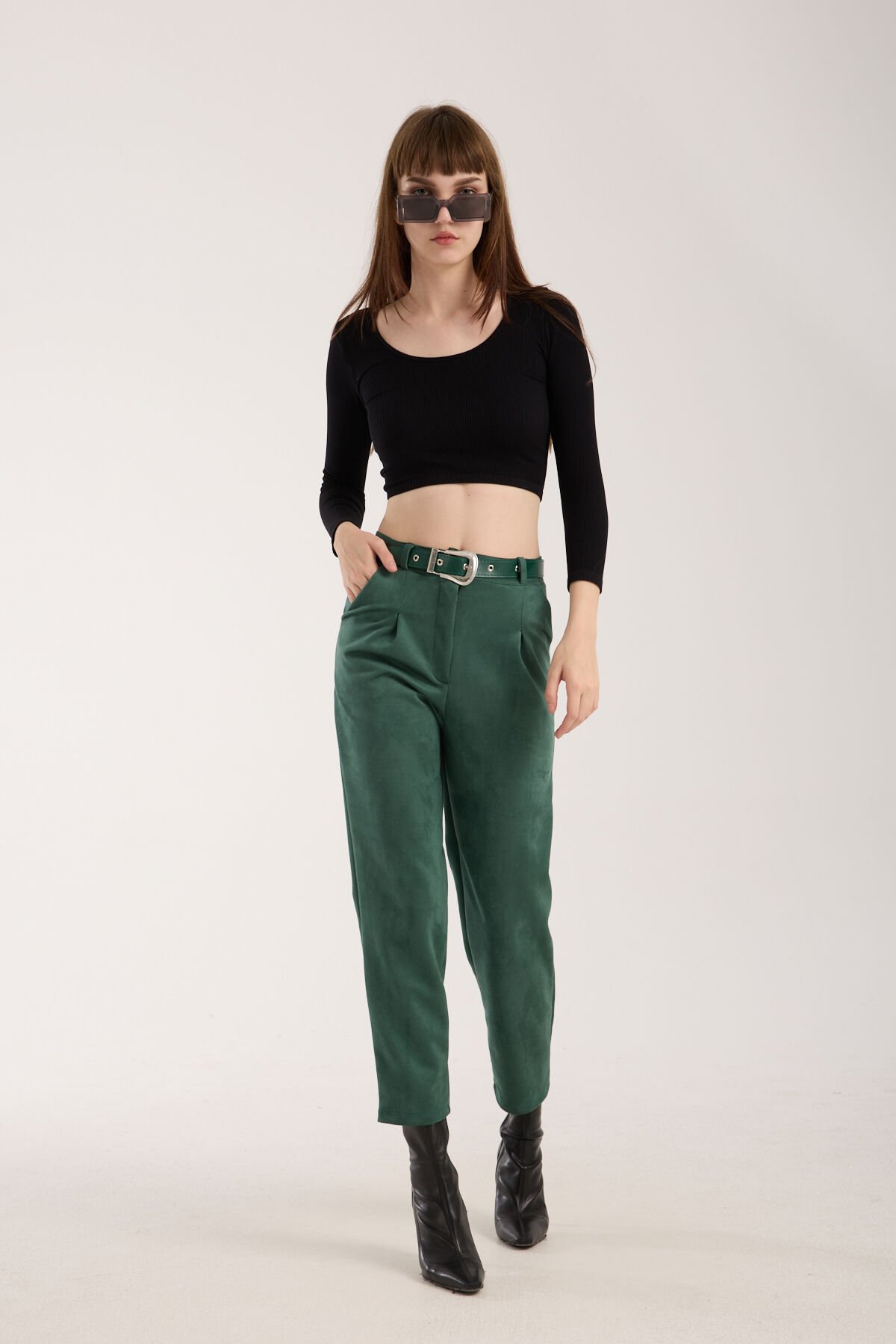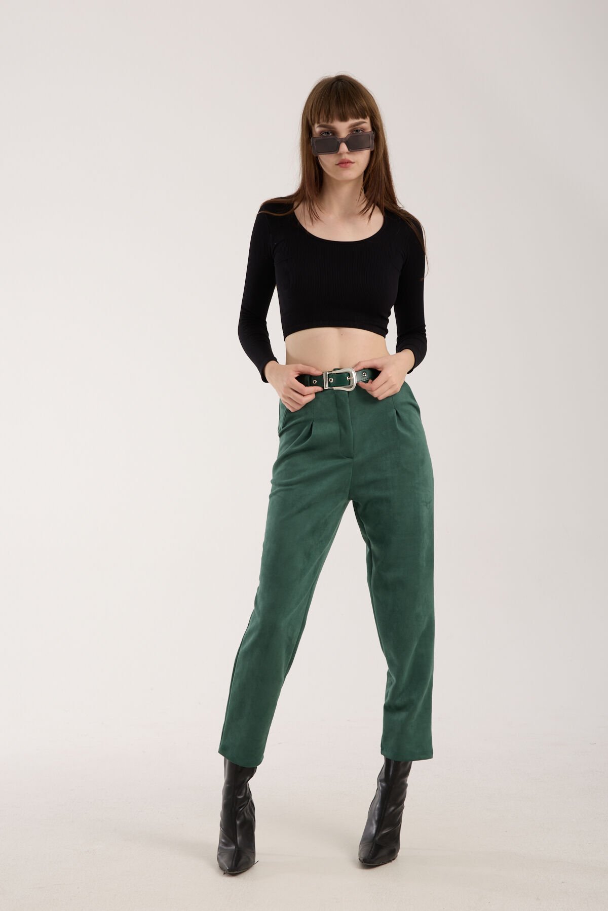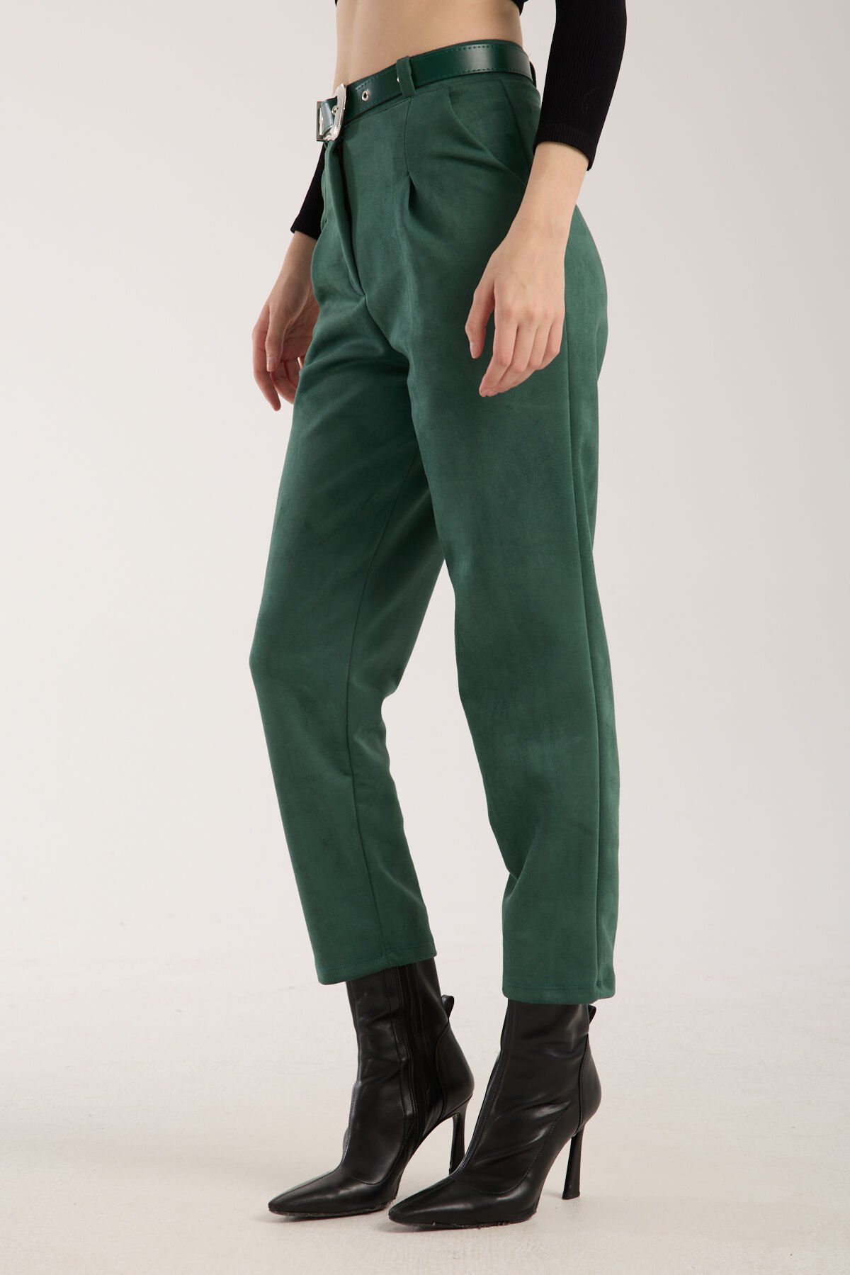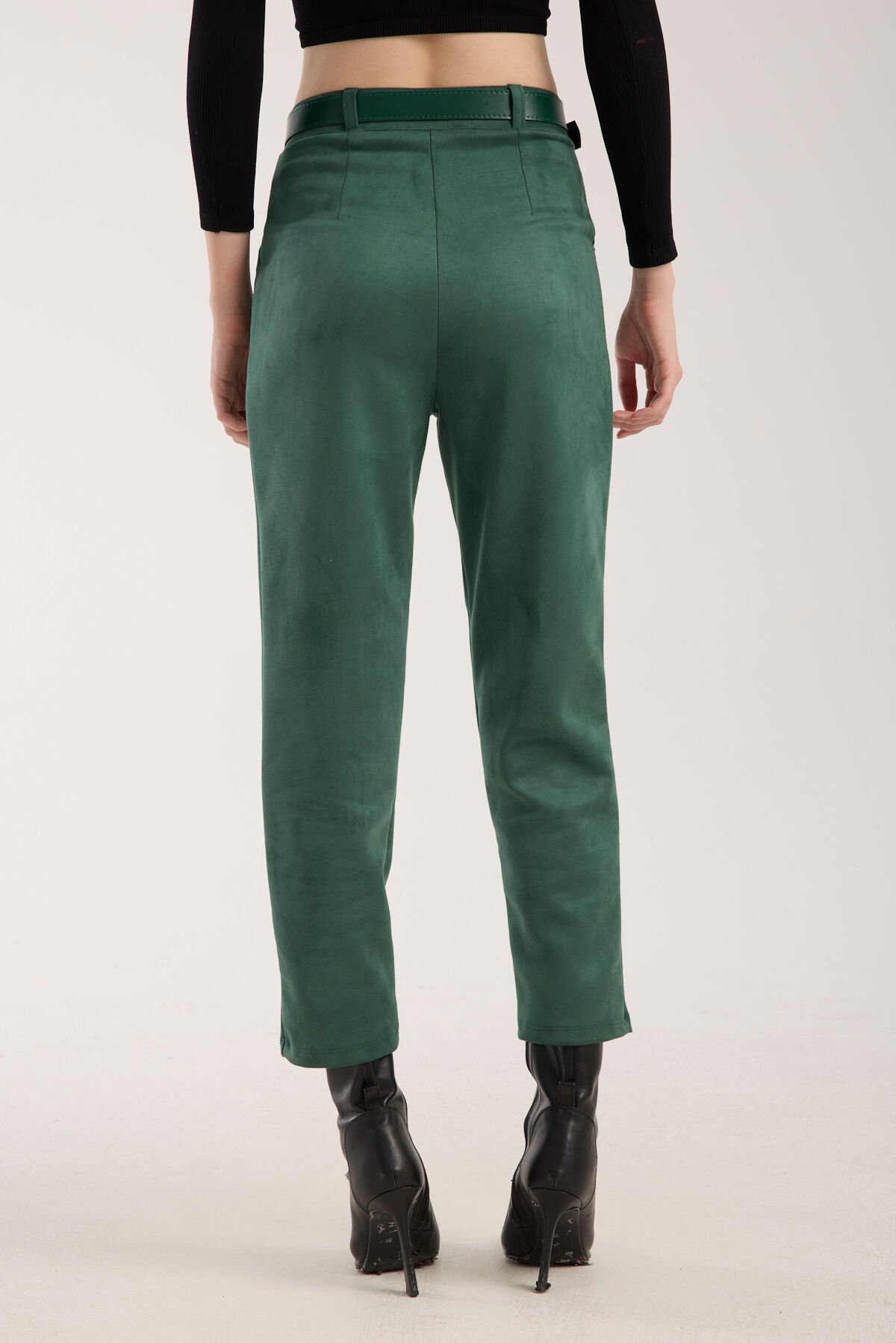 Kadın Kemerli Ön Pile Detaylı Kemerli Süet Cepli Pantolon D2-S1 S - YEŞİL