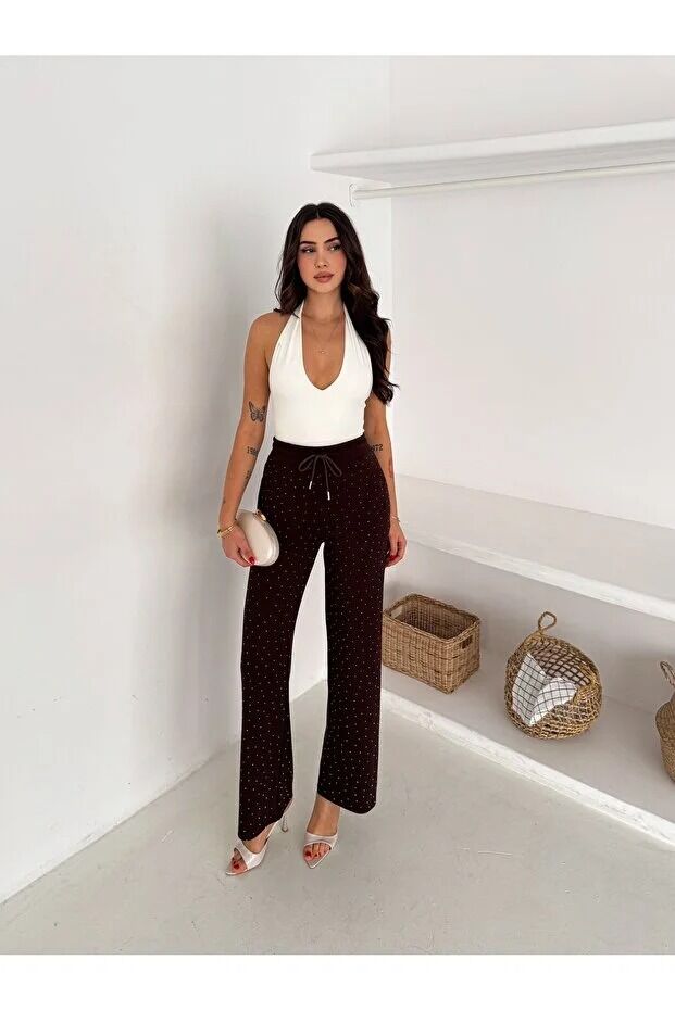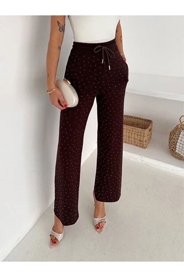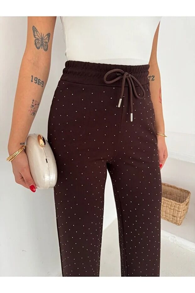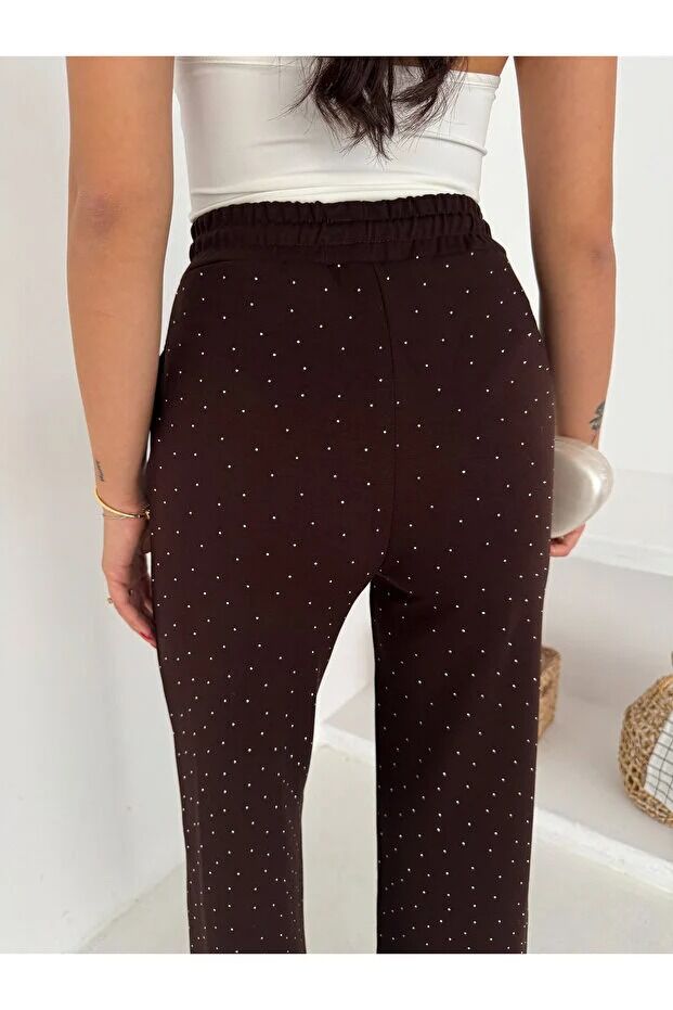 Kadın Taş Detaylı Beli Lastikli Rahat Kesim Pantolon 2601 XL - KAHVERENGİ
