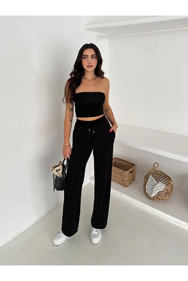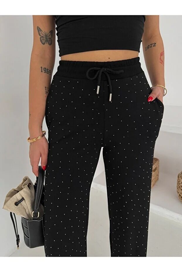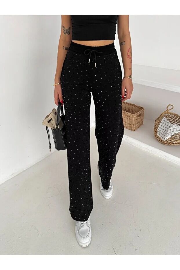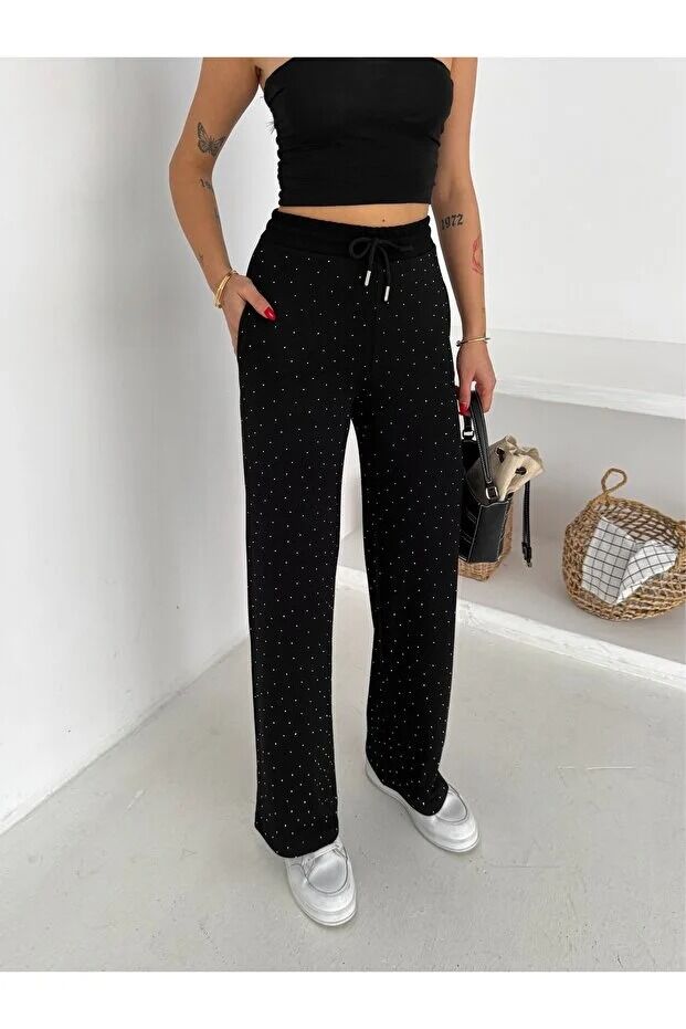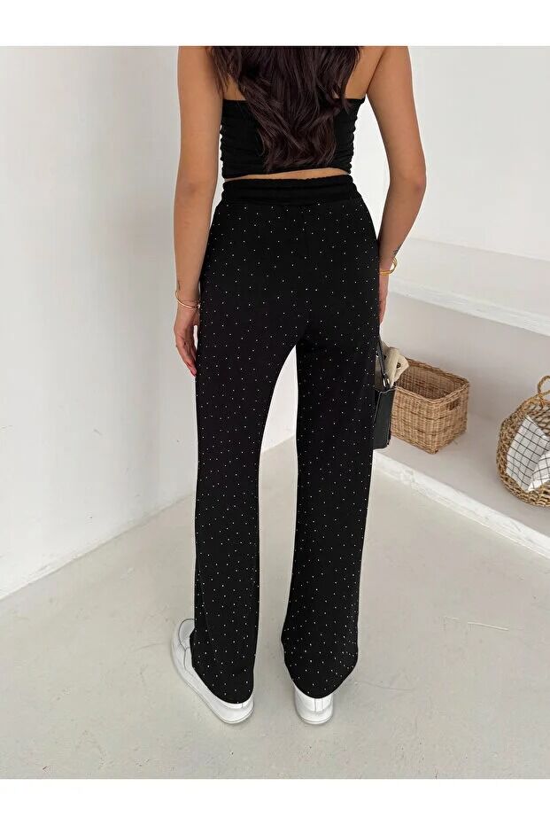 Kadın Taş Detaylı Beli Lastikli Rahat Kesim Pantolon 2601 XL - SİYAH