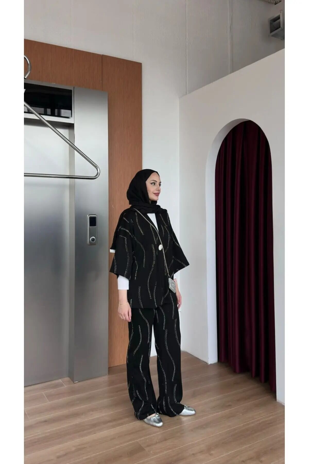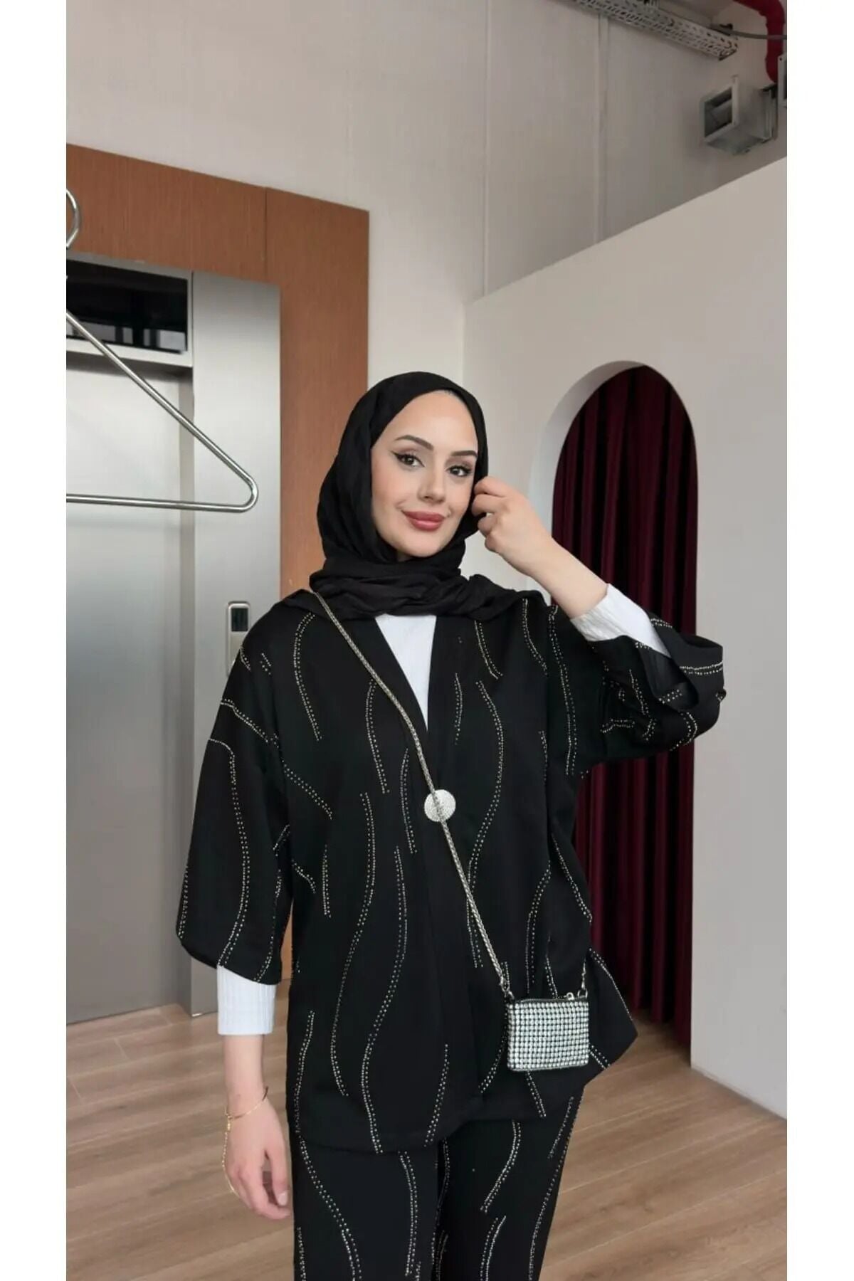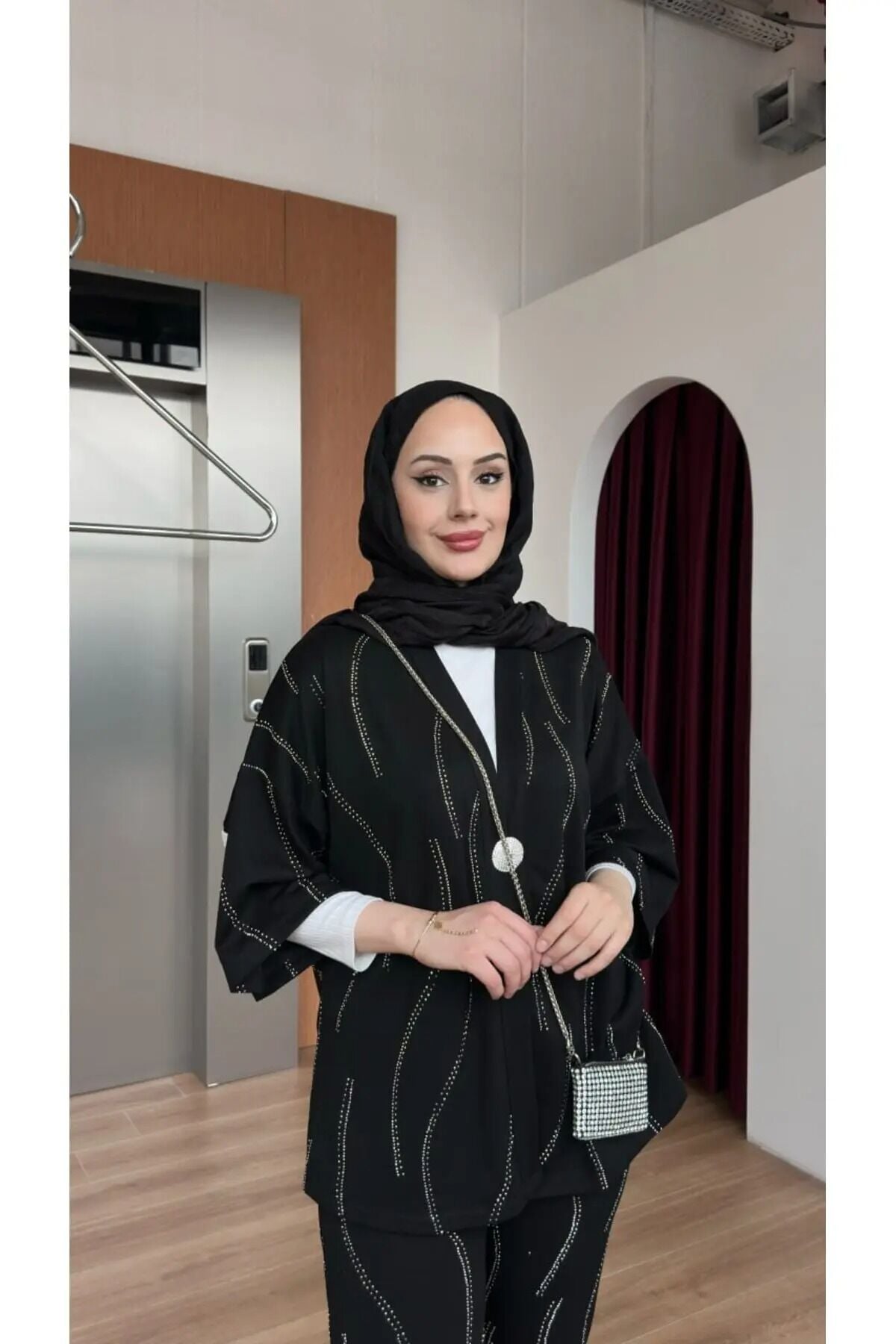 TAŞLI KİMONO TAKIM / TESETTÜR TAKIM 6241 XL - SİYAH