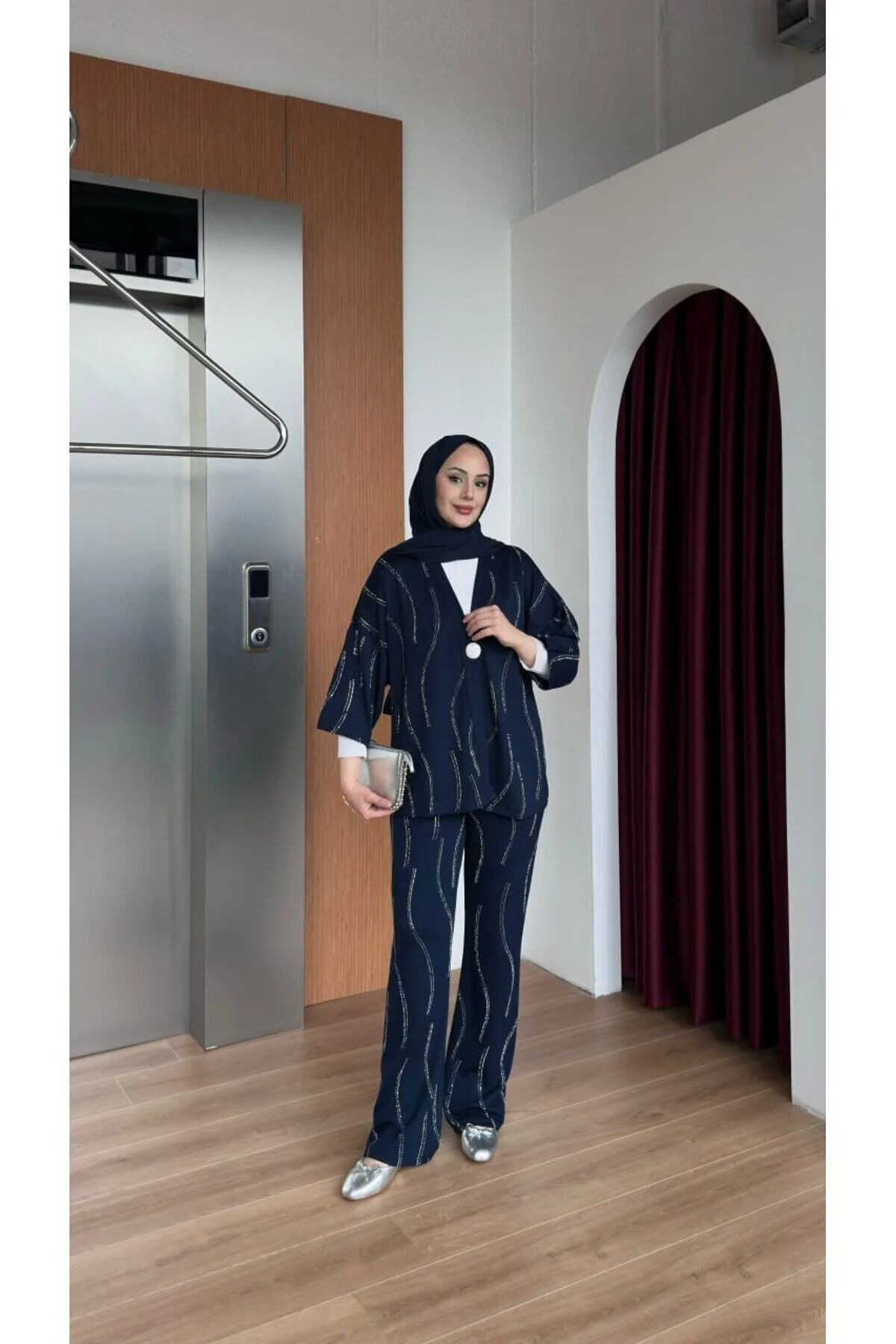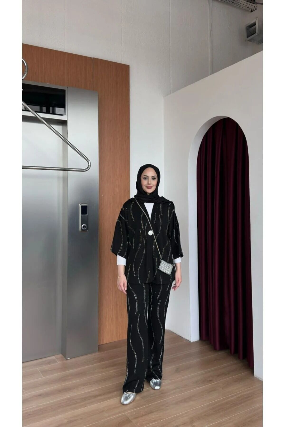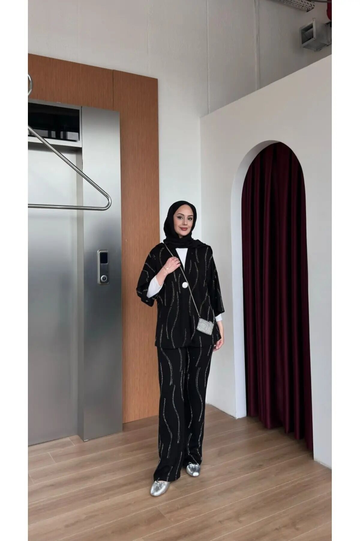 TAŞLI KİMONO TAKIM / TESETTÜR TAKIM 6241 XL - SİYAH