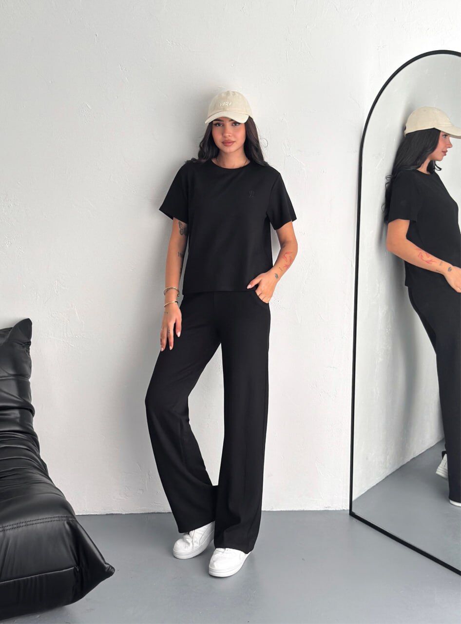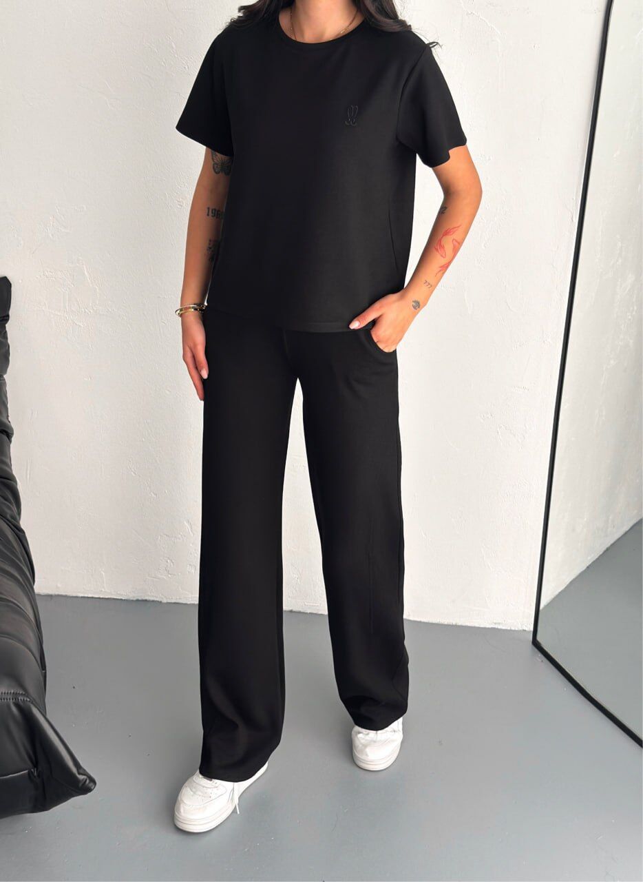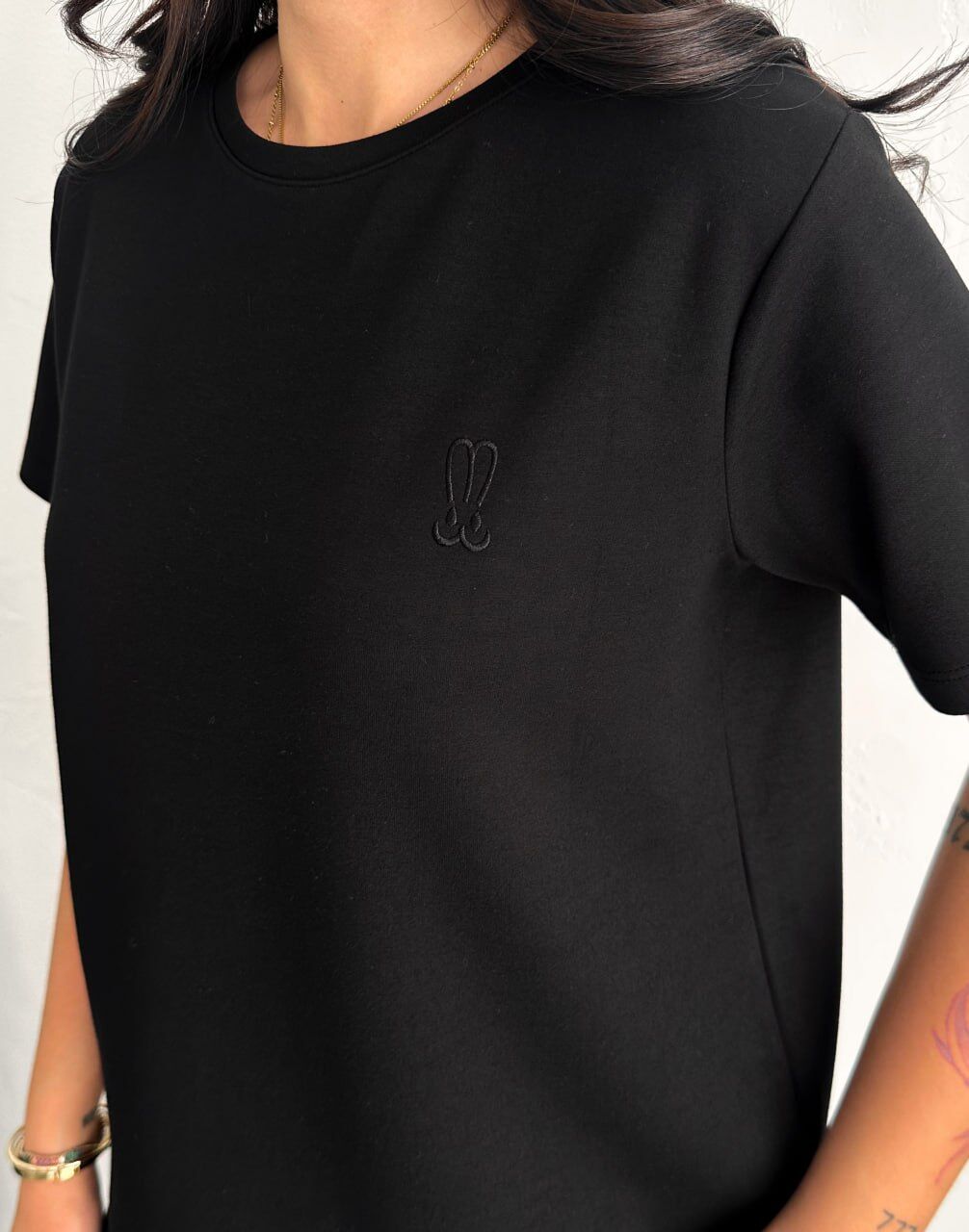 Kadın Tavşan Nakışlı Hafif Baggy Kısa Kollu Günlük Takım 2464 L - SİYAH