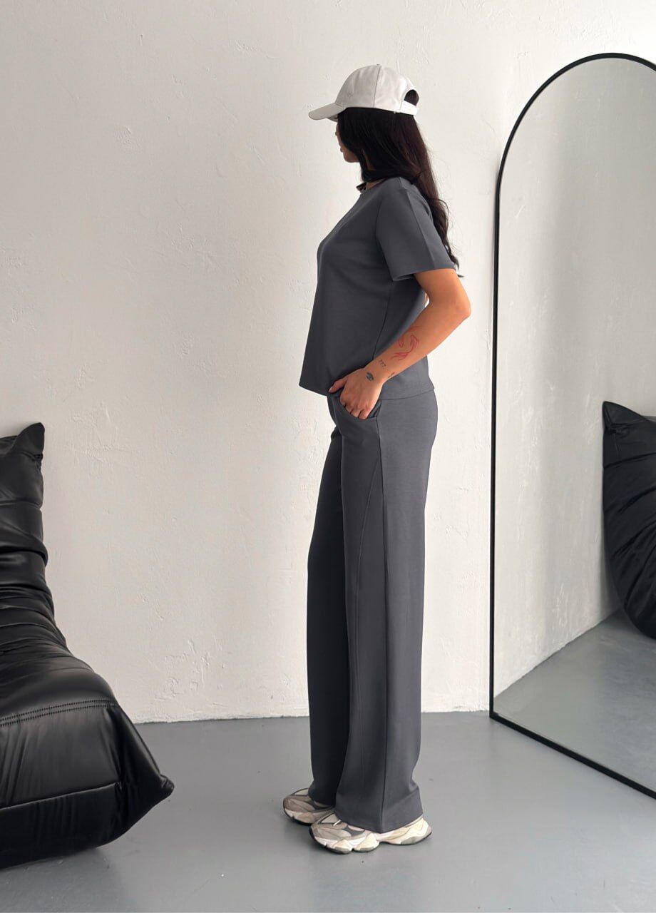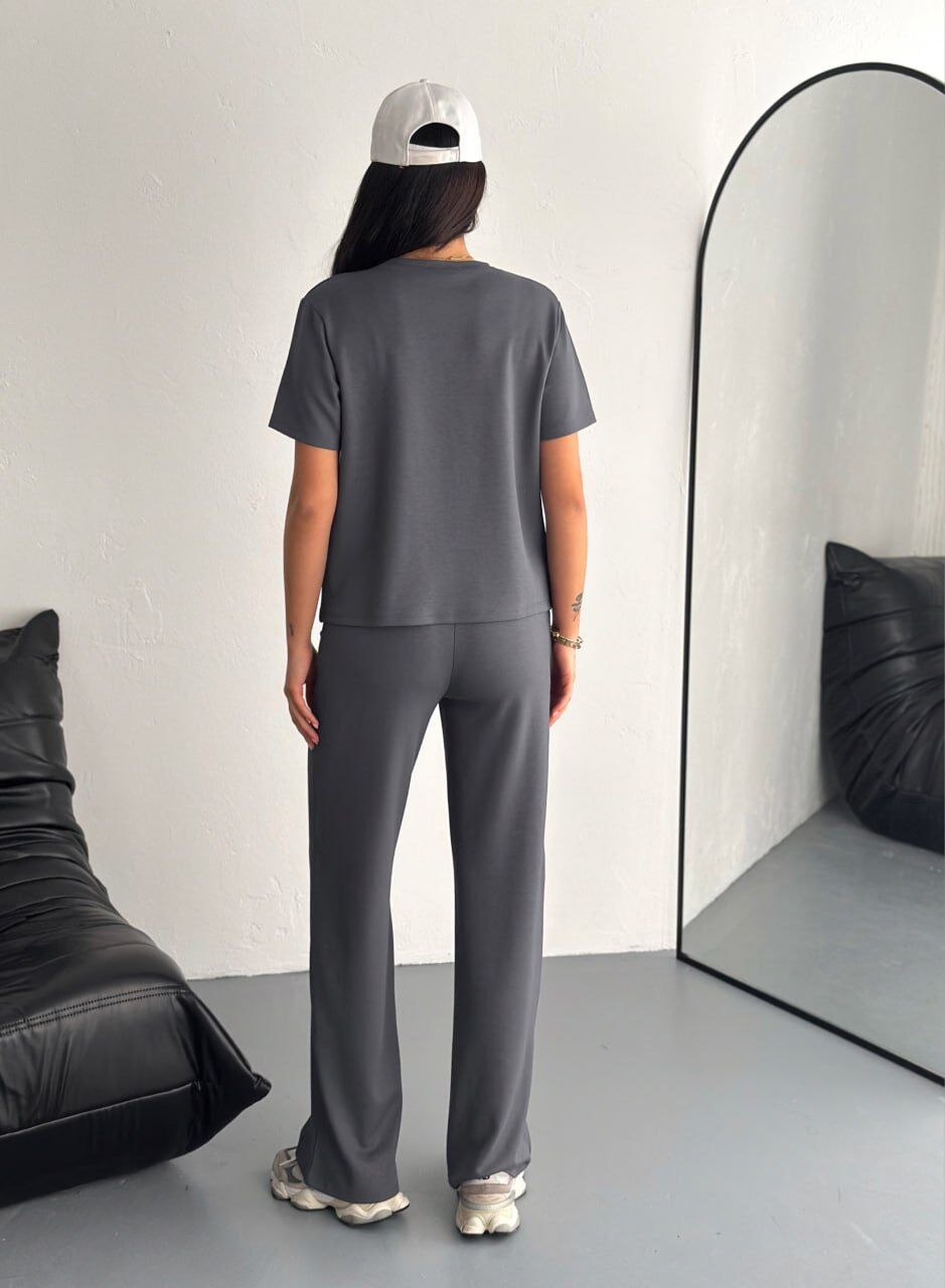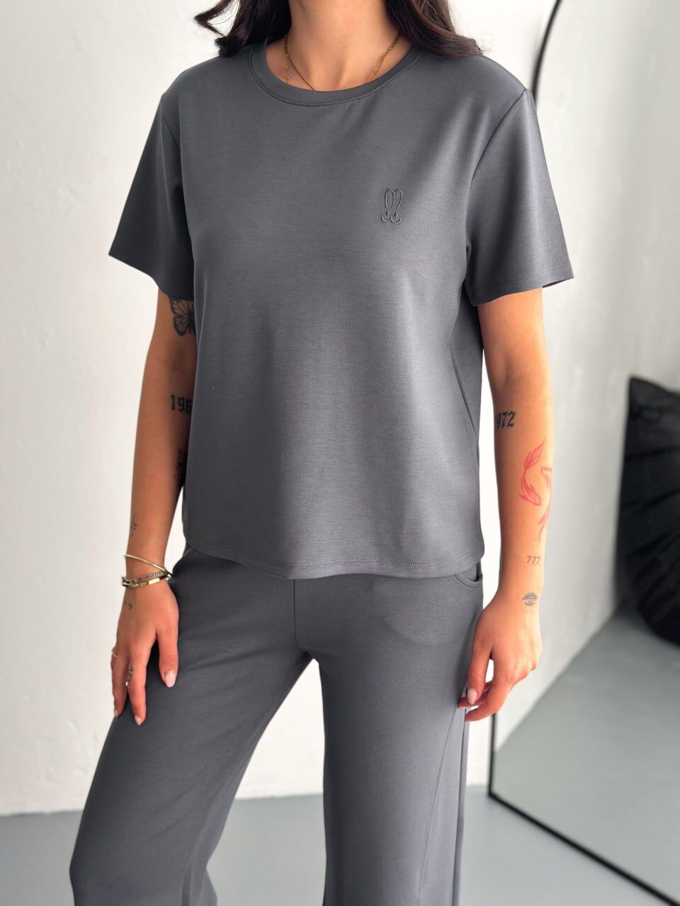 Kadın Tavşan Nakışlı Hafif Baggy Kısa Kollu Günlük Takım 2464 XL - KOYU GRİ