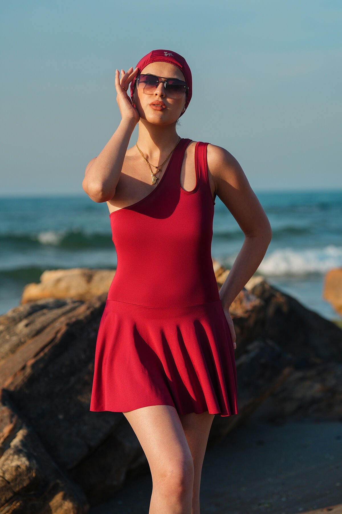 Kadın Tek Omuz İçden Taytlı Tek Taraf Çift Askılı Boneli Elbise Mayo 2XL - BORDO