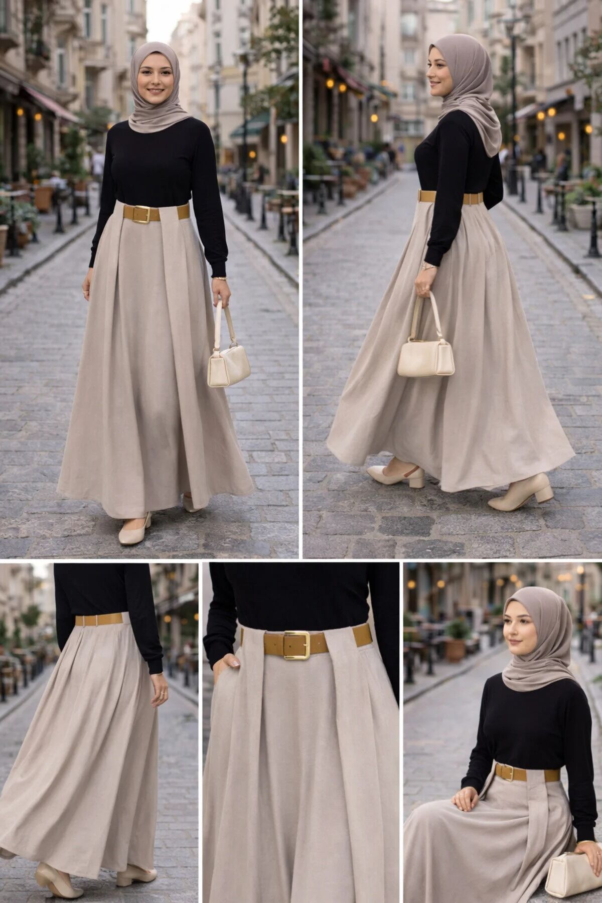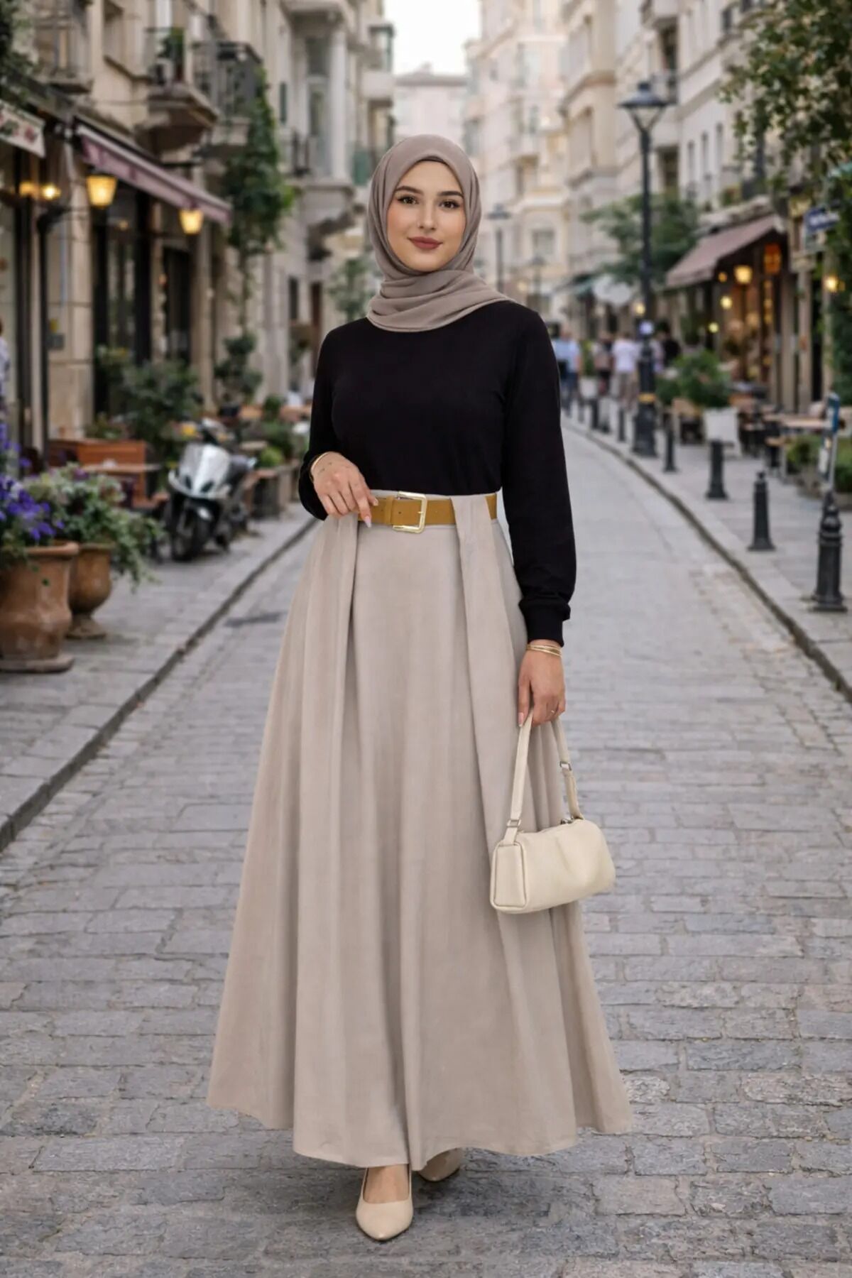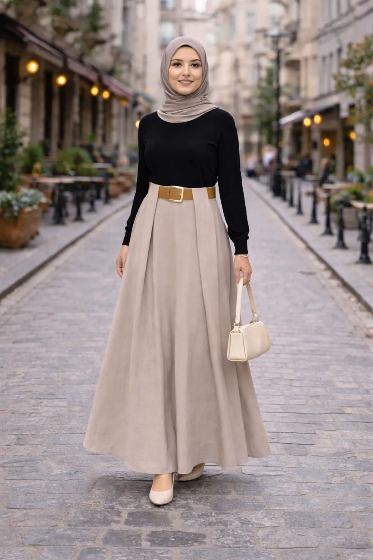 Tesettür Etek-Pileden Kemerli / Dokulu Kumaş Maxi Boy Etek, minimalizmi ve zarafeti bir araya getiren tasarımıyla gardırobunuzun en joker parçası olmaya aday. Siyah rengin asaletini taşıyan bu maxi boy etek, çan kalıbı ve kloş silueti sayesinde her adımda modern bir akış sergiler.