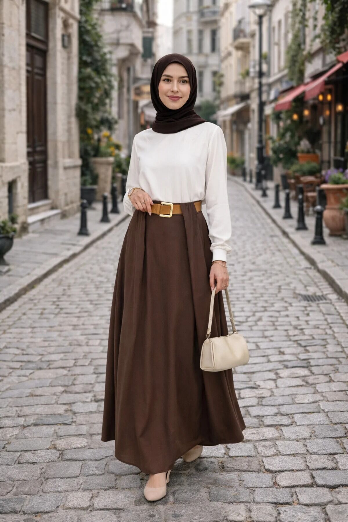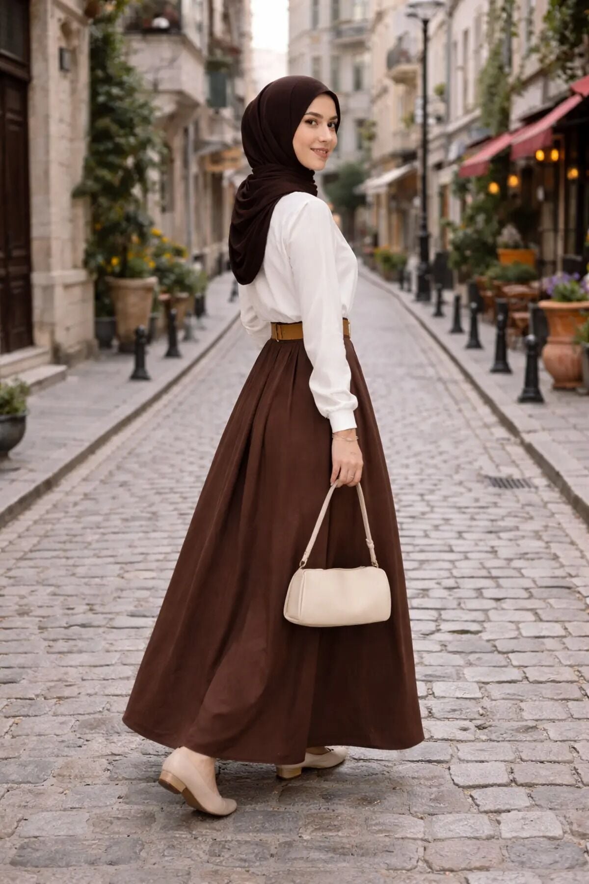 TESETTÜR ETEK-PİLEDEN KEMERLİ / DOKULU KUMAŞ MAXİ BOY ETEK 6242 XL - KAHVE