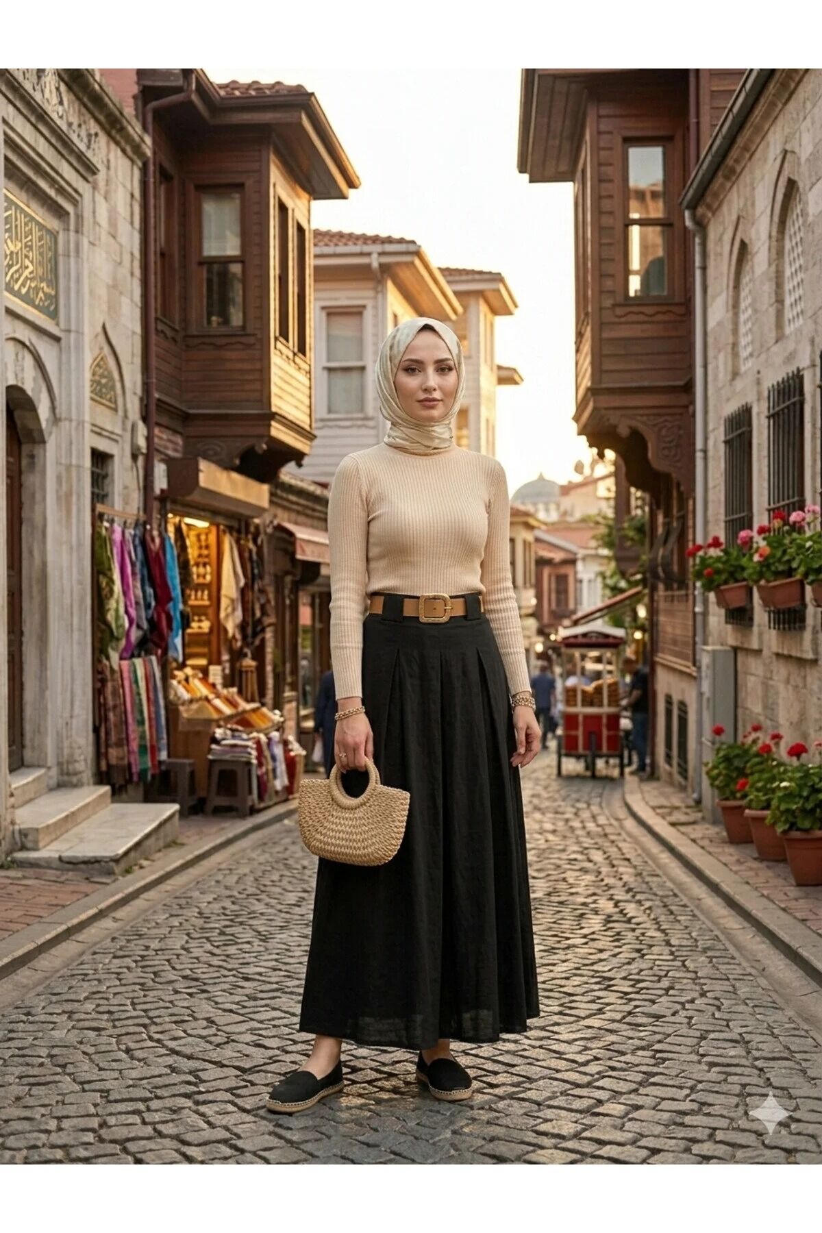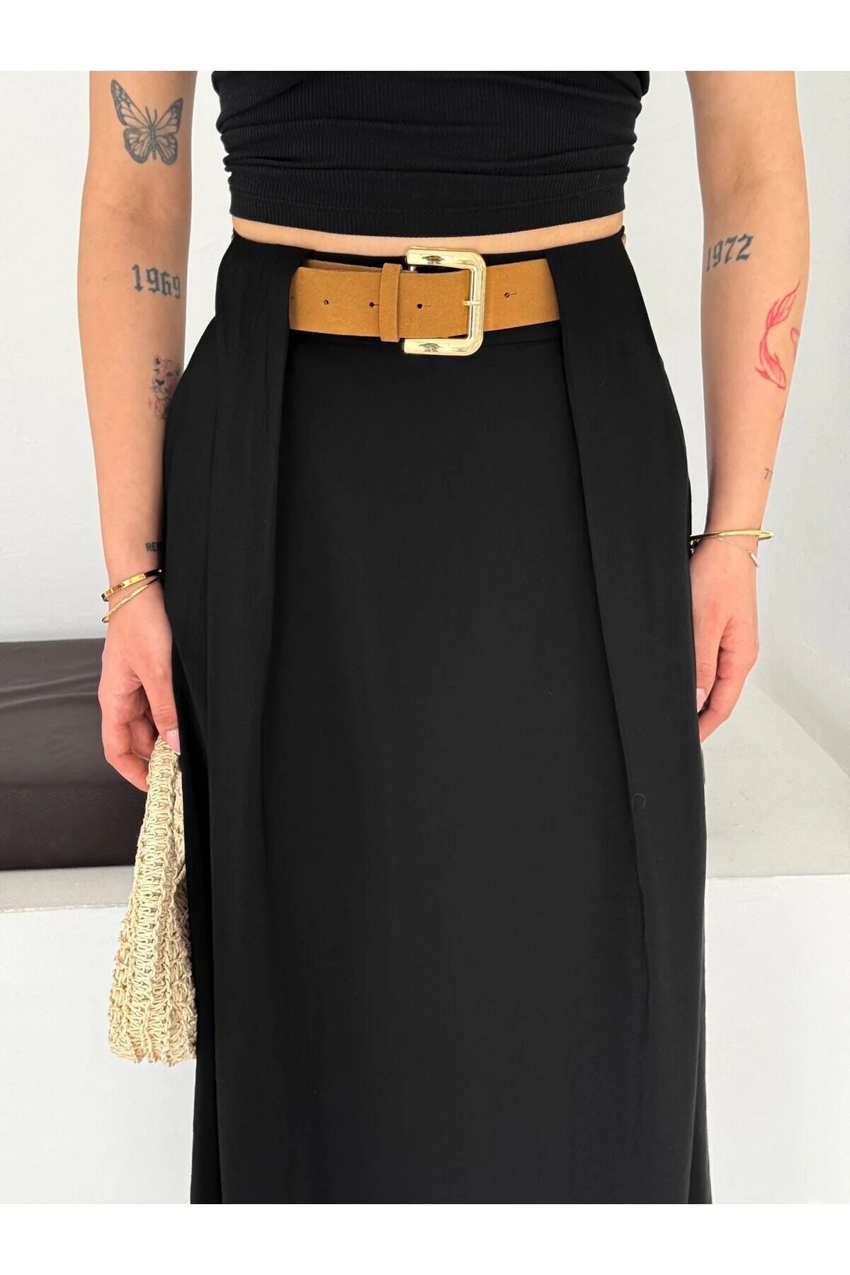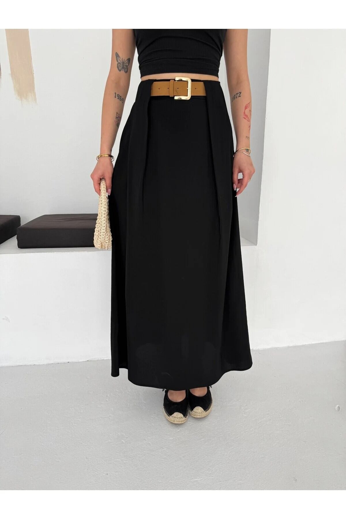 Tesettür Etek-Pileden Kemerli / Dokulu Kumaş Maxi Boy Etek, minimalizmi ve zarafeti bir araya getiren tasarımıyla gardırobunuzun en joker parçası olmaya aday. Siyah rengin asaletini taşıyan bu maxi boy etek, çan kalıbı ve kloş silueti sayesinde her adımda modern bir akış sergiler.