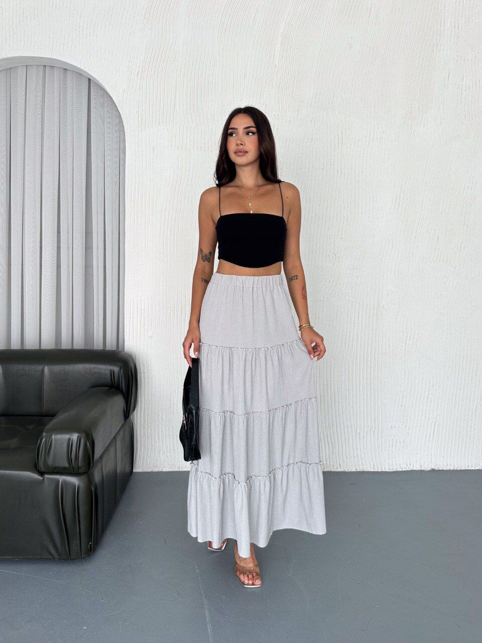 Kadın 97cm Fırfırlı Kat Model Tam Boy Maxi Etek S - GRİ