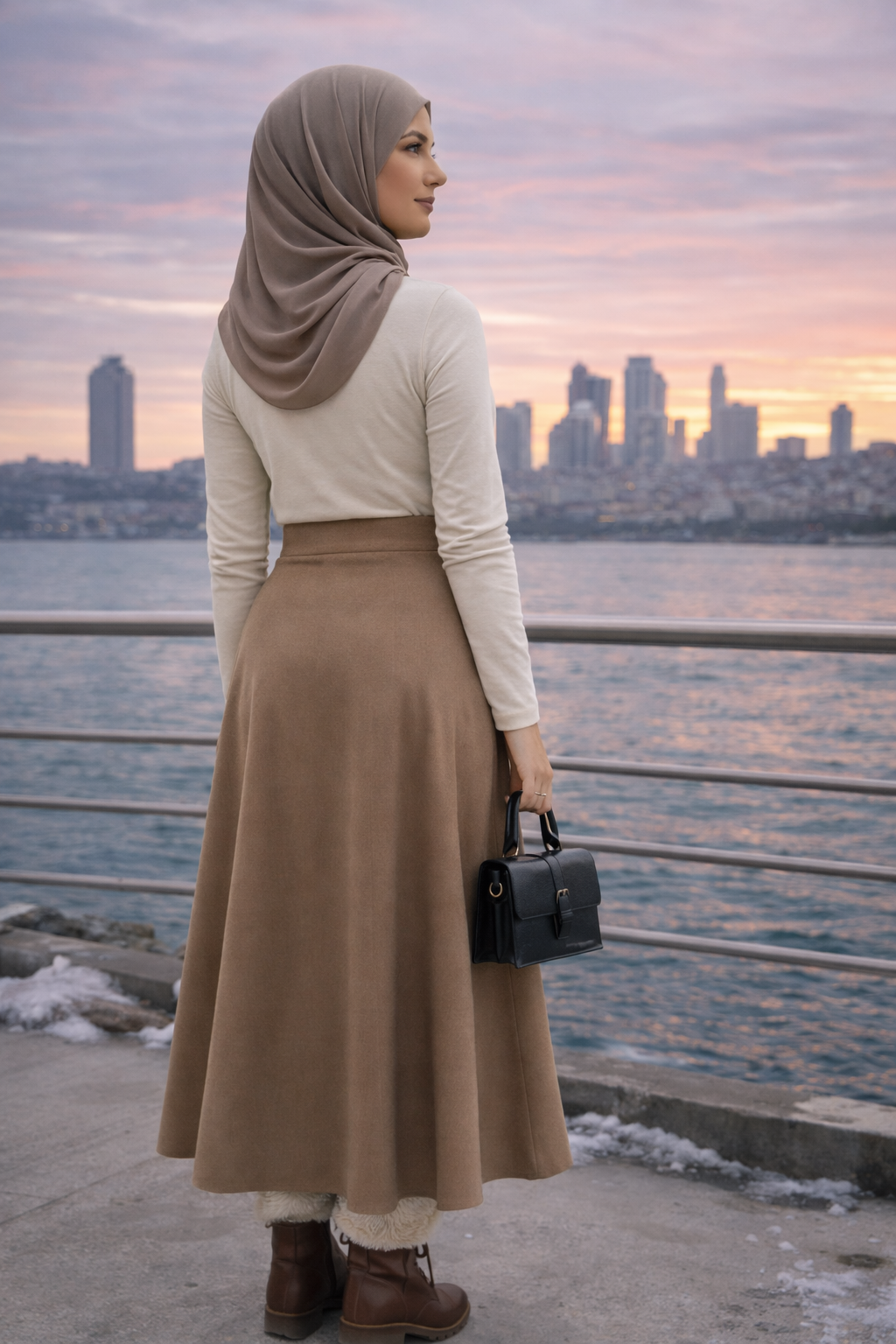 Orta kalınlıkta süet kumaştan üretilen kloş etek, modern tasarımı ve zarif duruşuyla günlük ve tesettür kombinlerinde tercih edilen şık bir modeldir. 90 cm uzun boy ölçüsü ile hem modern hem de feminen bir görünüm sunar. Tam beden ölçülerinde üretildiği için kendi bedeninizi gönül rahatlığıyla tercih edebilirsiniz. Likralı süet kumaşı yumuşak dokusuyla teninizi rahatsız etmezken esnek yapısıyla gün boyu konfor sağlar. Astarsız ve cepsiz tasarımı eteğin zarif hatlarını öne çıkarır. Lastikli kapama şekli kolay kullanım sağlarken vücuda mükemmel uyum sunar. Tüm sezonlarda giyime uygun olan bu uzun süet kloş etek, mevsim geçişlerinde de rahatlıkla kombinlenebilir. Winmoda tarafından satışa sunulan bu model; sadelik, konfor ve şıklığı bir araya getiren zamansız bir parçadır. Süet dokuma tipi eteğin premium görünümünü artırırken, iç göstermeyen yapısı güvenli kullanım sunar.