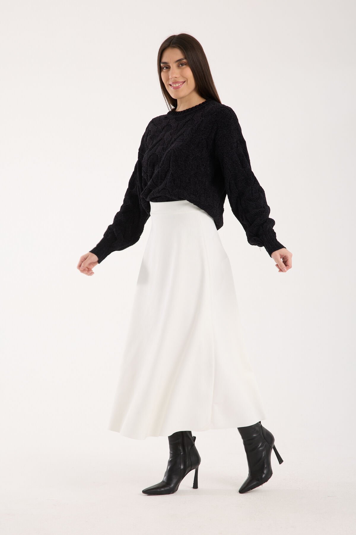 Orta kalınlıkta süet kumaştan üretilen kloş etek, modern tasarımı ve zarif duruşuyla günlük ve tesettür kombinlerinde tercih edilen şık bir modeldir. 90 cm uzun boy ölçüsü ile hem modern hem de feminen bir görünüm sunar. Tam beden ölçülerinde üretildiği için kendi bedeninizi gönül rahatlığıyla tercih edebilirsiniz. Likralı süet kumaşı yumuşak dokusuyla teninizi rahatsız etmezken esnek yapısıyla gün boyu konfor sağlar. Astarsız ve cepsiz tasarımı eteğin zarif hatlarını öne çıkarır. Lastikli kapama şekli kolay kullanım sağlarken vücuda mükemmel uyum sunar. Tüm sezonlarda giyime uygun olan bu uzun süet kloş etek, mevsim geçişlerinde de rahatlıkla kombinlenebilir. Winmoda tarafından satışa sunulan bu model; sadelik, konfor ve şıklığı bir araya getiren zamansız bir parçadır. Süet dokuma tipi eteğin premium görünümünü artırırken, iç göstermeyen yapısı güvenli kullanım sunar.