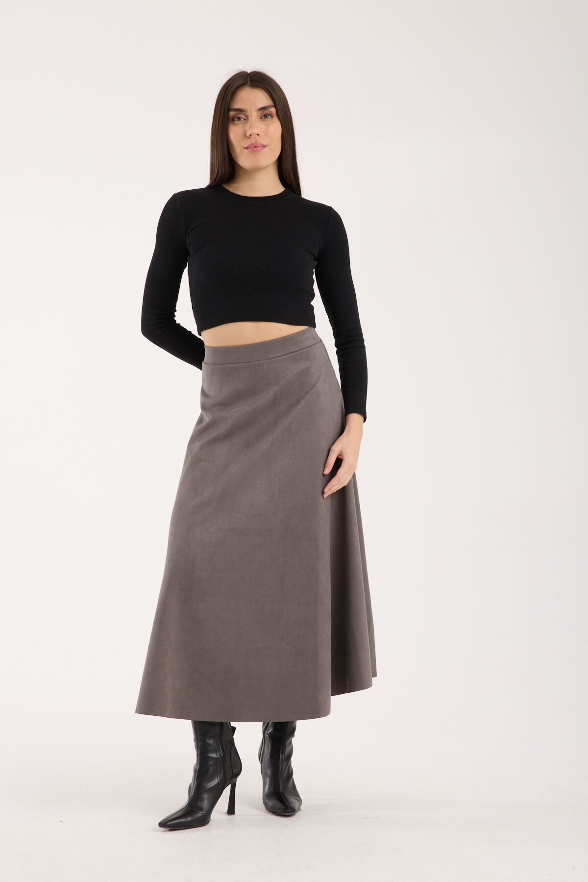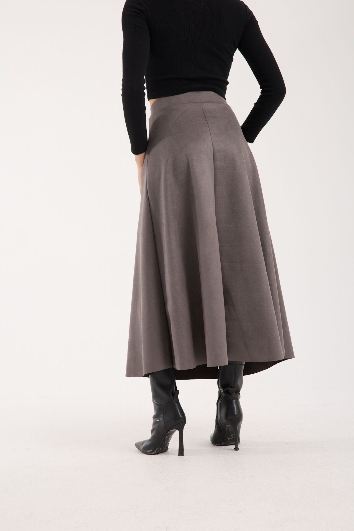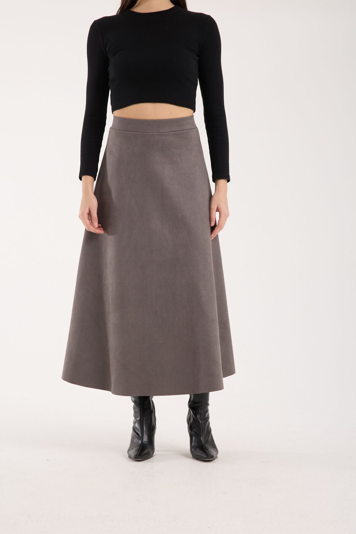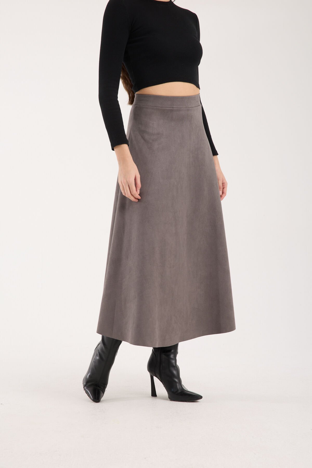 Kadın 90cm Uzun Tam Boy Kloş Süet Etek 2426 XL - GRİ
