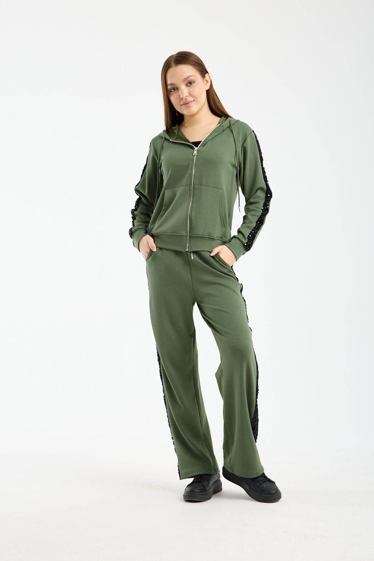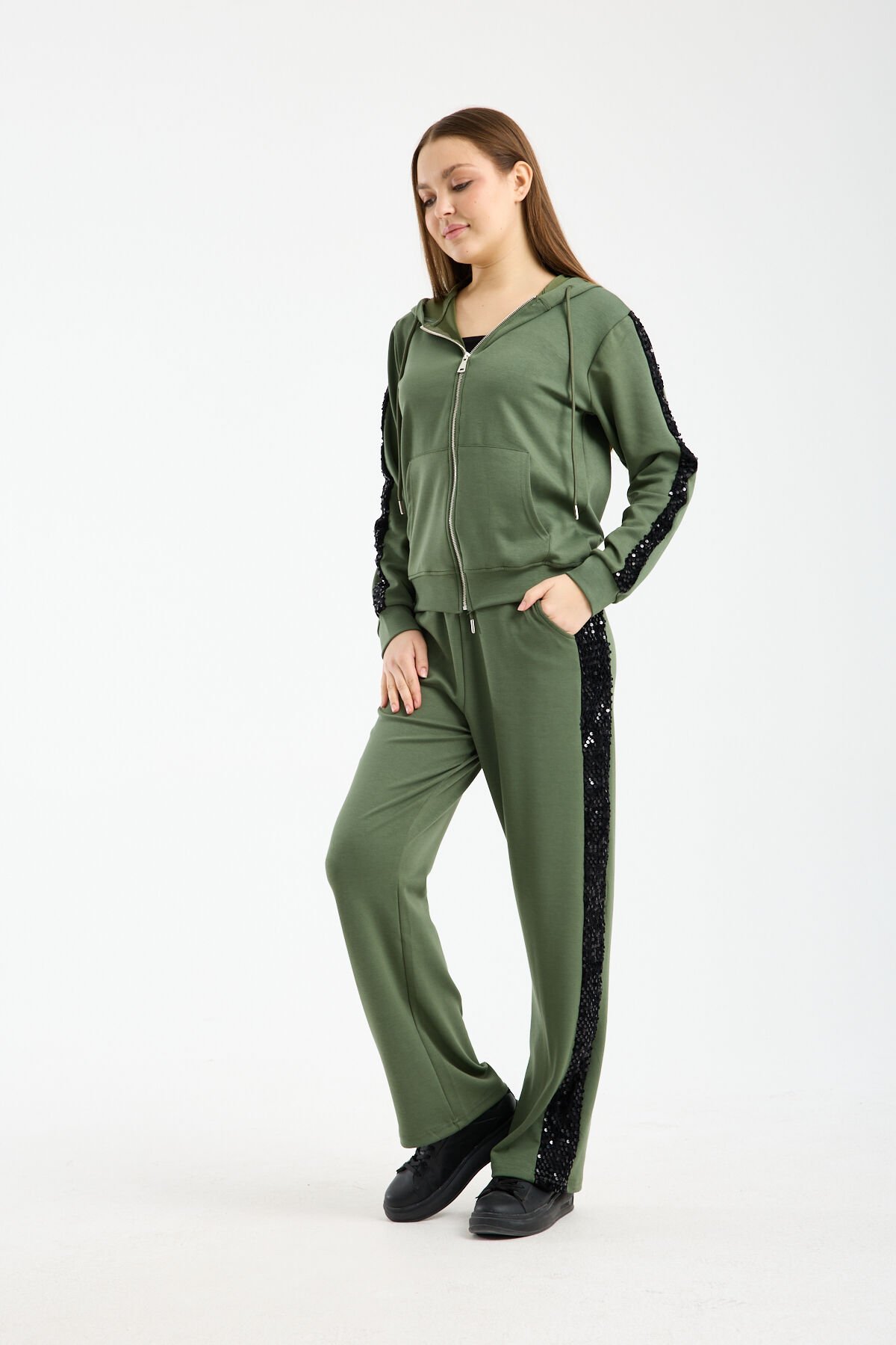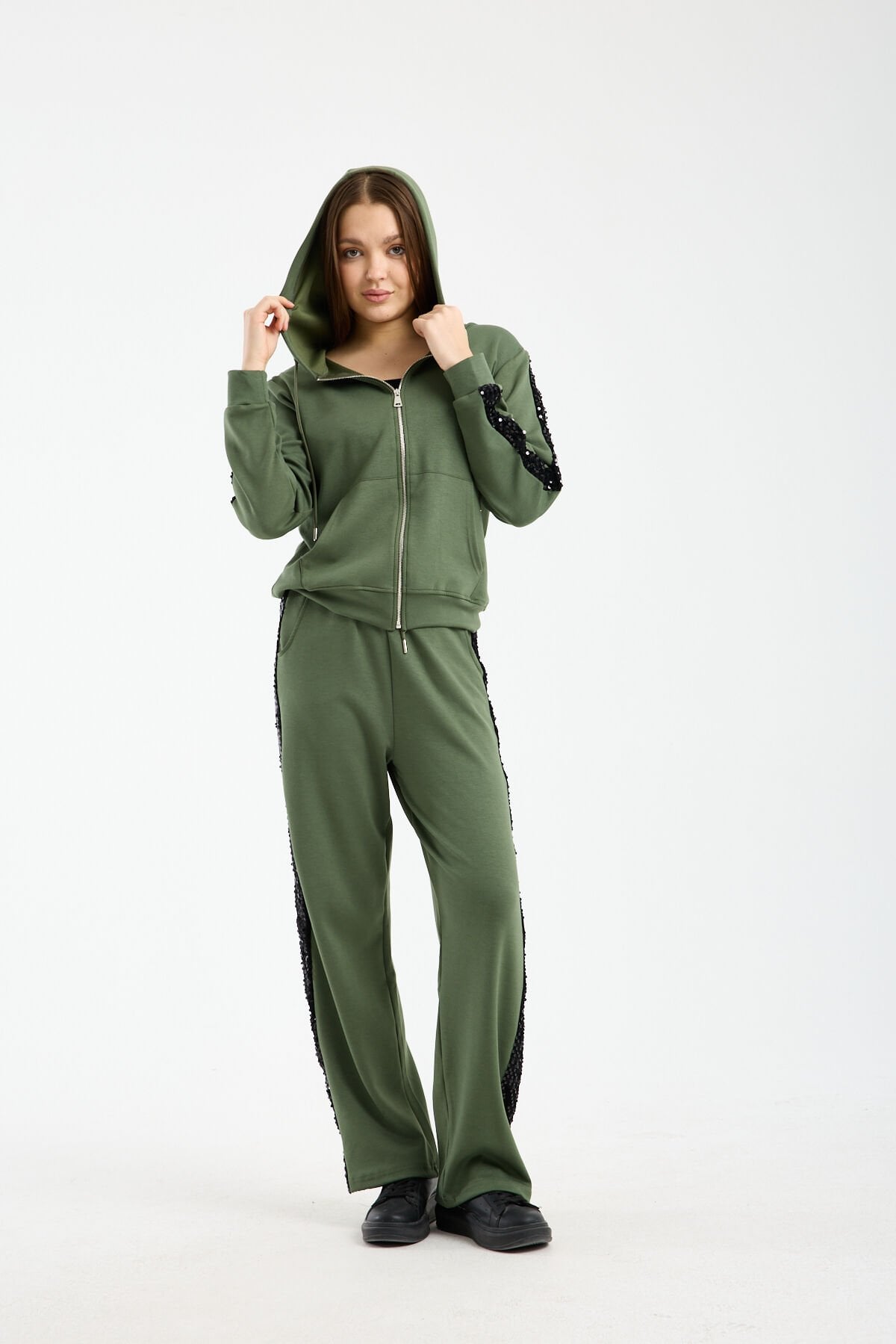 Relaxed kalıp yapısı ve geniş paça formu sayesinde özgür hareket imkânı tanıyan bu payetli kadın eşofman takımı, gün boyu rahatlık sağlar. Yüksek bel pantolon tasarımı vücut oranını dengelerken beli sıkmadan konfor sunar. Kapüşonlu ve fermuarlı sweatshirt formu ise sportif ve fonksiyonel bir kullanım sağlar.