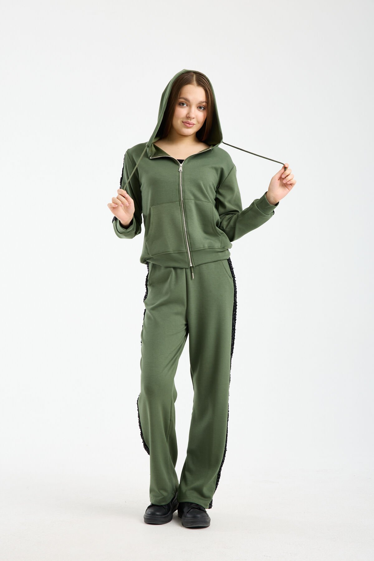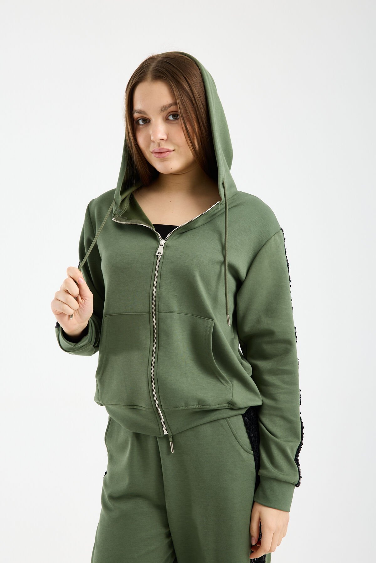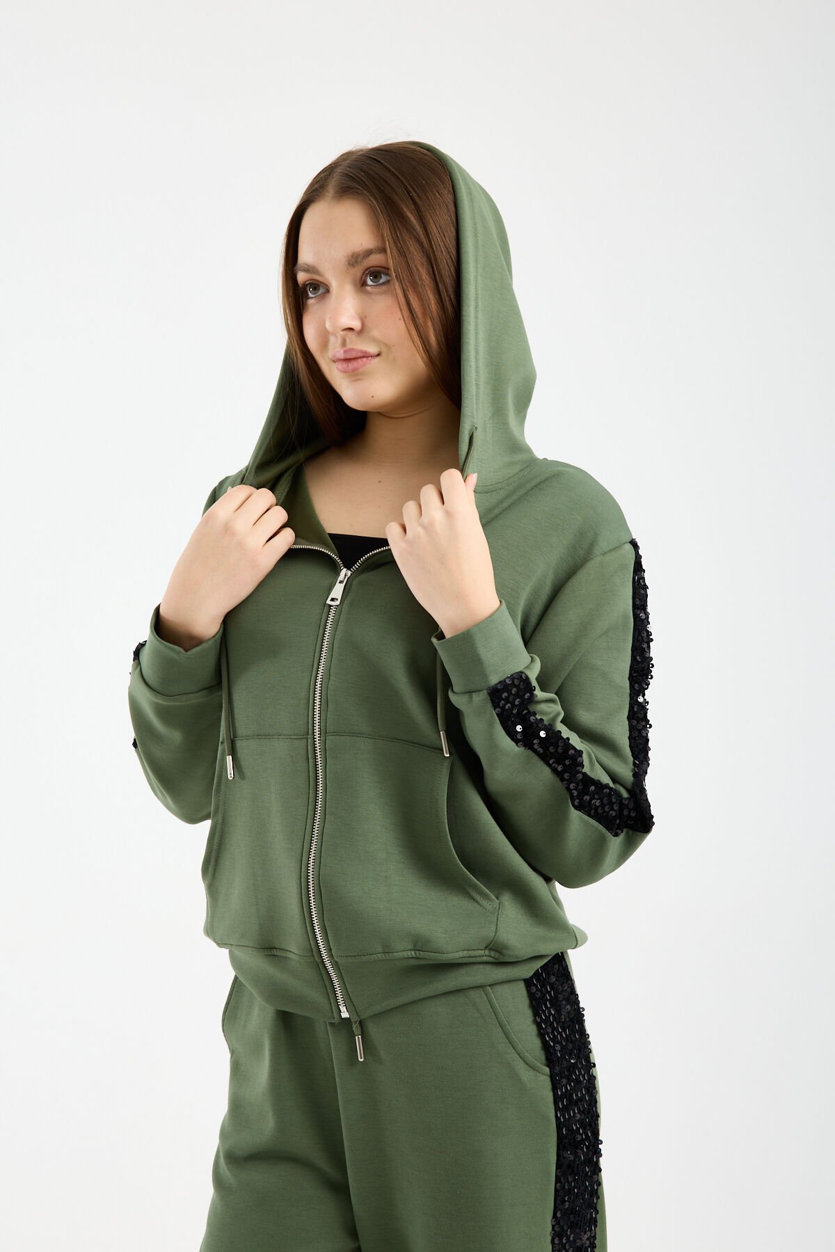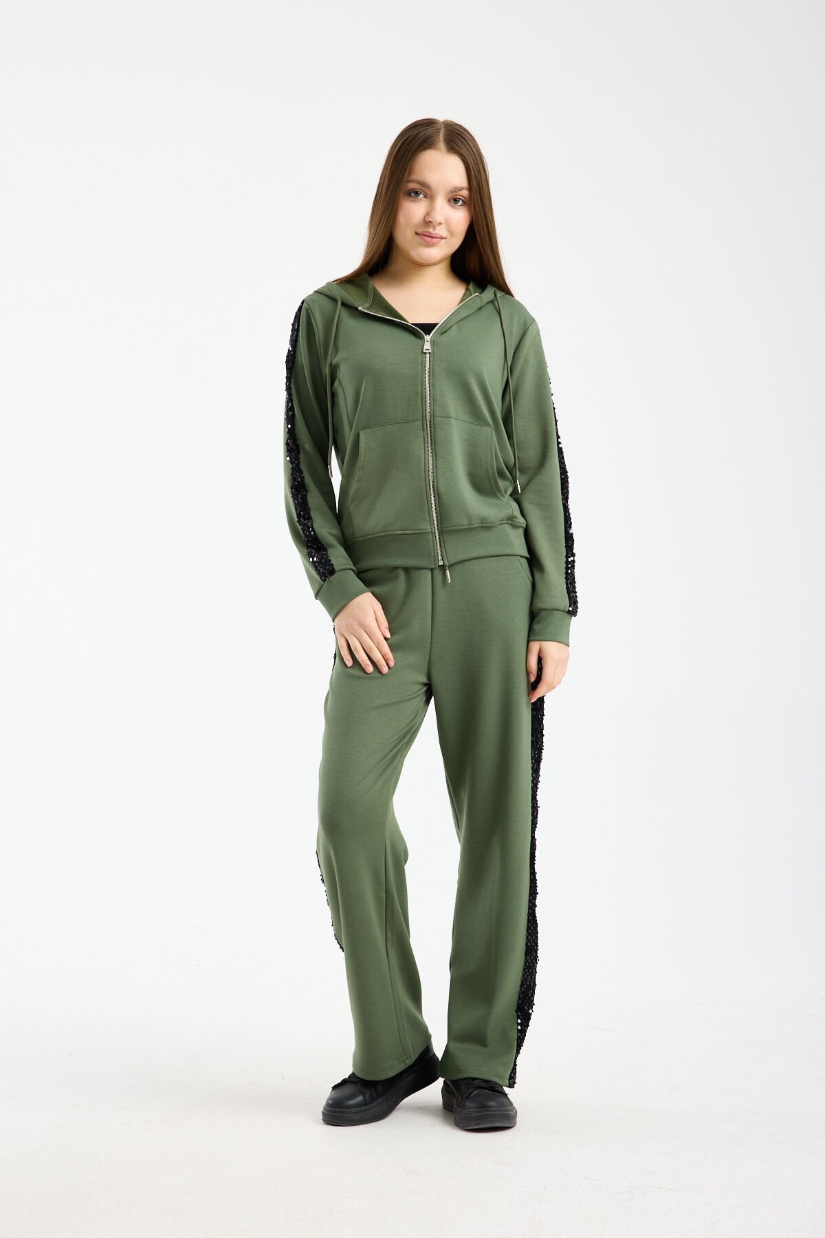 Relaxed kalıp yapısı ve geniş paça formu sayesinde özgür hareket imkânı tanıyan bu payetli kadın eşofman takımı, gün boyu rahatlık sağlar. Yüksek bel pantolon tasarımı vücut oranını dengelerken beli sıkmadan konfor sunar. Kapüşonlu ve fermuarlı sweatshirt formu ise sportif ve fonksiyonel bir kullanım sağlar.