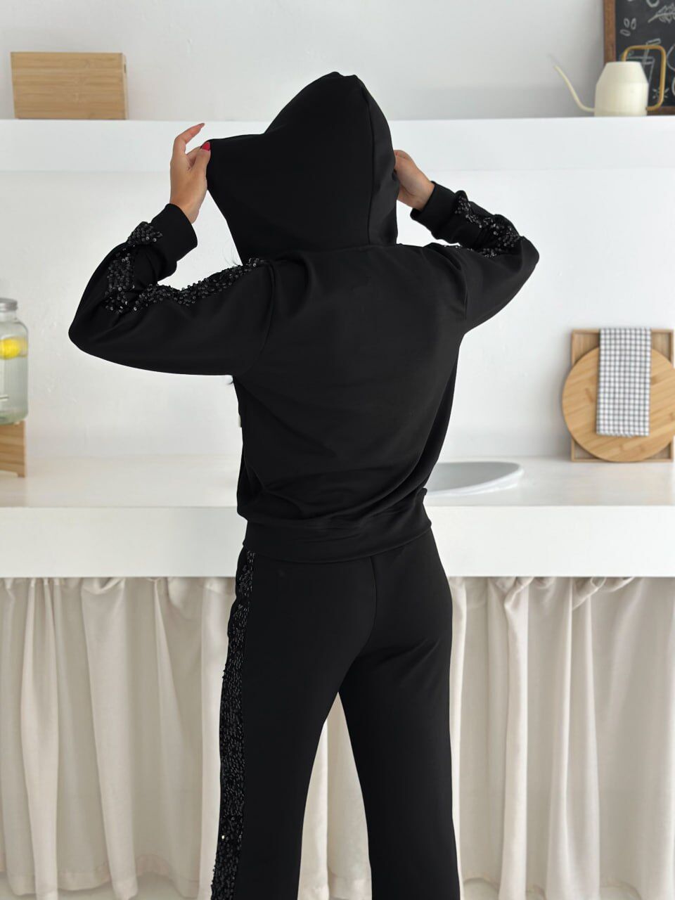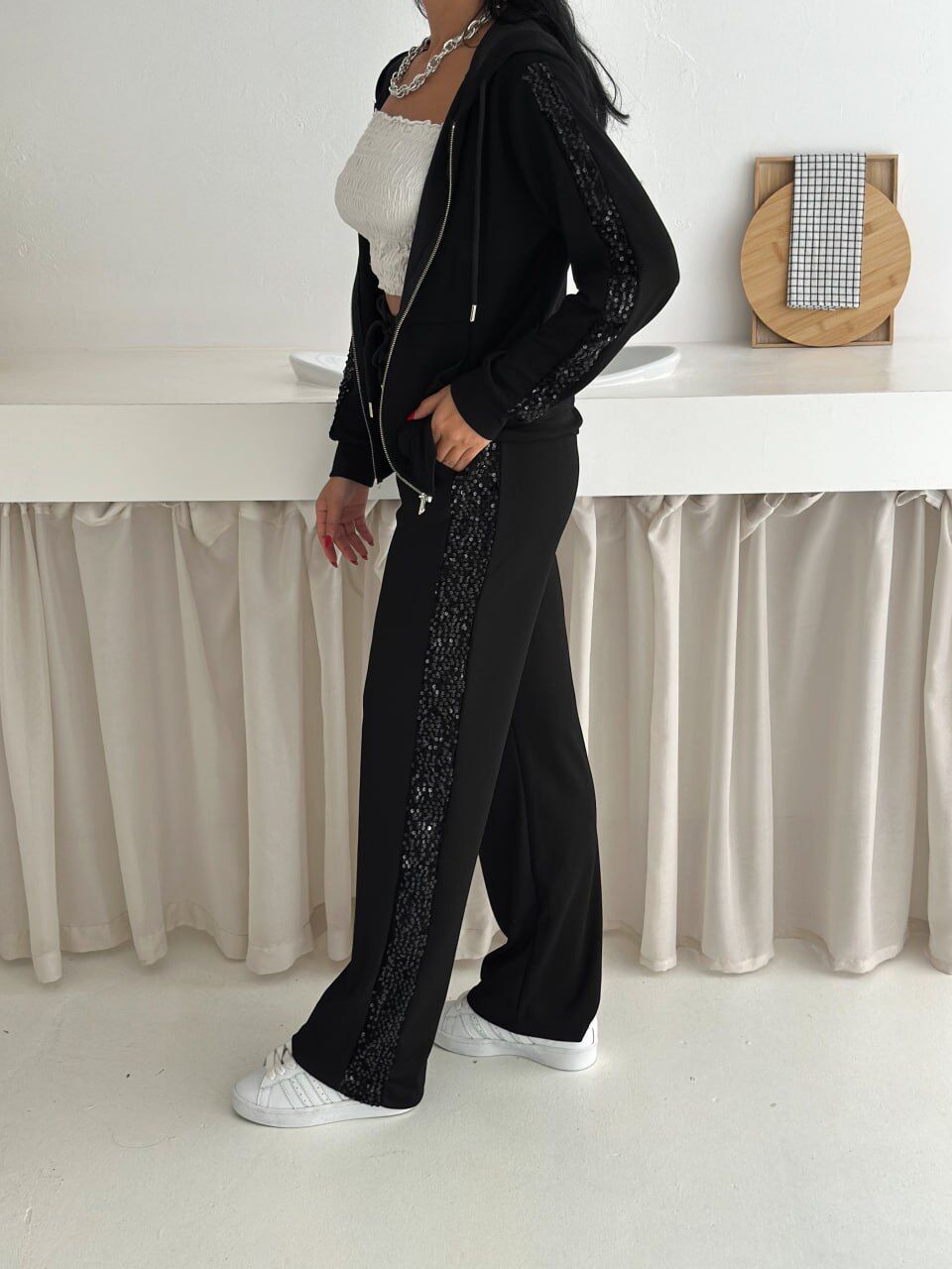 Relaxed kalıp yapısı ve geniş paça formu sayesinde özgür hareket imkânı tanıyan bu payetli kadın eşofman takımı, gün boyu rahatlık sağlar. Yüksek bel pantolon tasarımı vücut oranını dengelerken beli sıkmadan konfor sunar. Kapüşonlu ve fermuarlı sweatshirt formu ise sportif ve fonksiyonel bir kullanım sağlar.
