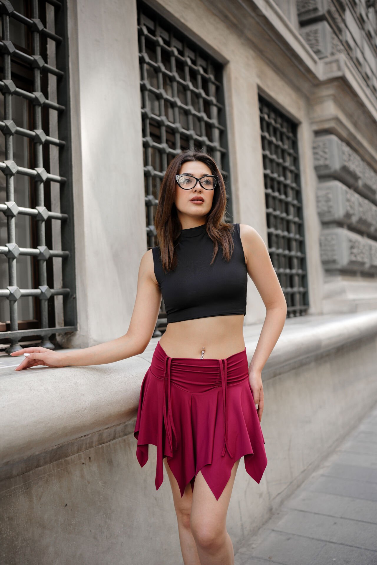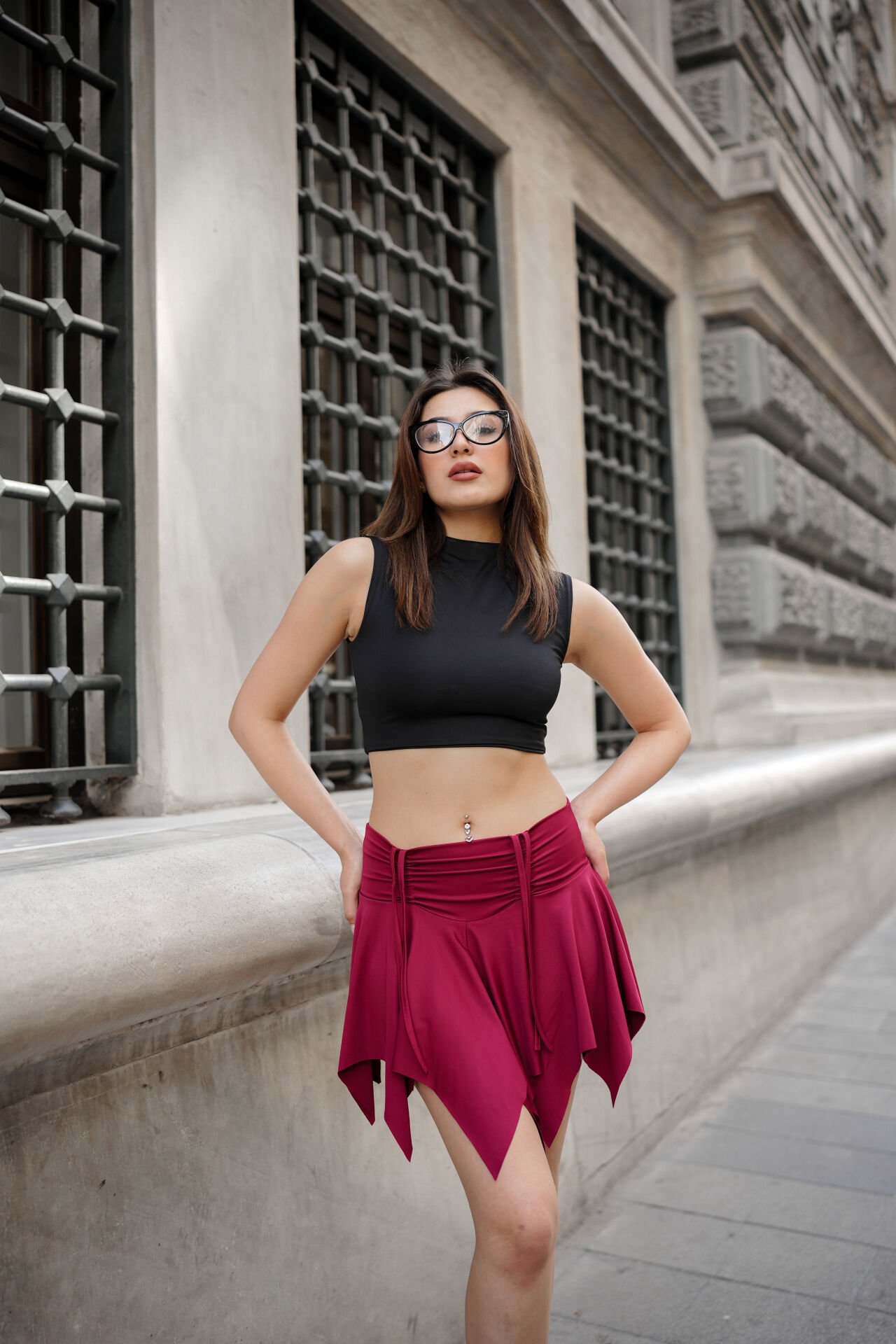 Yüksek belli formu, bel kısmındaki ayarlanabilir büzgü detayı ile desteklenmiştir. Bel yüksekliğini büzerek dilediğiniz gibi yüksek bel veya orta bel şeklinde kullanabilirsiniz. Mini boy ve asimetrik kesim, feminen hatları ön plana çıkarırken trend bir siluet oluşturur. İç kısmı taytlı yapıdadır; bu sayede özellikle plajda, yürüyüşte veya günlük kullanımda özgürce hareket etmenizi sağlar.