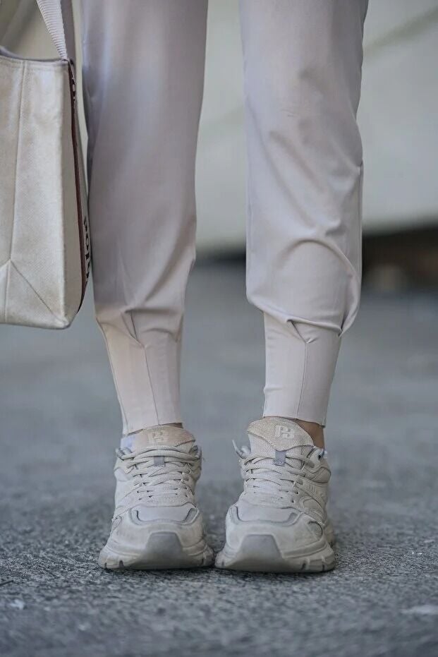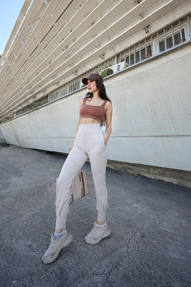 Kadın Yazlık Scuba Dalgıç 8Cm Lastik Kemerli Paça Pile Detaylı Eşofman Altı WM S - BEJ